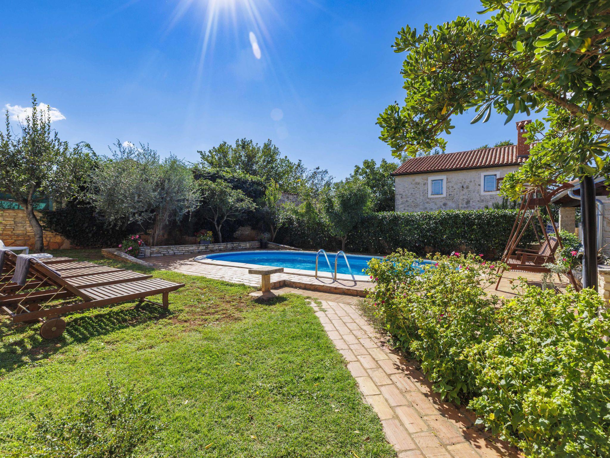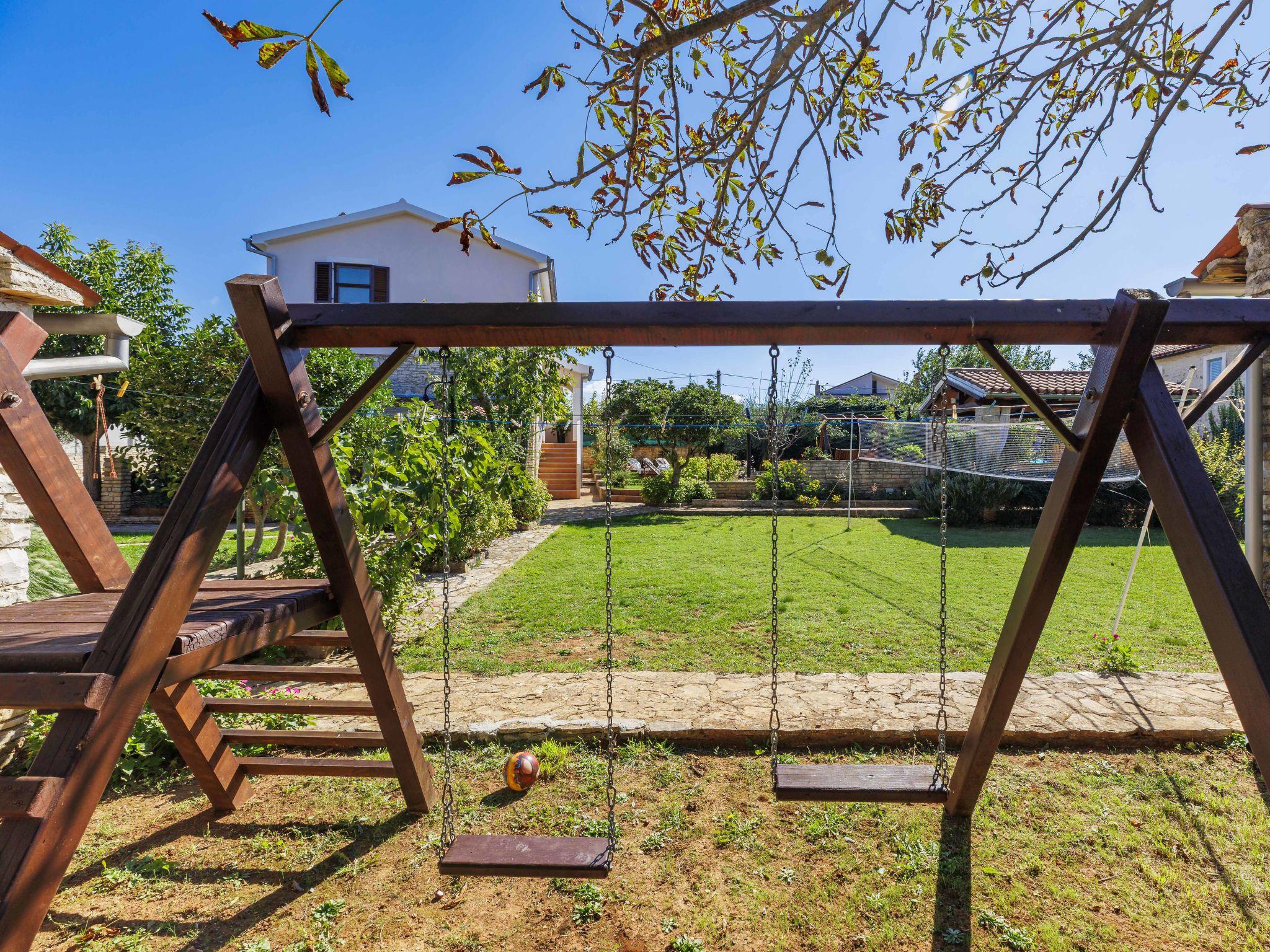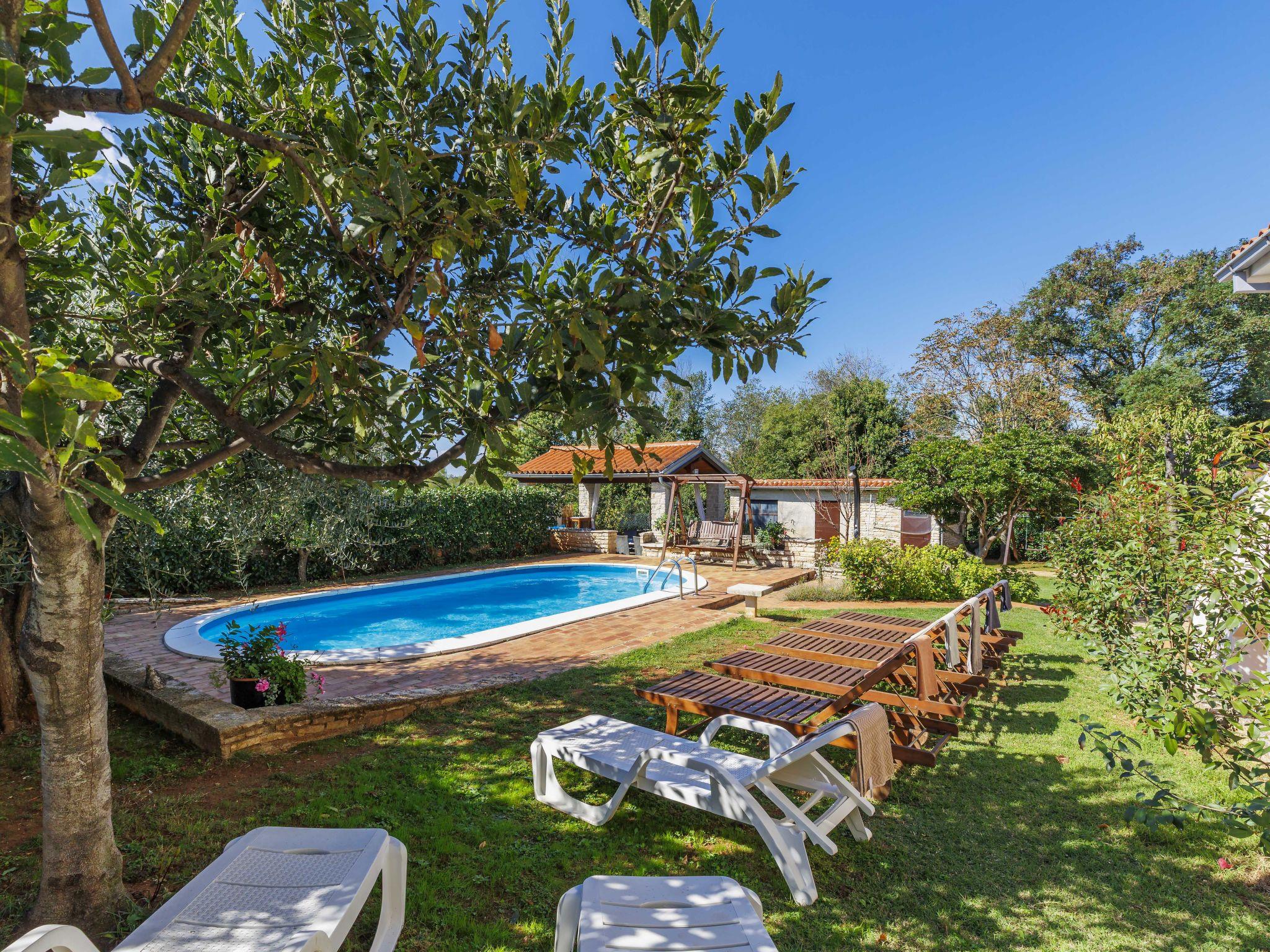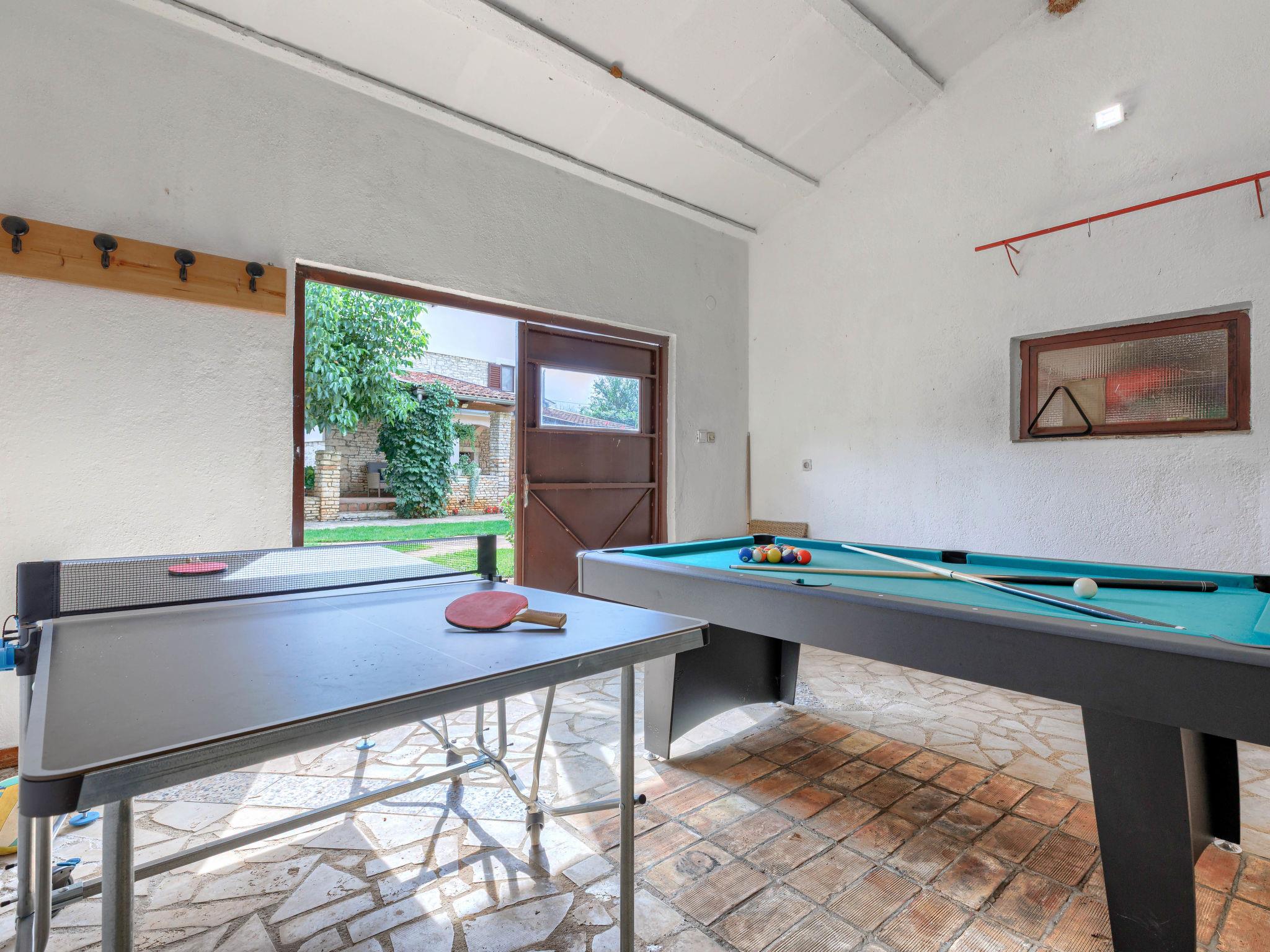 Semi-detached house "Mauro", 3 storeys. In the hamlet Kacana 3 km from the centre of Vodnjan, 10 km from the centre of Pula, 8.5 km from the sea. Private: property 1'500 m2 (fenced), garden with wildlife garden and trees, swimming pool (32 m2, depth 140 cm, seasonal availability: 01.May. - 15.Oct.). Outdoor shower, table tennis, badminton, terrace (20 m2), garden furniture, barbecue house (swing), pool maintenance by the owner/gardener. In the house: internet access, billiard table, table football, washing machine. Parking (for 3 cars) at the house on the premises. Shop 3 km, shopping centre 4 km, restaurant 3 km, café 3 km, bus stop 2.5 km, pebble beach 8.5 km.