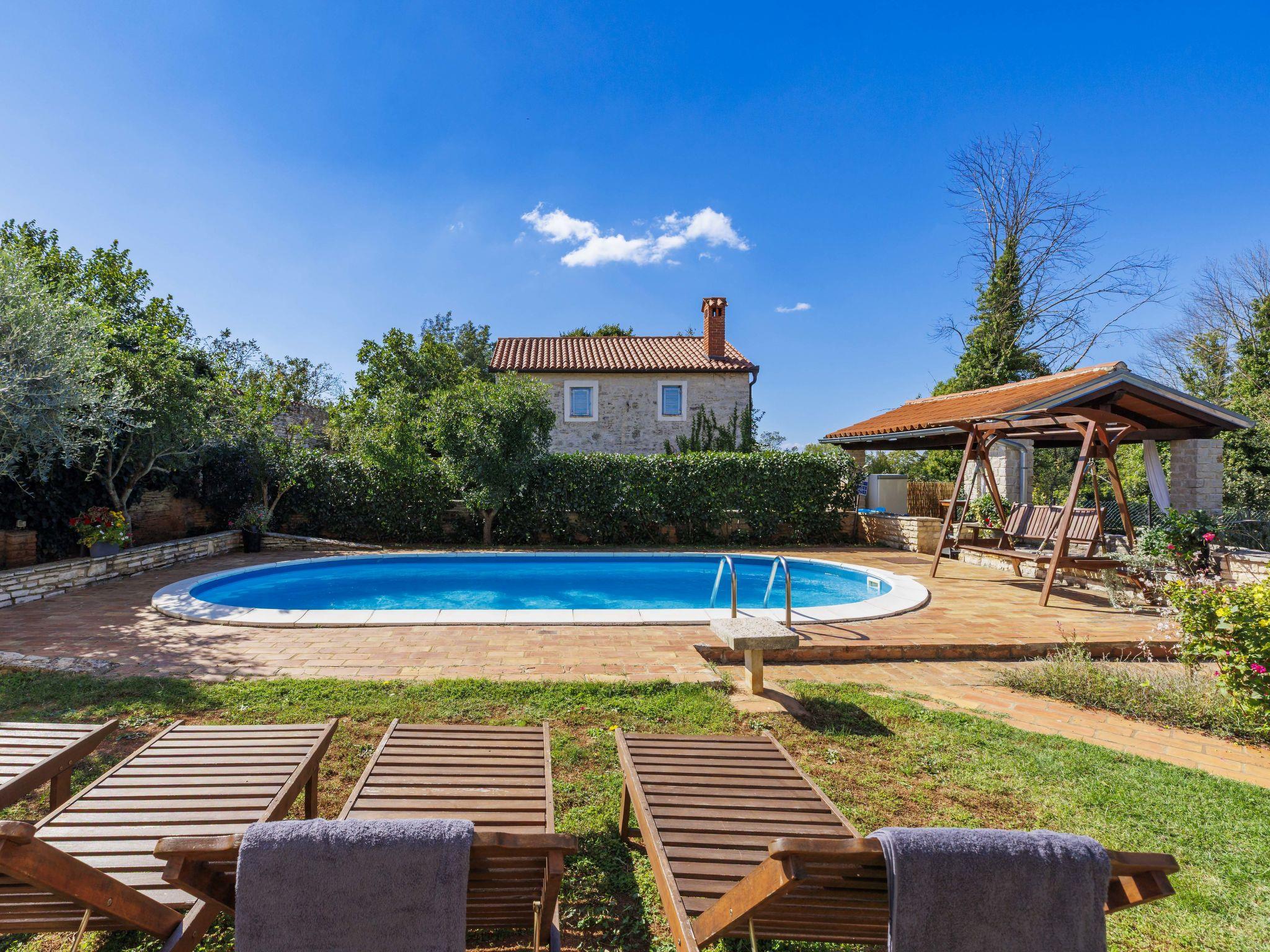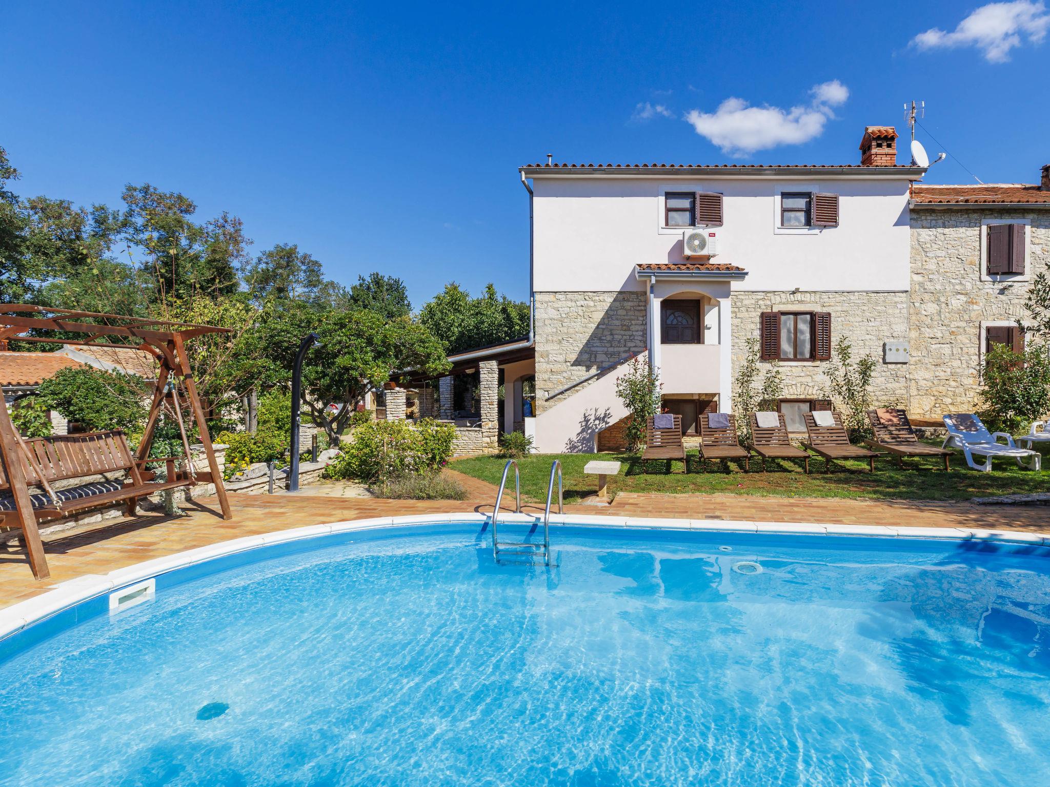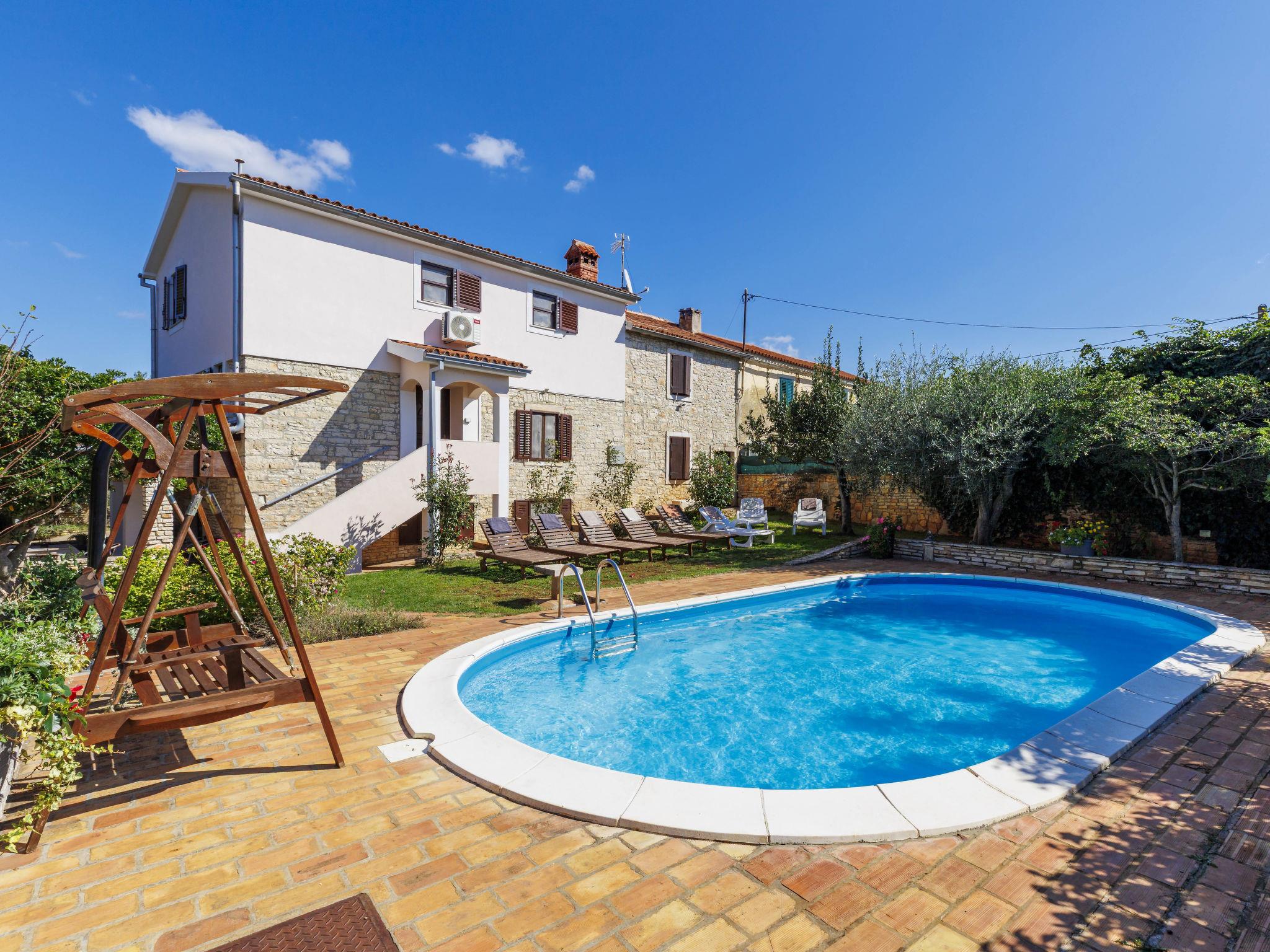 Semi-detached house "Mauro", 3 storeys. In the hamlet Kacana 3 km from the centre of Vodnjan, 10 km from the centre of Pula, 8.5 km from the sea. Private: property 1'500 m2 (fenced), garden with wildlife garden and trees, swimming pool (32 m2, depth 140 cm, seasonal availability: 01.May. - 15.Oct.). Outdoor shower, table tennis, badminton, terrace (20 m2), garden furniture, barbecue house (swing), pool maintenance by the owner/gardener. In the house: internet access, billiard table, table football, washing machine. Parking (for 3 cars) at the house on the premises. Shop 3 km, shopping centre 4 km, restaurant 3 km, café 3 km, bus stop 2.5 km, pebble beach 8.5 km.