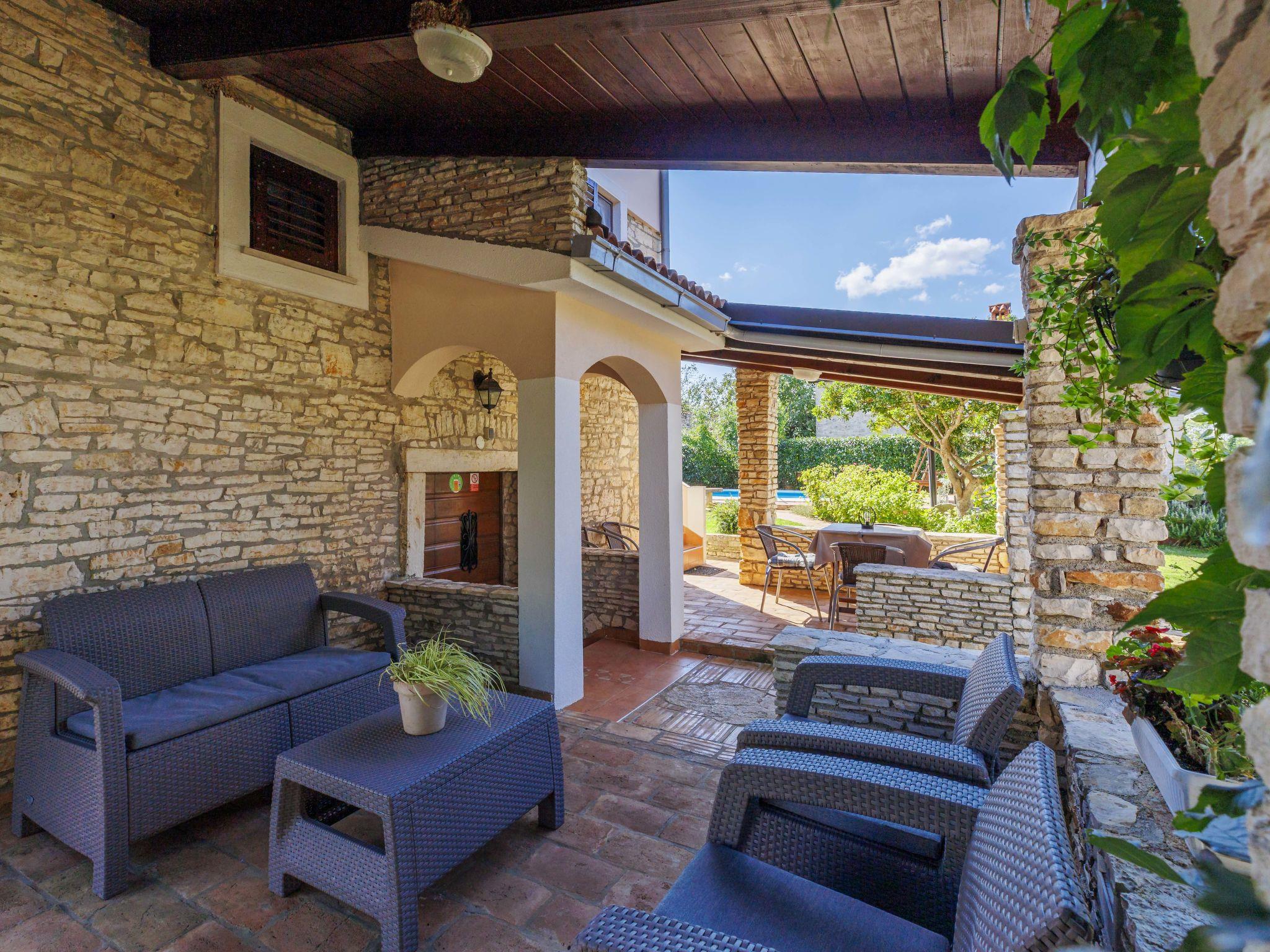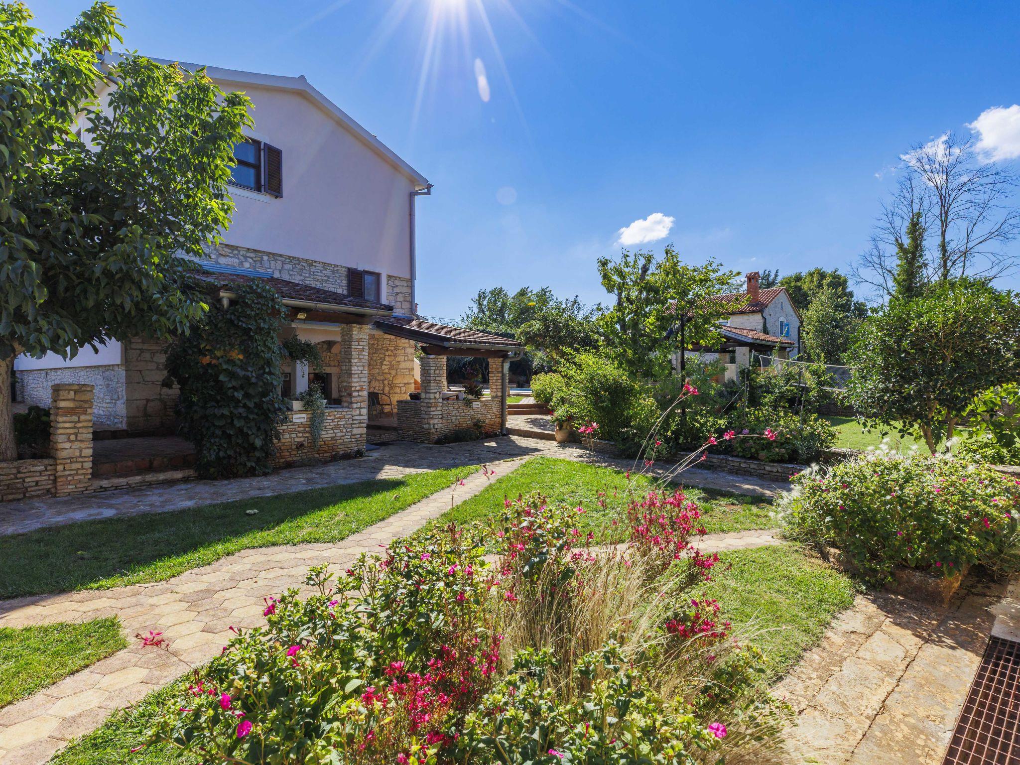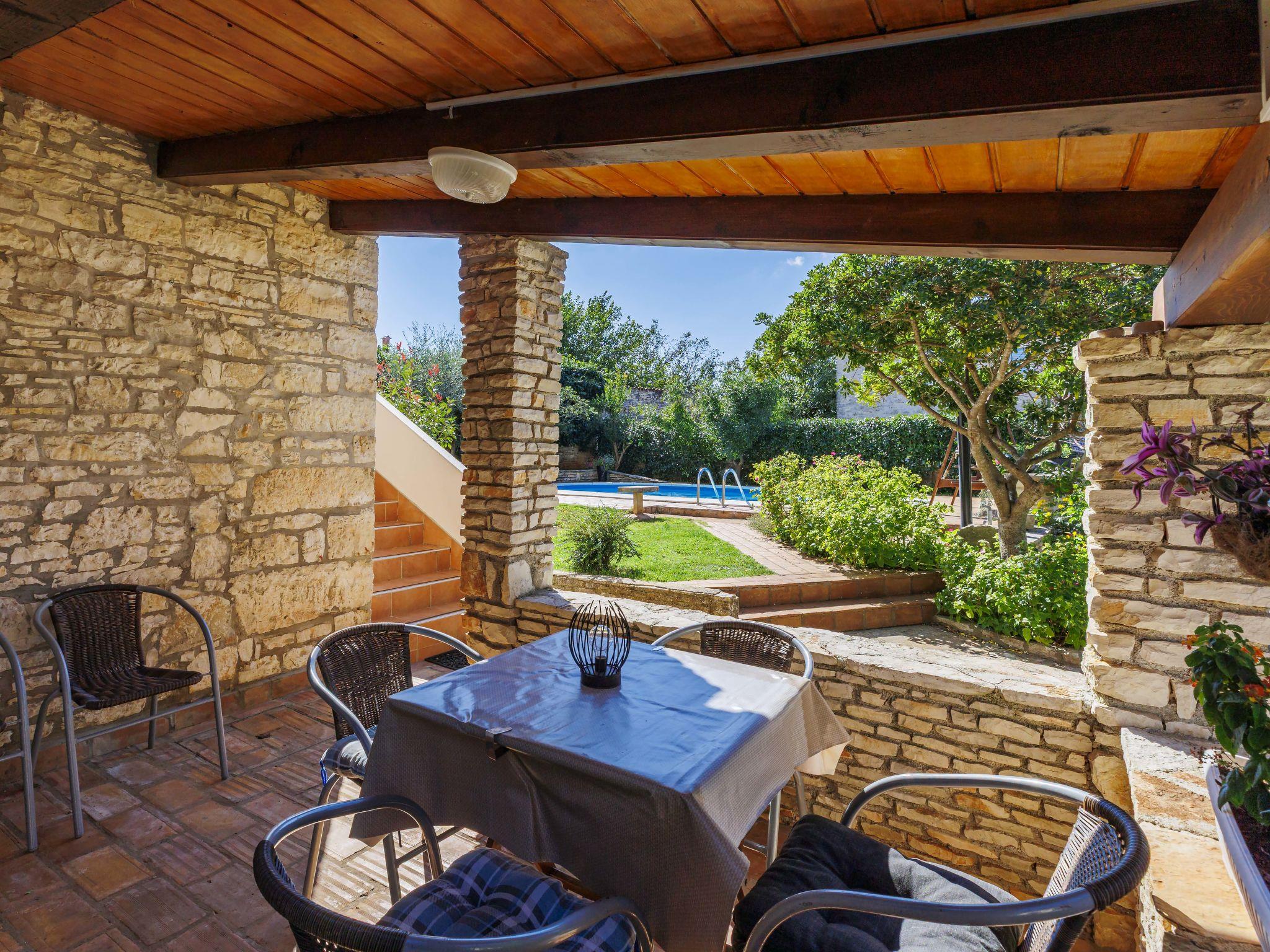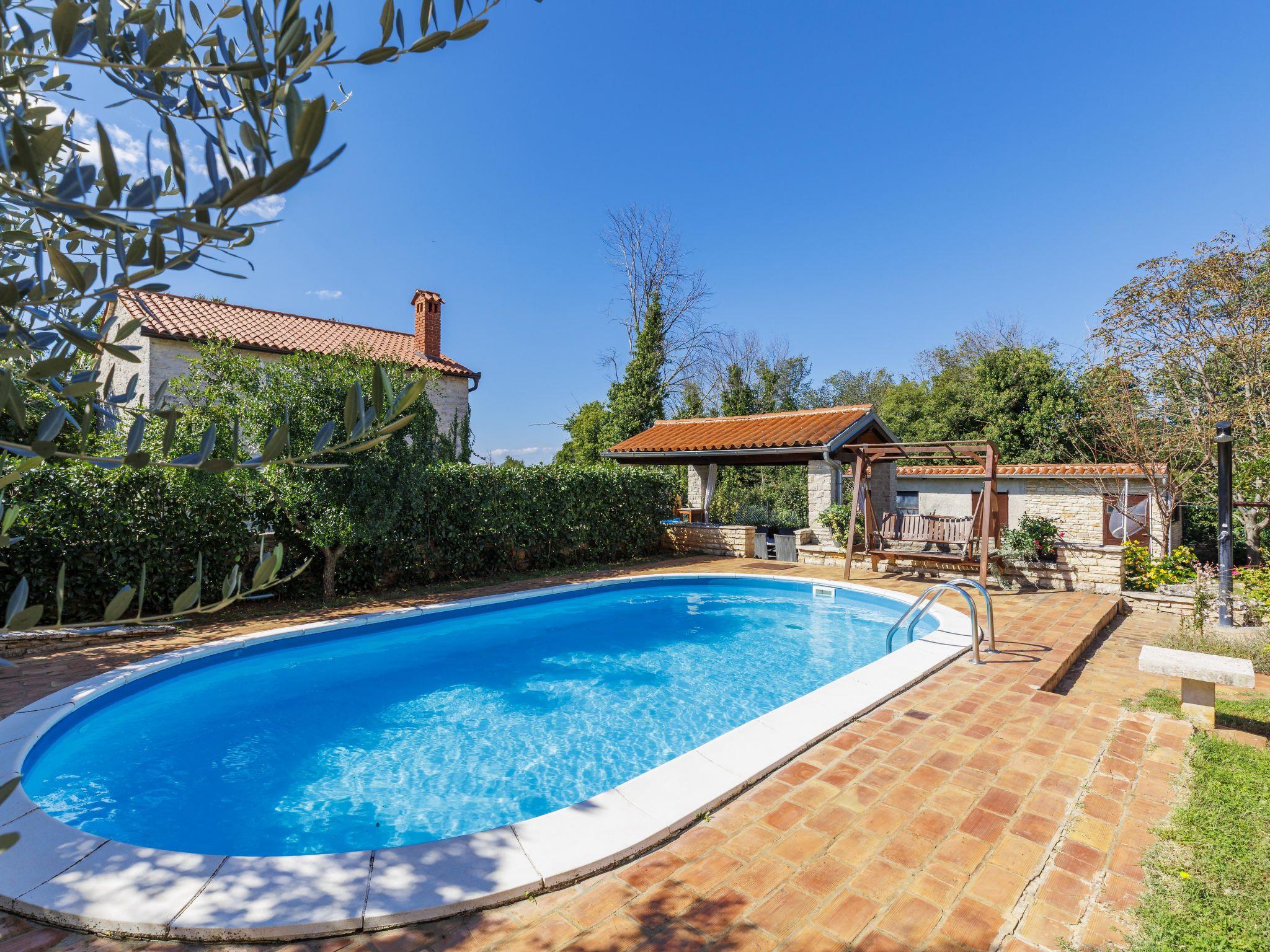 Semi-detached house "Mauro", 3 storeys. In the hamlet Kacana 3 km from the centre of Vodnjan, 10 km from the centre of Pula, 8.5 km from the sea. Private: property 1'500 m2 (fenced), garden with wildlife garden and trees, swimming pool (32 m2, depth 140 cm, seasonal availability: 01.May. - 15.Oct.). Outdoor shower, table tennis, badminton, terrace (20 m2), garden furniture, barbecue house (swing), pool maintenance by the owner/gardener. In the house: internet access, billiard table, table football, washing machine. Parking (for 3 cars) at the house on the premises. Shop 3 km, shopping centre 4 km, restaurant 3 km, café 3 km, bus stop 2.5 km, pebble beach 8.5 km.