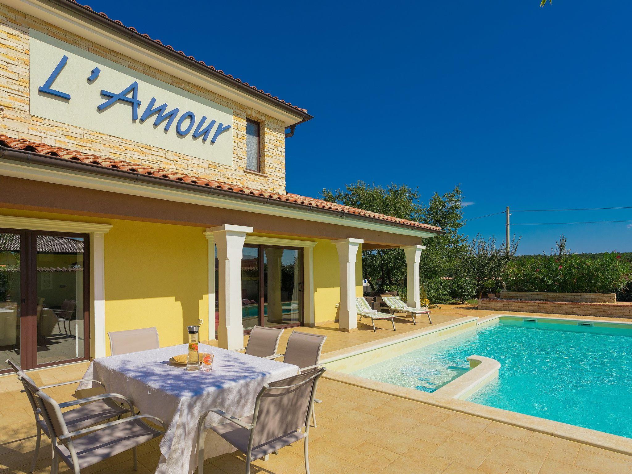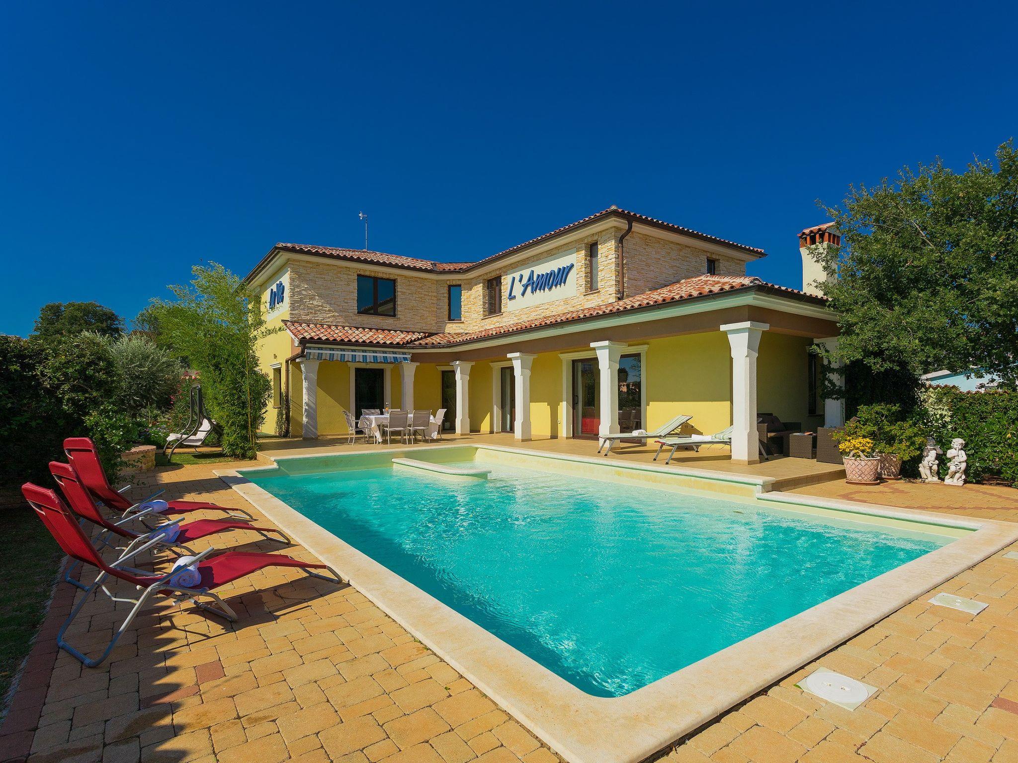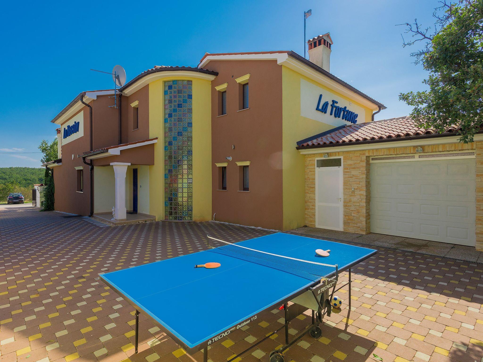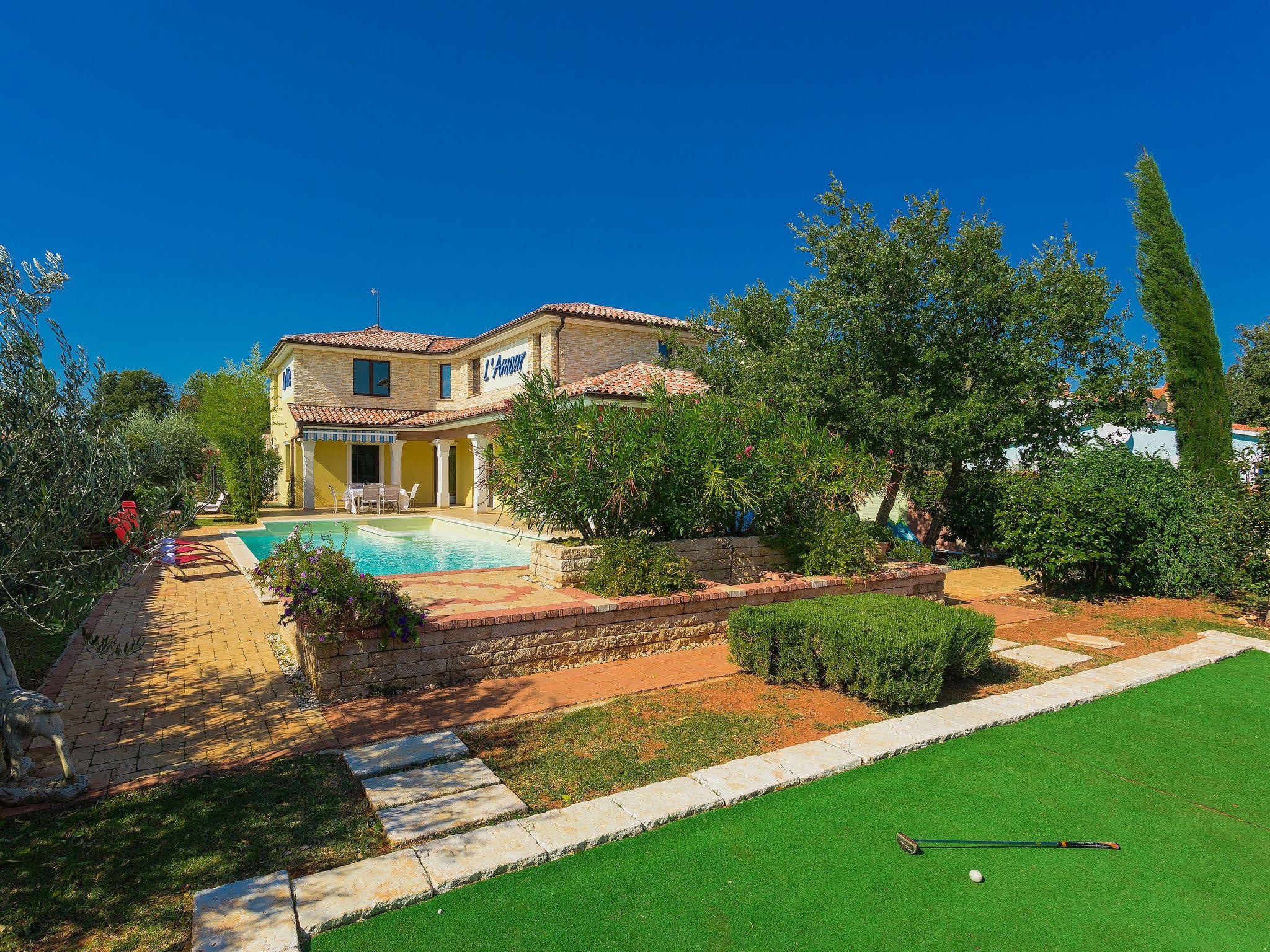 Majmajola 4 km from Vodnjan: Beautiful, comfortable villa "De l'amour", 2 storeys. In a quiet, sunny position, 10 km from the sea. Private: property 800 m2 (fenced) with lawn, swimming pool (10 x 5 m, depth 135 cm, seasonal availability: 11.May. - 14.Sep.) with internal staircase. Outdoor shower, table tennis, barbecue. In the house: internet access, table football, central heating system, burglar alarm system, washing machine, tumble dryer. Parking at the house on the premises, single garage. Shop 4 km, supermarket 5 km, restaurant 4 km, bus stop 3.7 km, pebble beach 10 km, rocky beach 10 km. Golf course (18 hole) 15 km, riding stable 15 km, walking paths from the house 1 km, cycle lane 1 km.