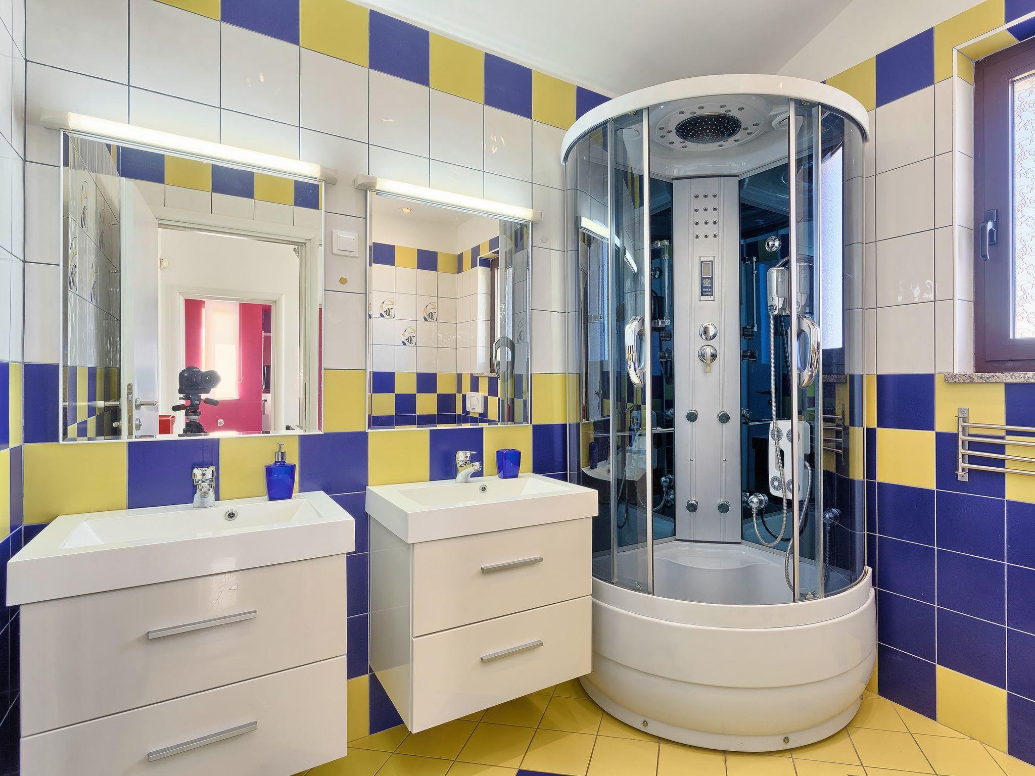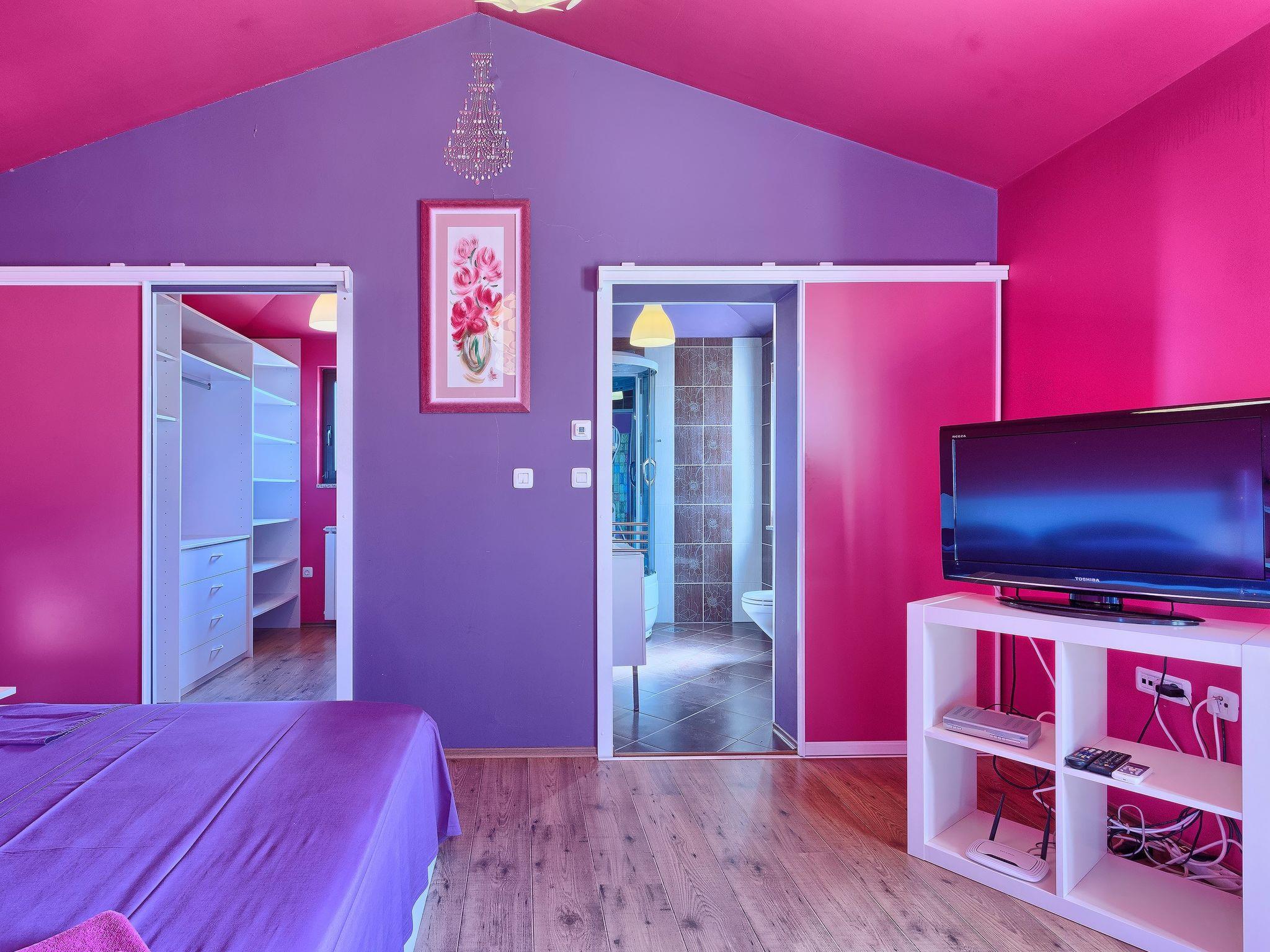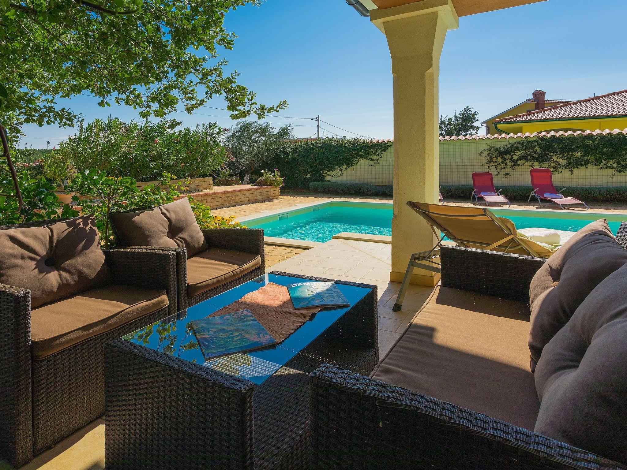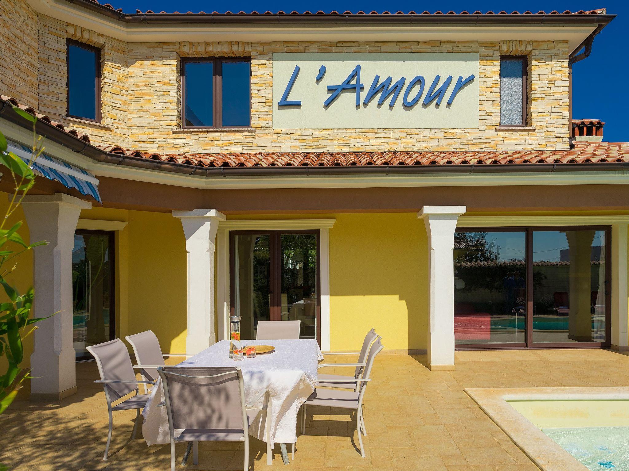 Majmajola 4 km from Vodnjan: Beautiful, comfortable villa "De l'amour", 2 storeys. In a quiet, sunny position, 10 km from the sea. Private: property 800 m2 (fenced) with lawn, swimming pool (10 x 5 m, depth 135 cm, seasonal availability: 11.May. - 14.Sep.) with internal staircase. Outdoor shower, table tennis, barbecue. In the house: internet access, table football, central heating system, burglar alarm system, washing machine, tumble dryer. Parking at the house on the premises, single garage. Shop 4 km, supermarket 5 km, restaurant 4 km, bus stop 3.7 km, pebble beach 10 km, rocky beach 10 km. Golf course (18 hole) 15 km, riding stable 15 km, walking paths from the house 1 km, cycle lane 1 km.