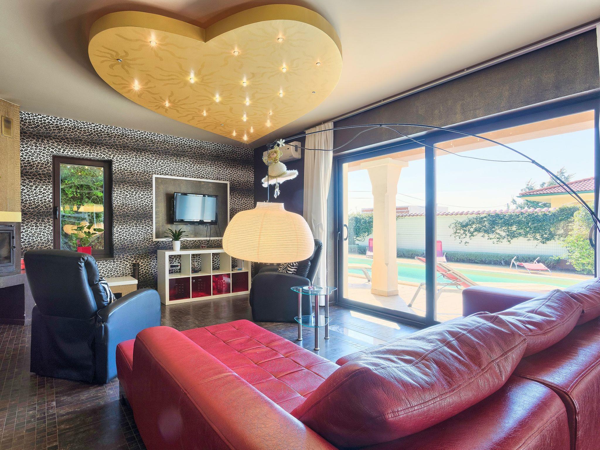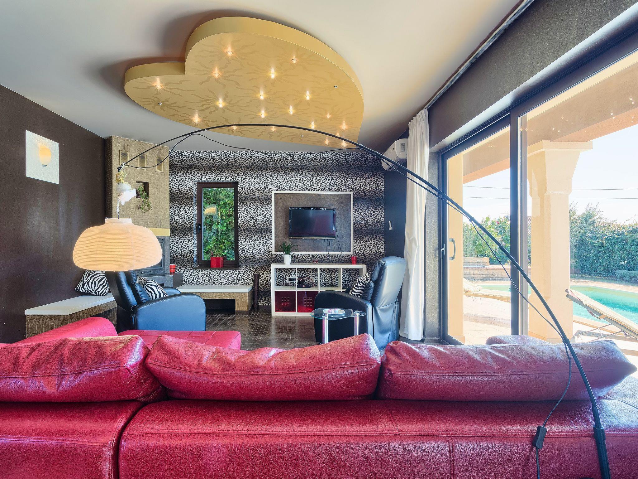 5-room villa 320 m2 on 2 levels. Living room 50 m2 with open-hearth fireplace, satellite TV, DVD and air conditioning. Exit to the terrace, to the swimming pool. 1 room with 1 double bed (2 x 90 cm, length 200 cm), satellite TV and air conditioning. Kitchen (4 hot plates, oven, dishwasher, freezer) with dining table. Shower/WC, hydro massage shower. On the lower ground floor: dining room with open-hearth fireplace. Open kitchen (4 hot plates, oven, dishwasher, microwave, freezer). Sep. WC. Upper floor: 1 room with 1 french bed (180 cm, length 200 cm), shower/bidet/WC, hydro massage bath, satellite TV and air conditioning. 1 room with 2 beds (90 cm, length 200 cm), satellite TV and air conditioning. 1 room with 2 beds (80 cm, length 200 cm), satellite TV and air conditioning. Shower/WC, hydro massage shower. Floor heating. Terrace 30 m2 partly roofed. Terrace furniture. View of the swimming pool. Facilities: baby cot. Internet (WiFi, free). The dining room with kitchen in the basement is arranged as tavern, with a large table. 4200