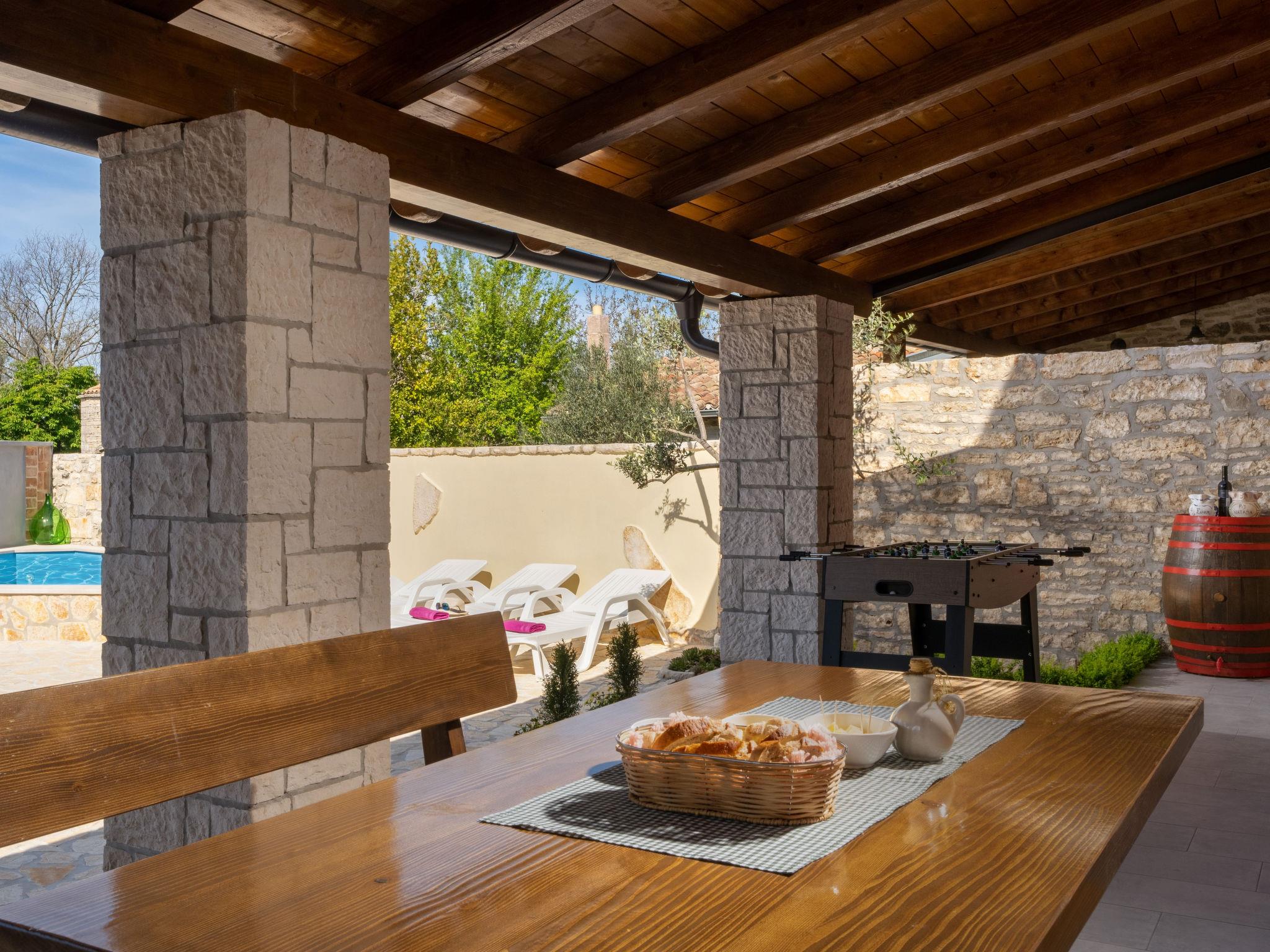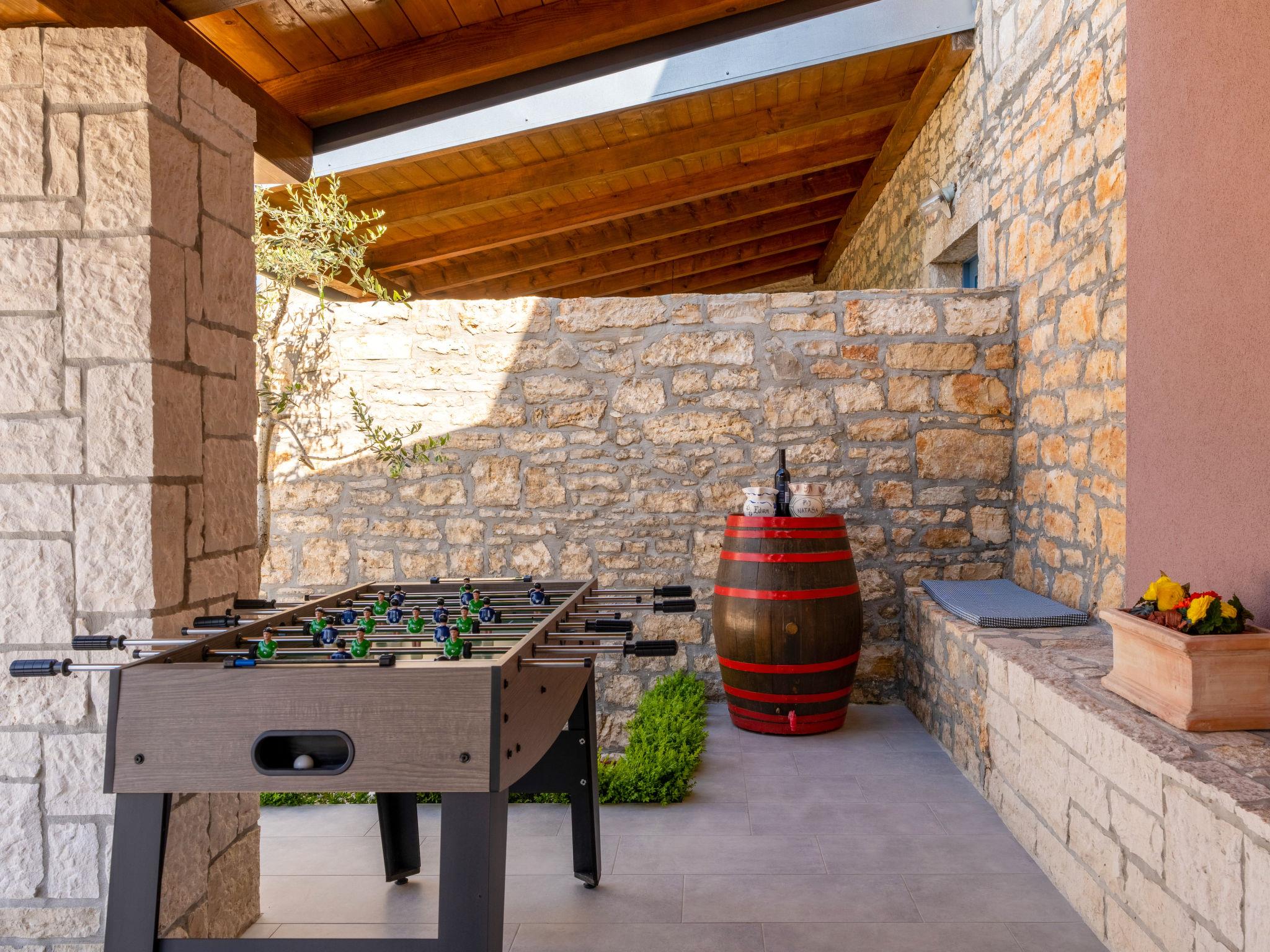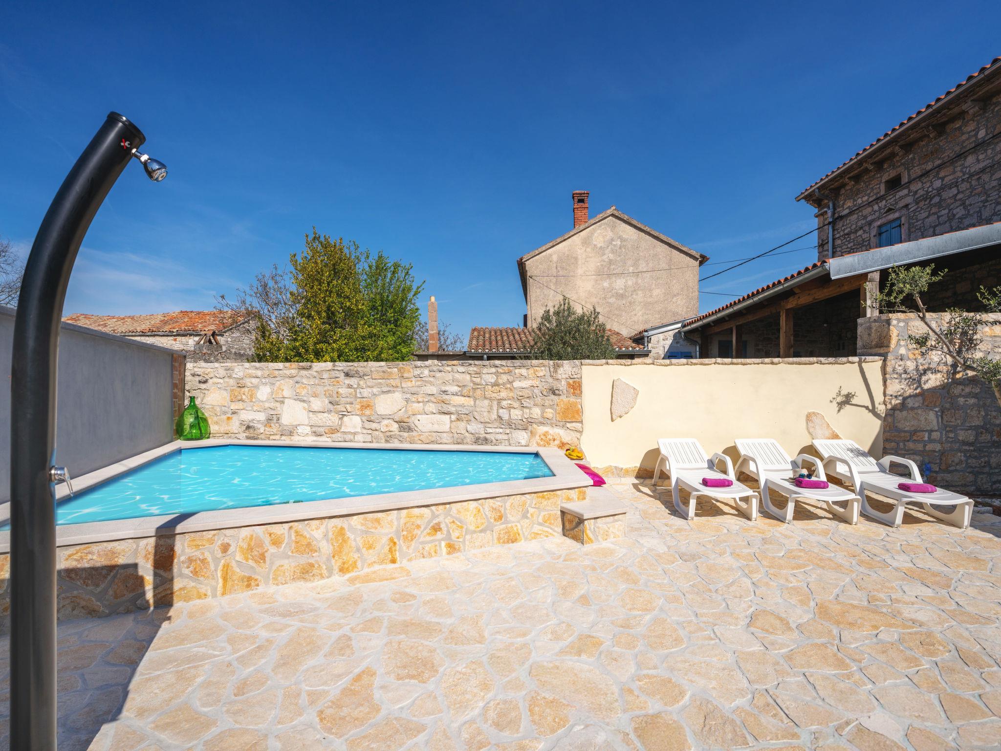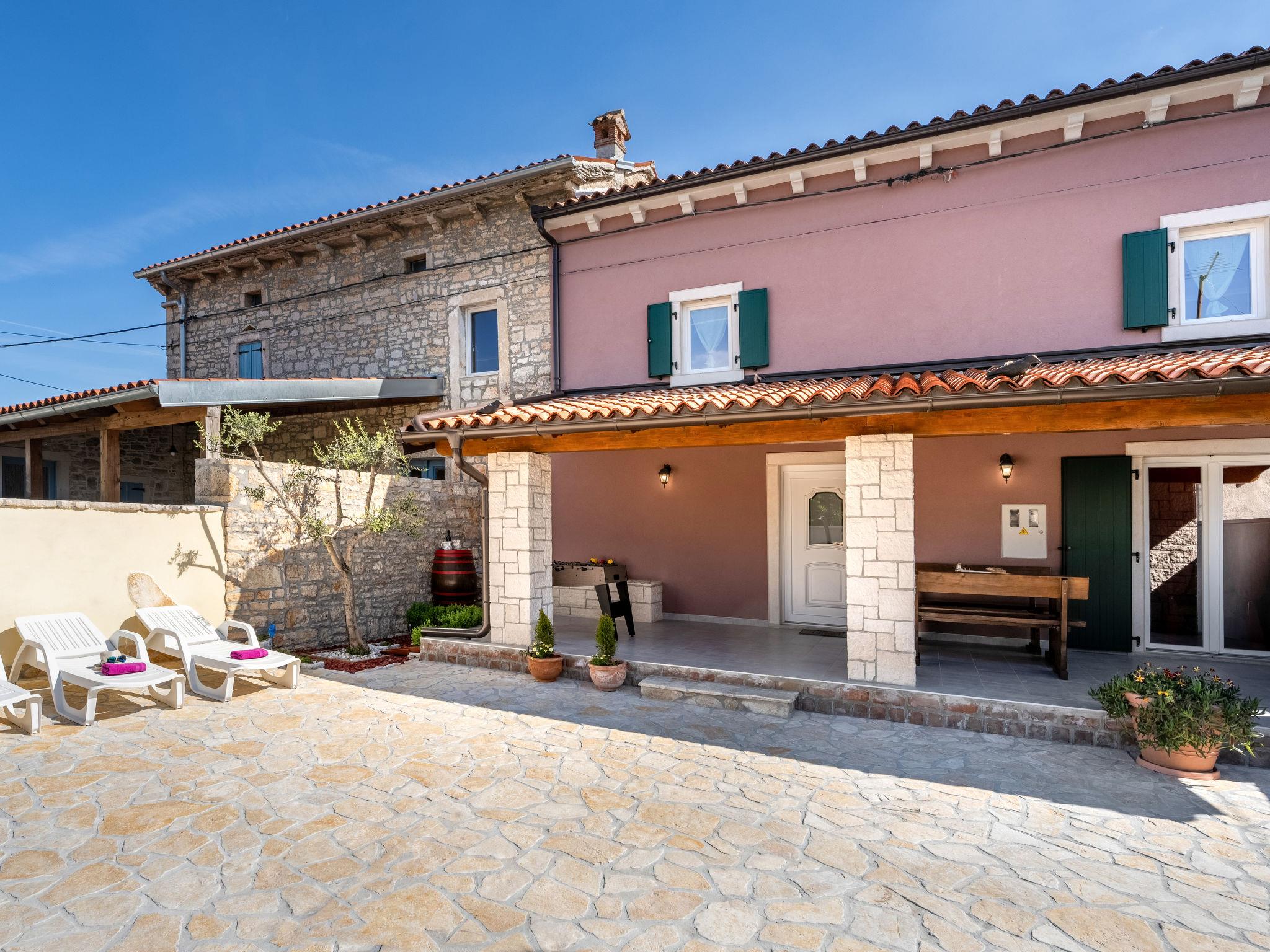 Butkovici 9 km from Vodnjan: Terraced house "Butkovic", 2 storeys. 15 km from the sea. Private: property 120 m2 (fenced), swimming pool (18 m2, depth 140 cm, seasonal availability: 01.May. - 30.Sep.) with internal staircase. Unconventional pool shape. Outdoor shower, garden furniture, barbecue. In the house: internet access, table football, washing machine. Parking at the house on the premises. Shop 9 km, supermarket 9 km, restaurant 3 km, bus stop 3 km, pebble beach 15 km, rocky beach 15 km. Walking paths from the house, cycle lane 100 m.