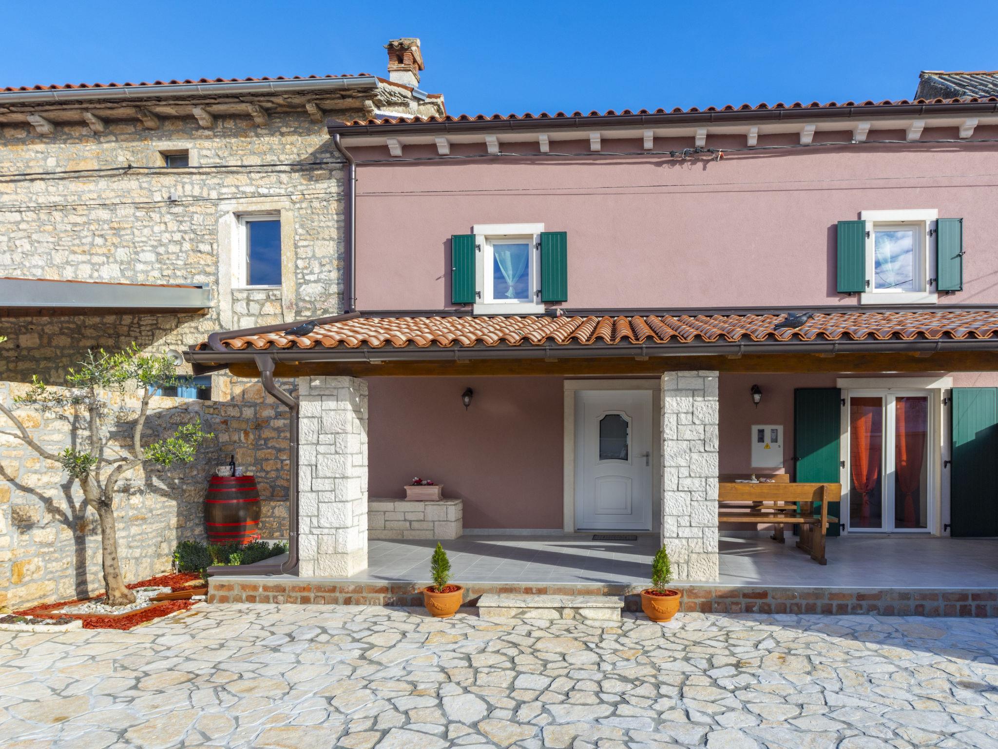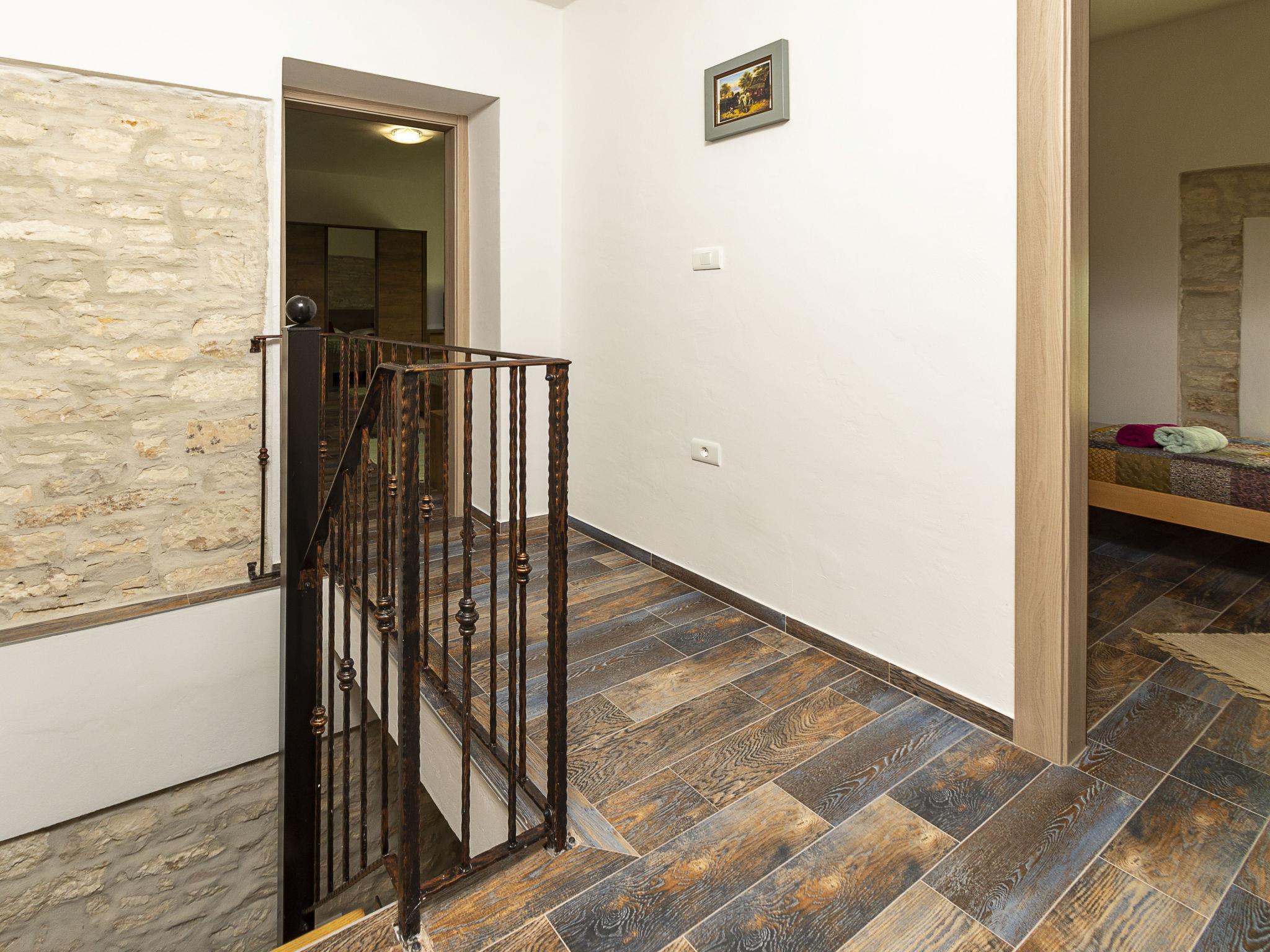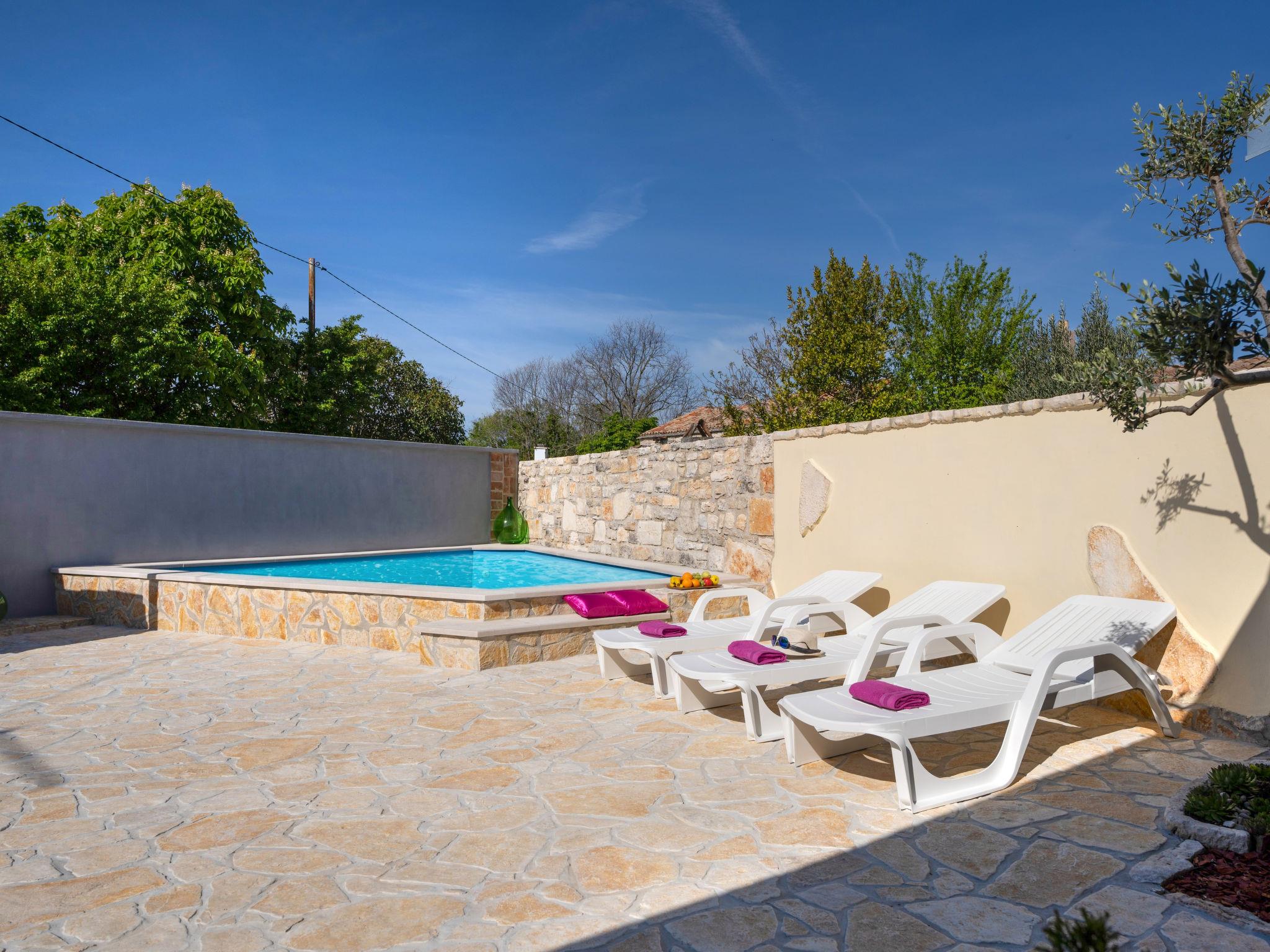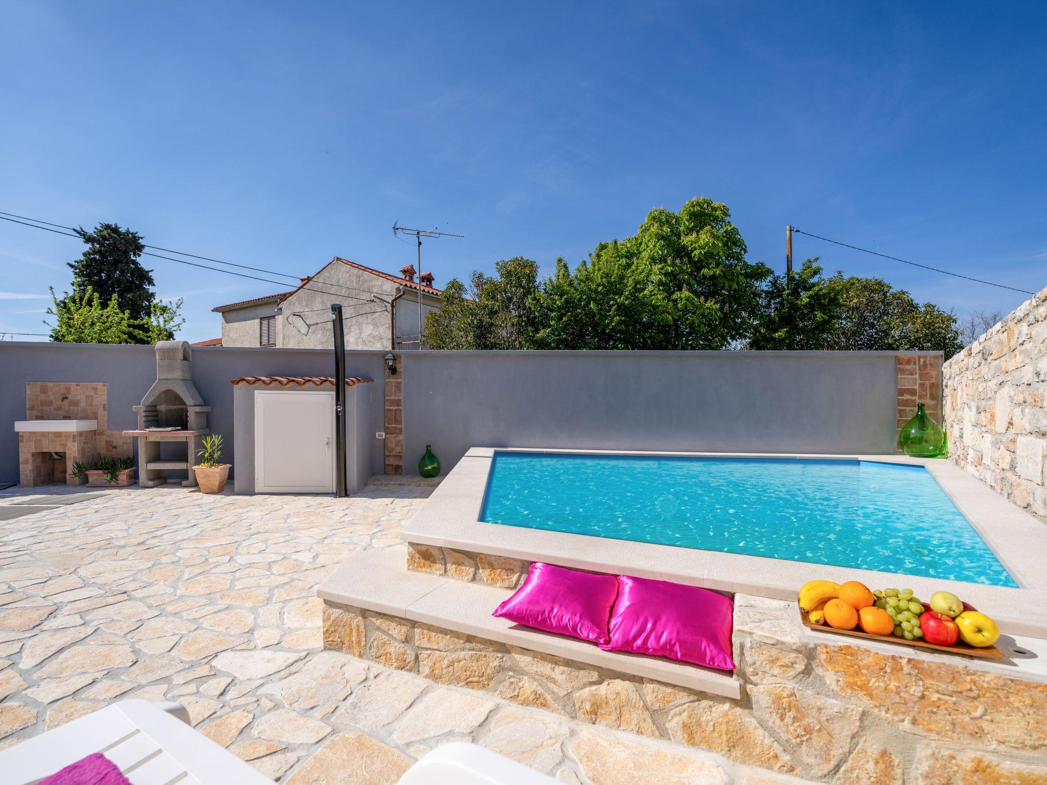 Butkovici 9 km from Vodnjan: Terraced house "Butkovic", 2 storeys. 15 km from the sea. Private: property 120 m2 (fenced), swimming pool (18 m2, depth 140 cm, seasonal availability: 01.May. - 30.Sep.) with internal staircase. Unconventional pool shape. Outdoor shower, garden furniture, barbecue. In the house: internet access, table football, washing machine. Parking at the house on the premises. Shop 9 km, supermarket 9 km, restaurant 3 km, bus stop 3 km, pebble beach 15 km, rocky beach 15 km. Walking paths from the house, cycle lane 100 m.