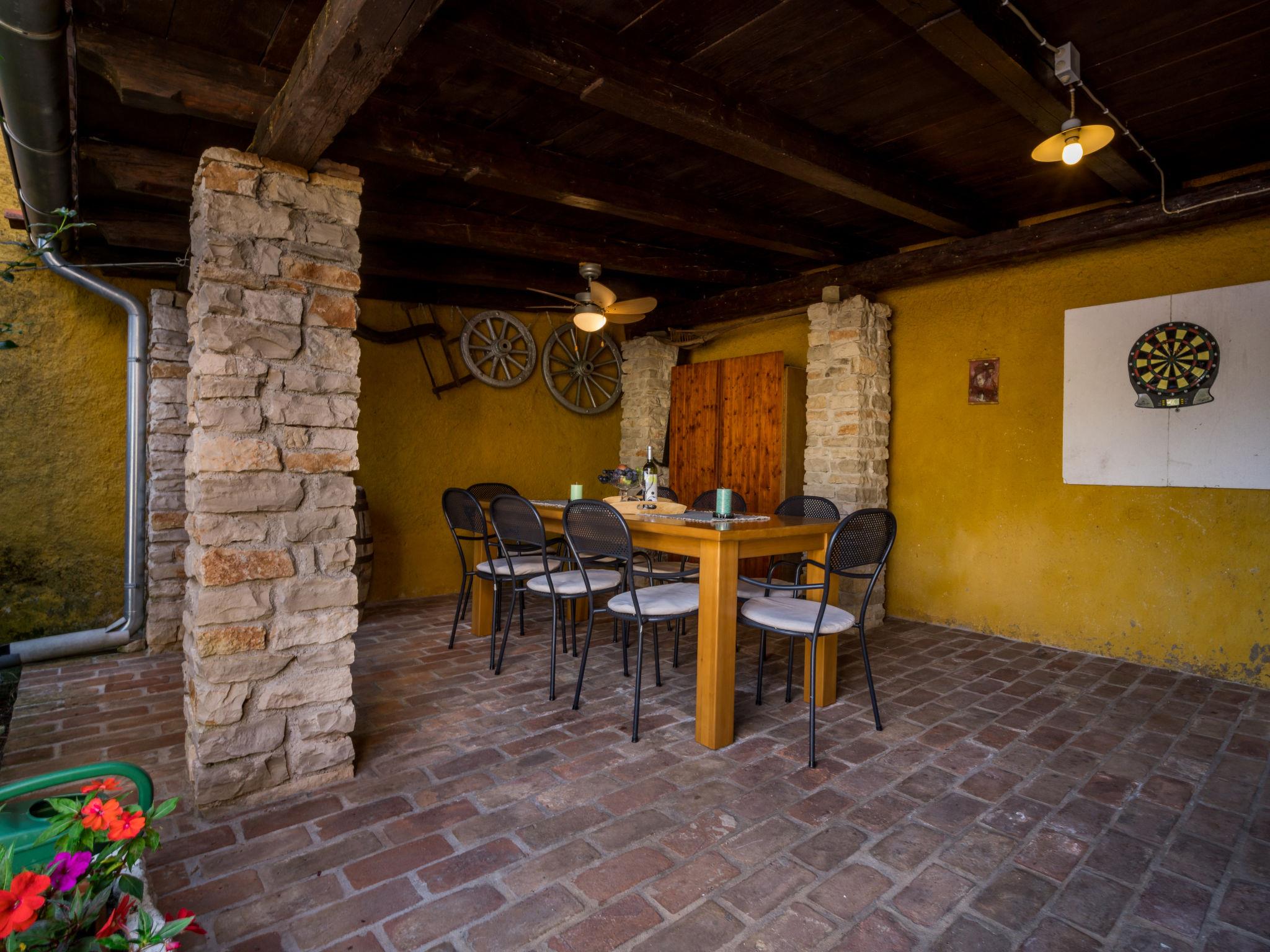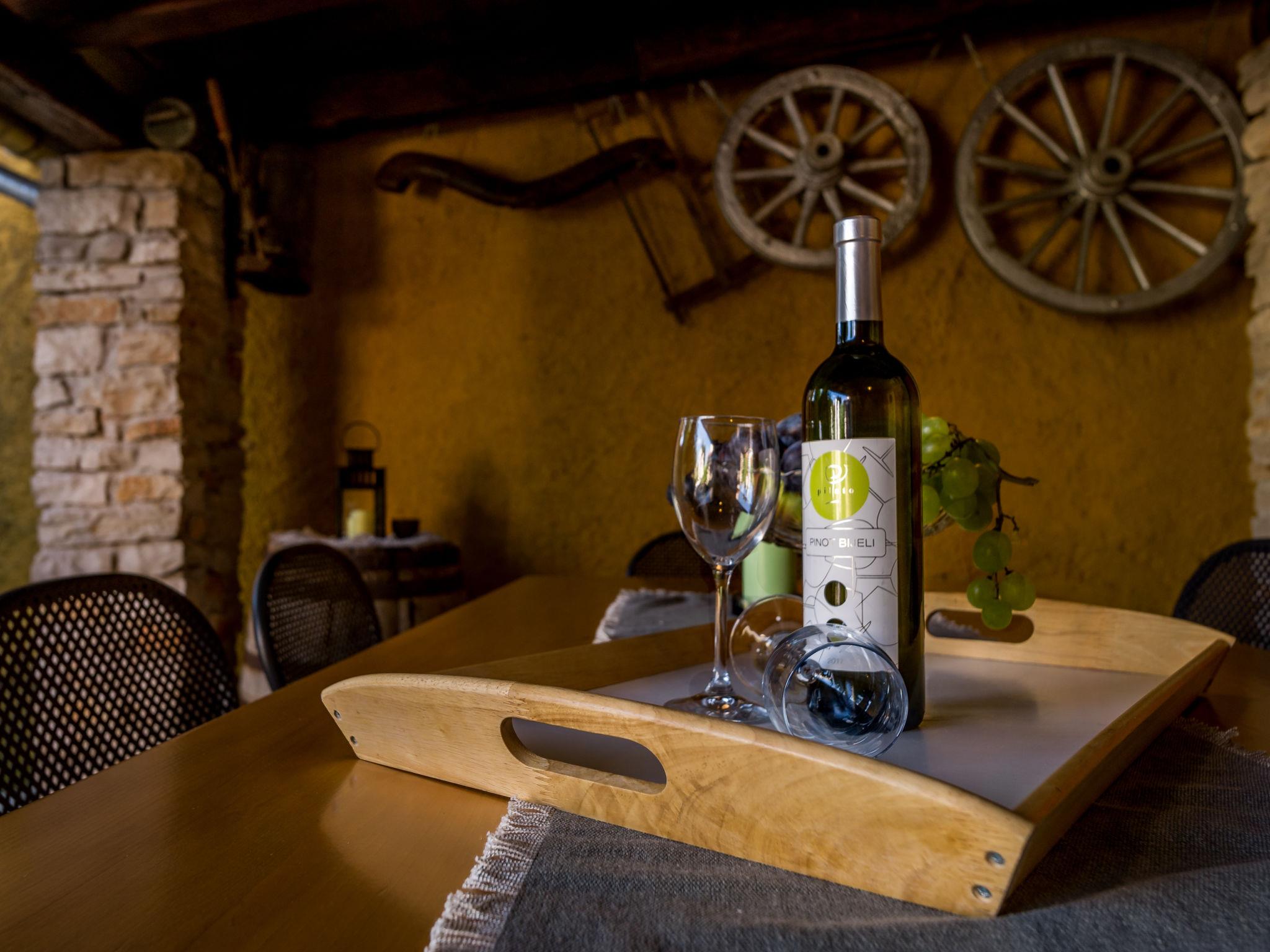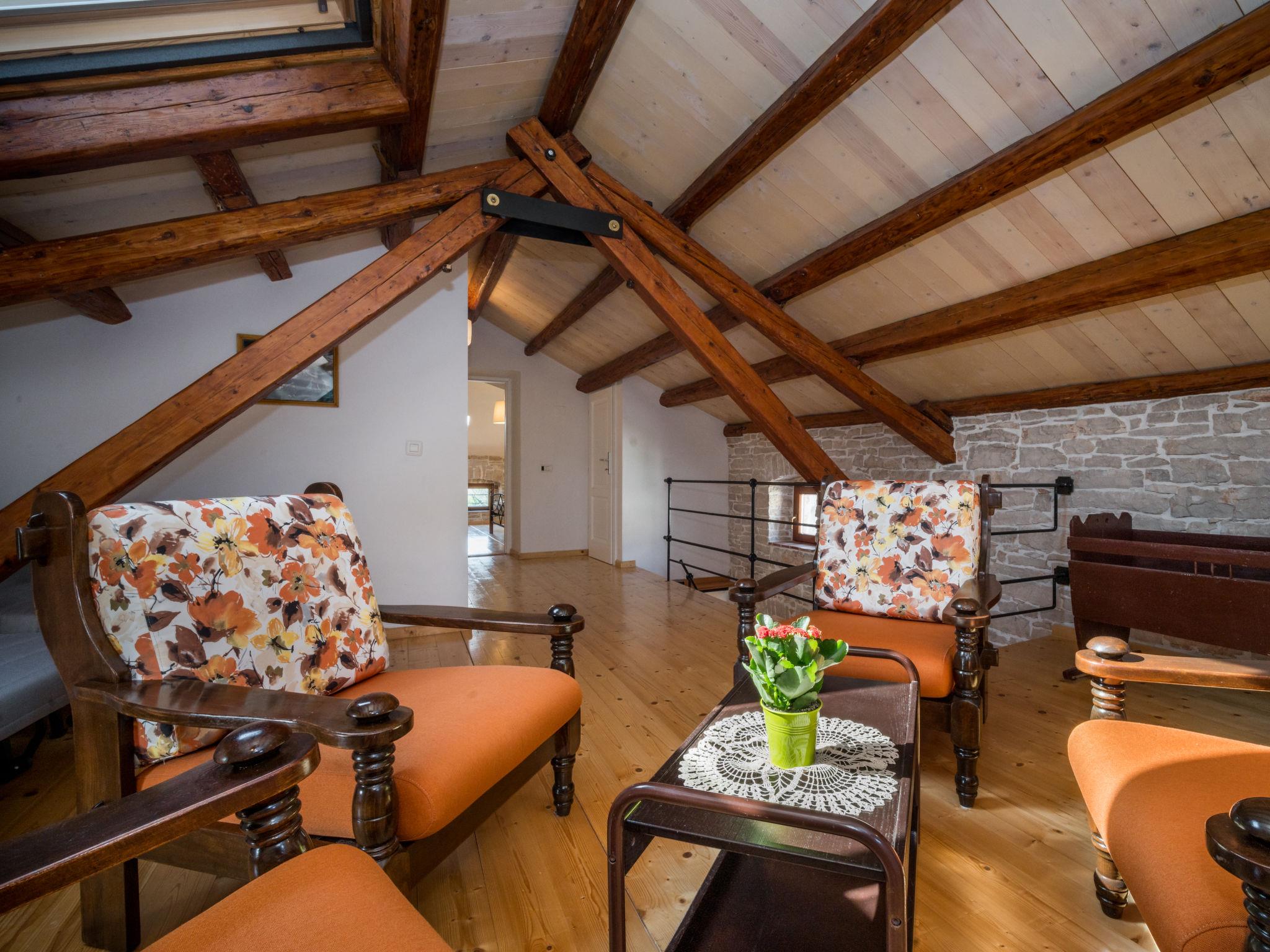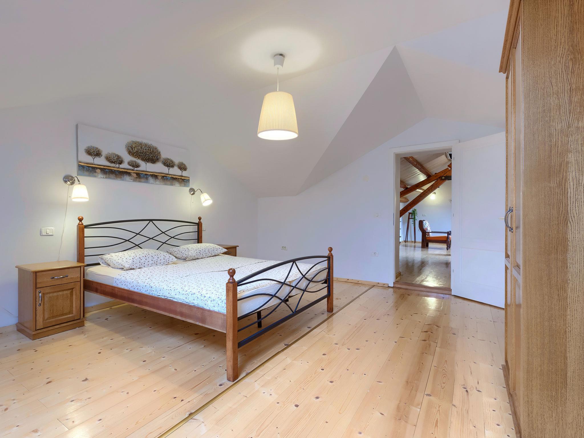 6-room semi-detached house 160 m2 on 3 levels. Rustic and tasteful furnishings: large living/dining room 50 m2 with open-hearth fireplace and satellite TV (flat screen). Open kitchen (oven, dishwasher, 4 ceramic glass hob hotplates, toaster, kettle, microwave, freezer, electric coffee machine). Shower/WC. Upper floor: 1 room with 1 double bed (2 x 80 cm, length 200 cm). Exit to the terrace. 1 room with 1 double bed (2 x 80 cm, length 200 cm), shower/WC. 1 room with 2 beds (90 cm, length 200 cm). Shower/WC. Top floor: living room, with sloping ceilings, ceiling height 130 - 250 cm with air conditioning. 1 room with sloping ceilings, ceiling height 130 - 250 cm with rooflight with 1 double bed (2 x 80 cm, length 200 cm). Shower/WC. Terrace 10 m2. Deck chairs. View of the swimming pool and the countryside. Facilities: washing machine. Internet (WiFi, free). KLASA:UP/I-335-03/13-01/1109 URBROJ; 2163-03-02/13