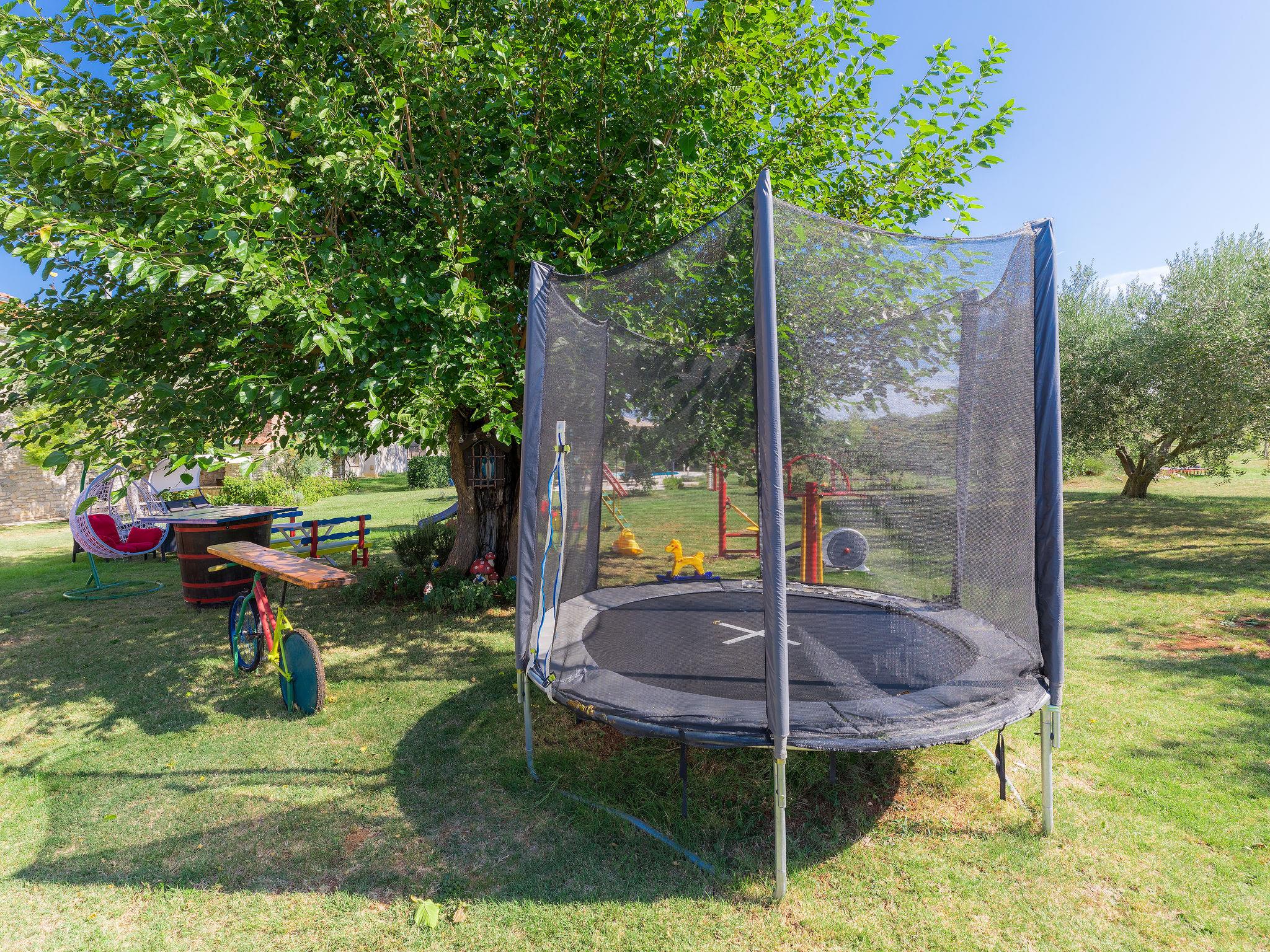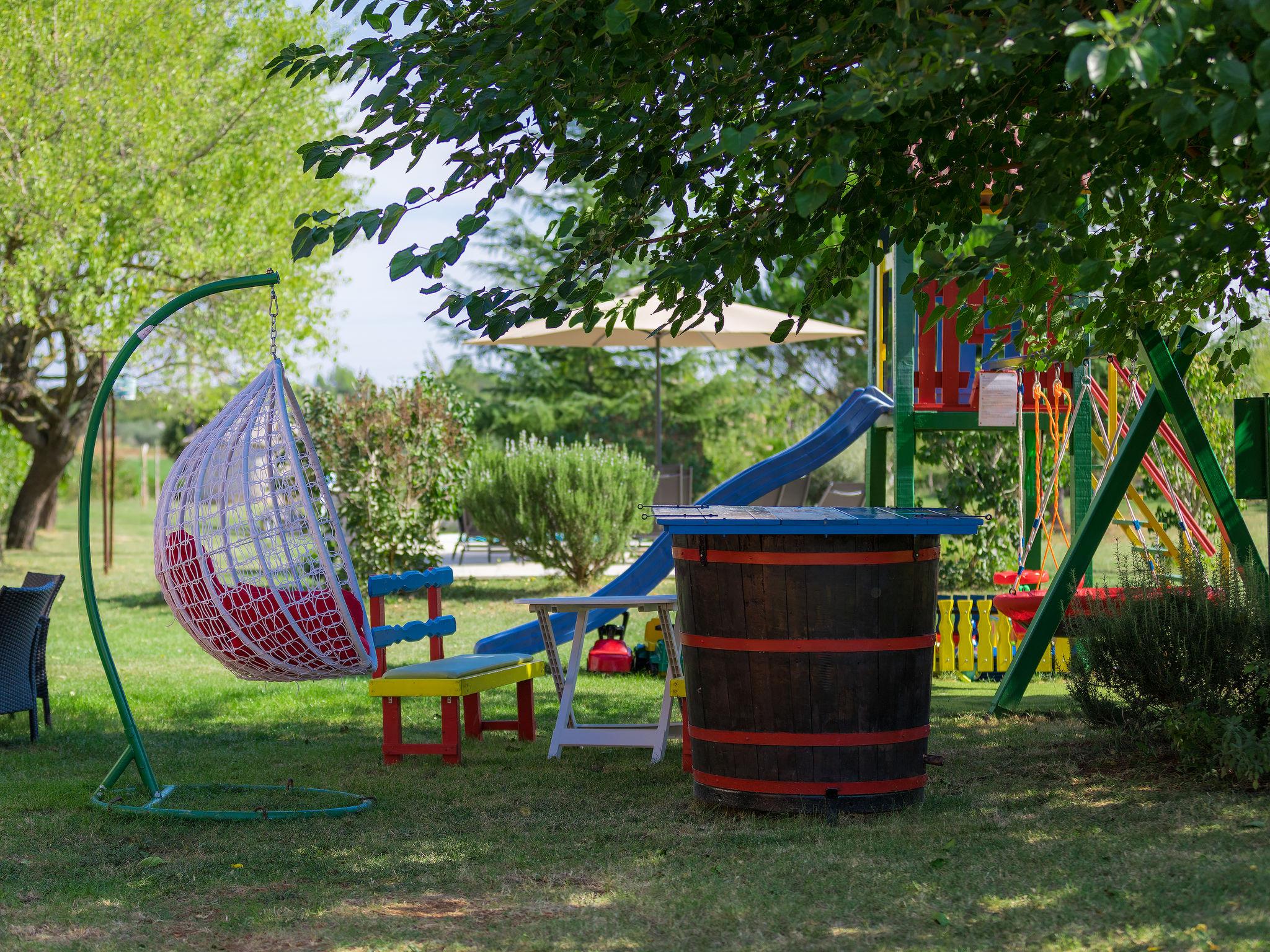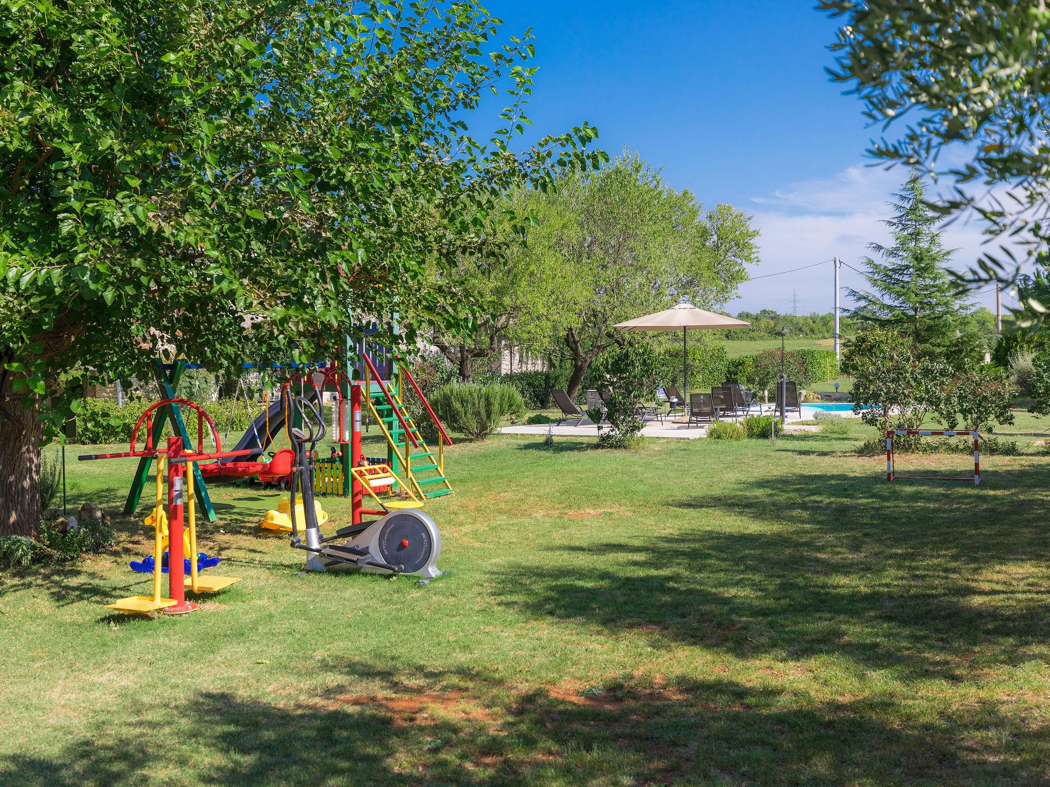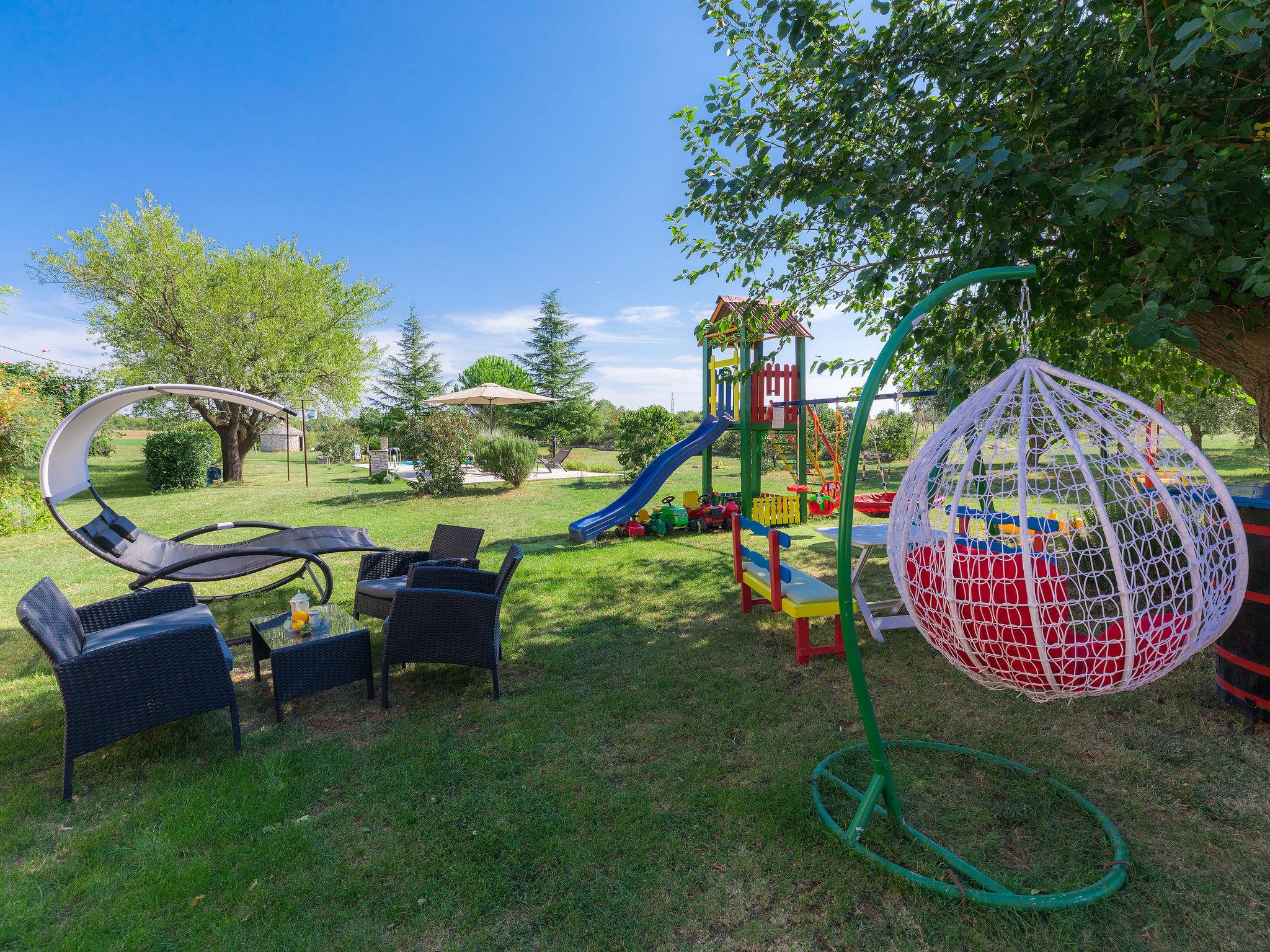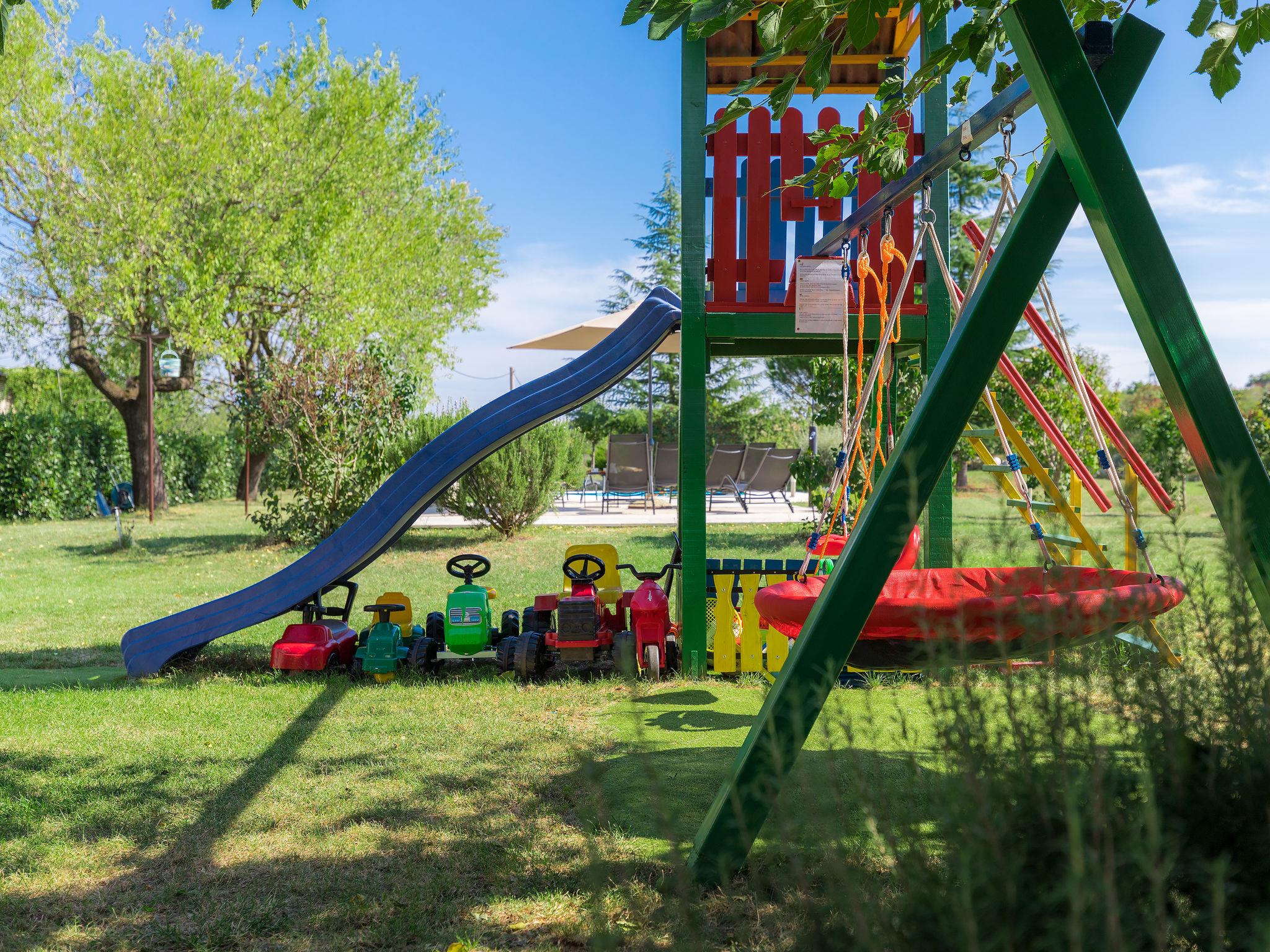 Semi-detached house "Bozac", 3 storeys, surrounded by meadows and fields. In the hamlet Guran 3 km from the centre of Vodnjan, 10 km from the sea. For shared use: property 2'000 m2, trees, meadow, swimming pool heated (8 x 5 m, seasonal availability: 01.May. - 01.Jun.). (swing, sandbox). Private: swimming pool (6 x 4 m, depth 130 cm, seasonal availability: 01.May. - 14.Oct.). Outdoor shower, terrace (16 m2), garden furniture, barbecue. In the house: internet access, washing machine. Available: bicycles (3) (extra). Breakfast and half board possible (extra). Parking (for 2 cars) on the premises. Supermarket 3 km, bus stop 3.2 km, pebble beach 10 km. The owner does not accept any youth groups. Local sale of farm products.