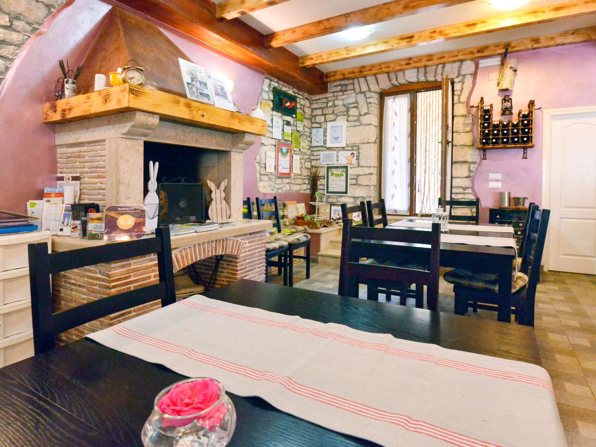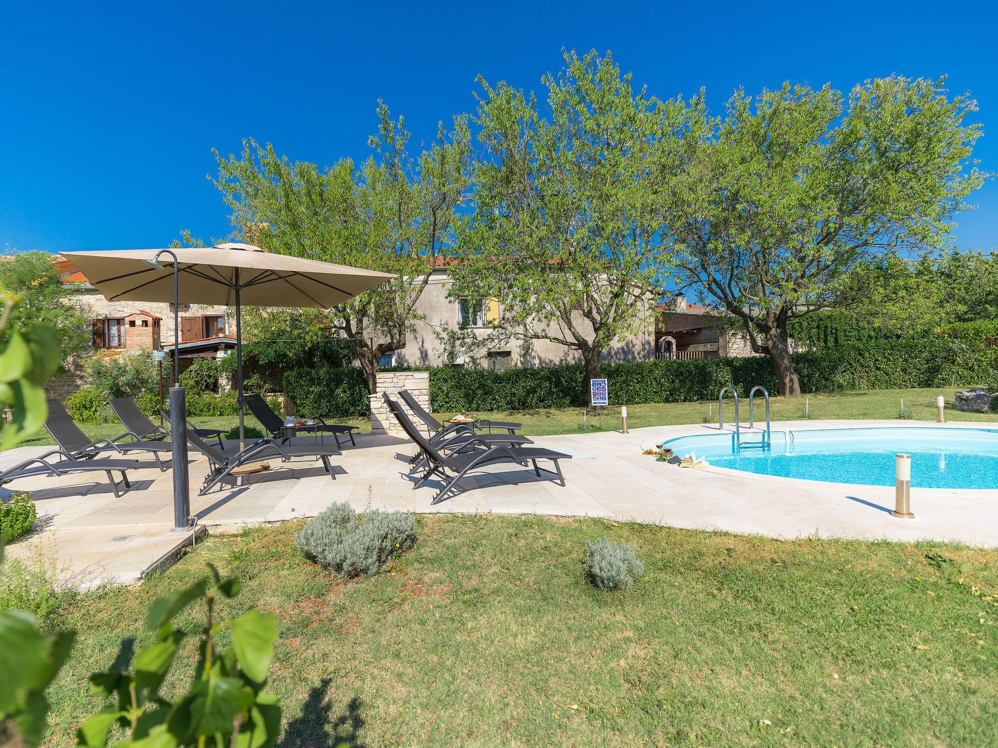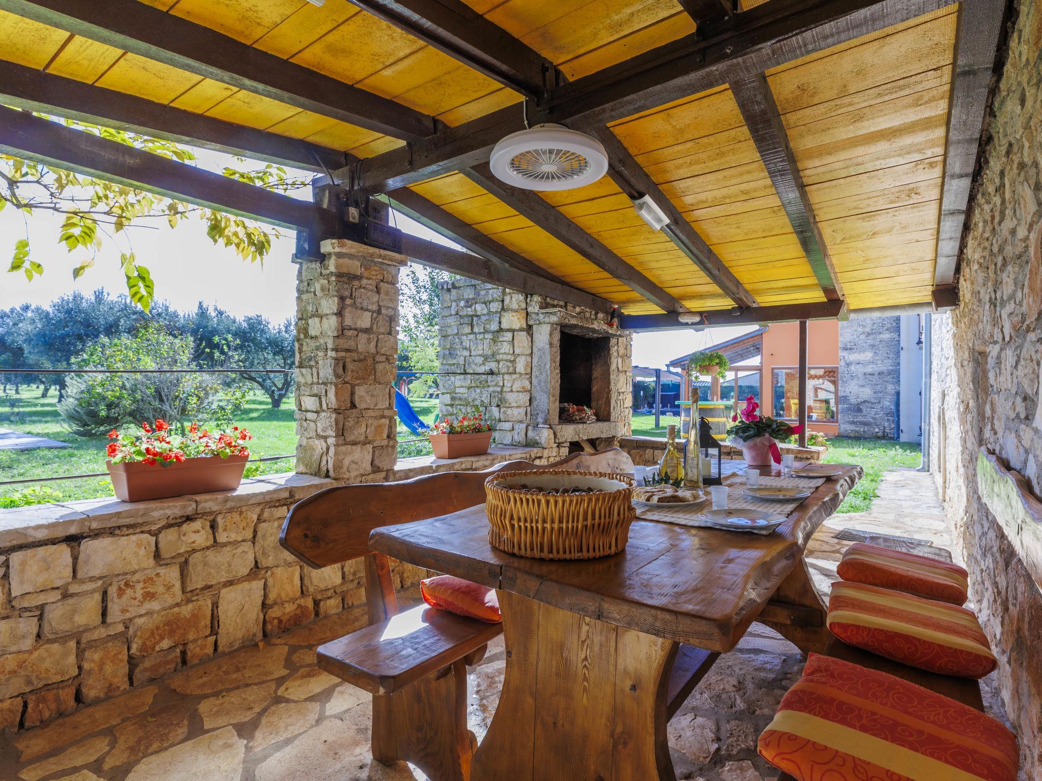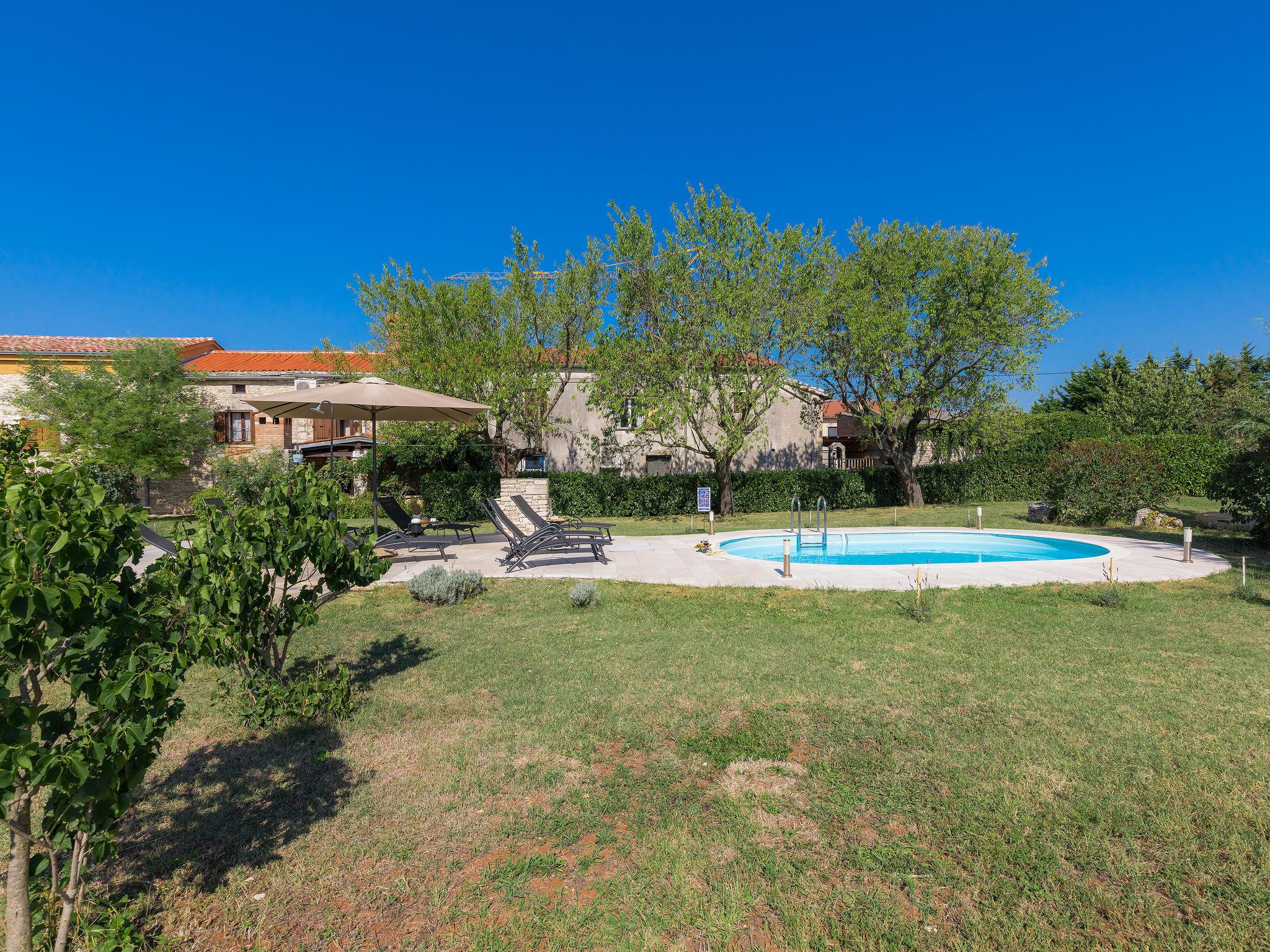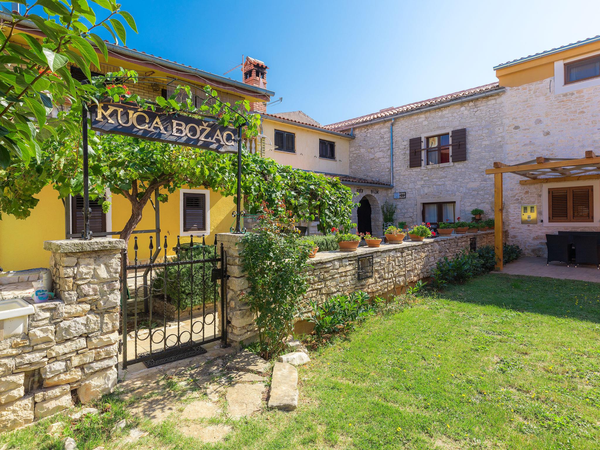 Semi-detached house "Bozac", 3 storeys, surrounded by meadows and fields. In the hamlet Guran 3 km from the centre of Vodnjan, 10 km from the sea. For shared use: property 2'000 m2, trees, meadow, swimming pool heated (8 x 5 m, seasonal availability: 01.May. - 01.Jun.). (swing, sandbox). Private: swimming pool (6 x 4 m, depth 130 cm, seasonal availability: 01.May. - 14.Oct.). Outdoor shower, terrace (16 m2), garden furniture, barbecue. In the house: internet access, washing machine. Available: bicycles (3) (extra). Breakfast and half board possible (extra). Parking (for 2 cars) on the premises. Supermarket 3 km, bus stop 3.2 km, pebble beach 10 km. The owner does not accept any youth groups. Local sale of farm products.