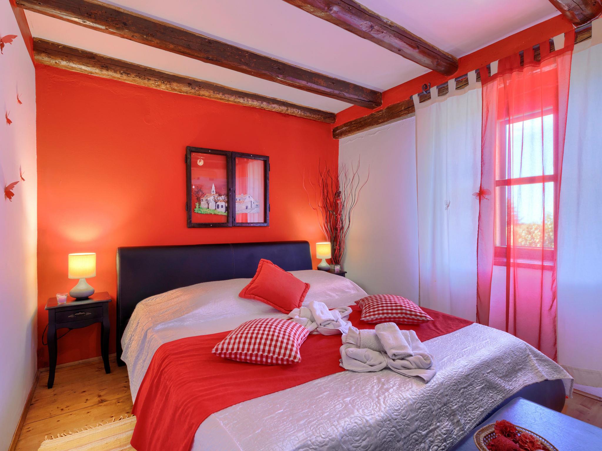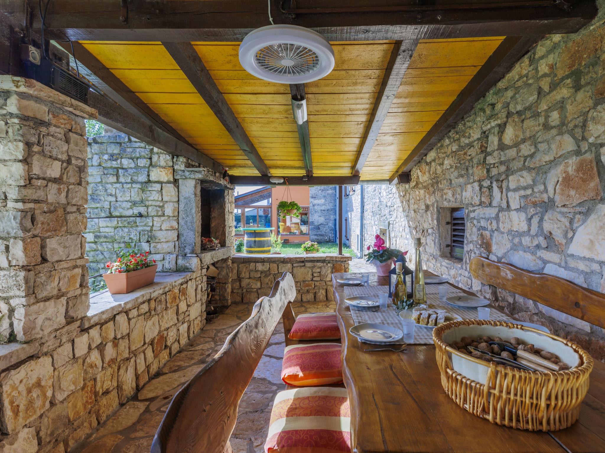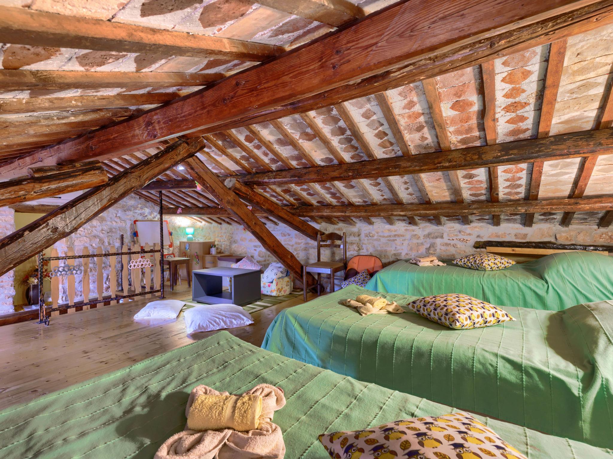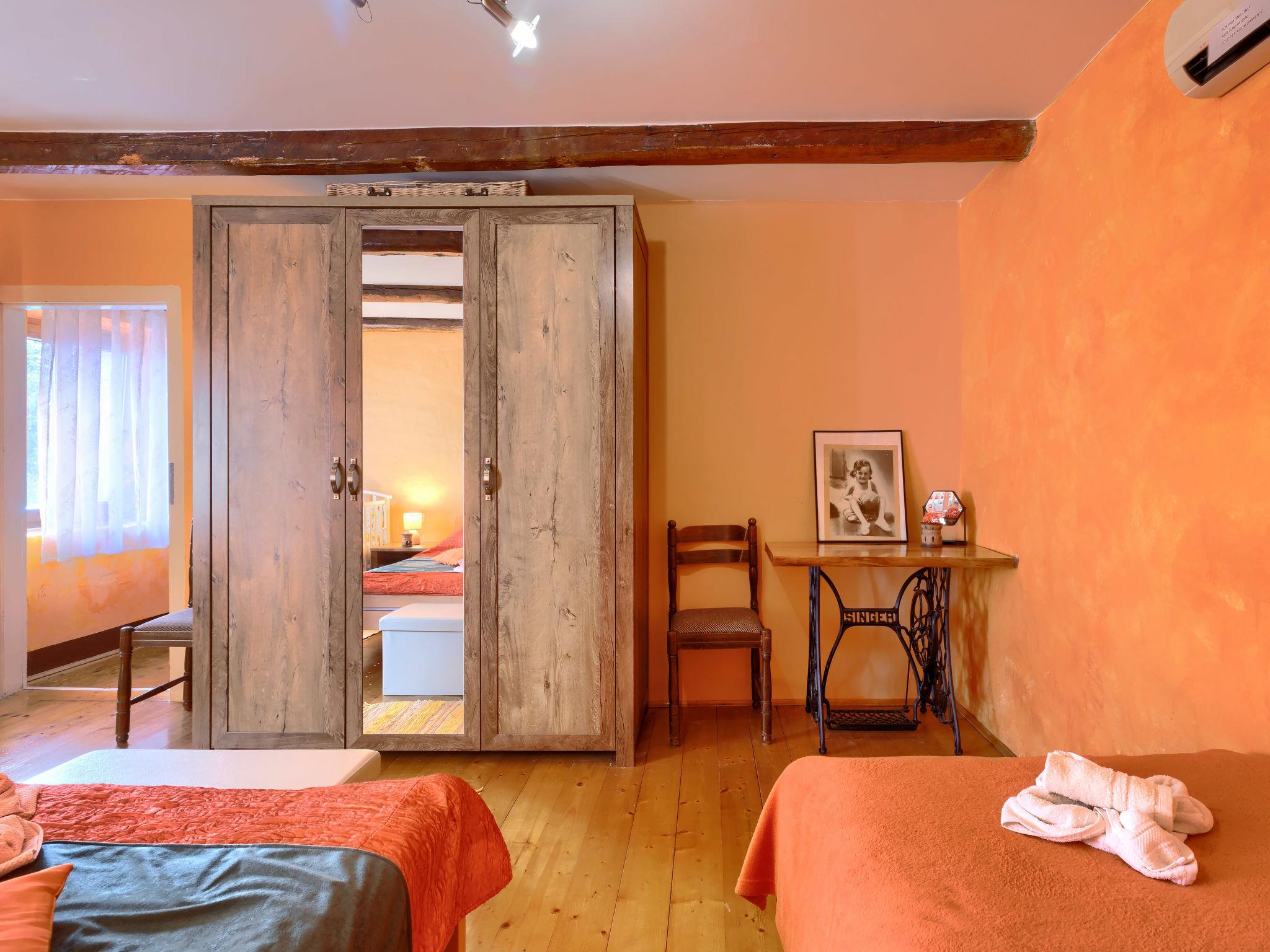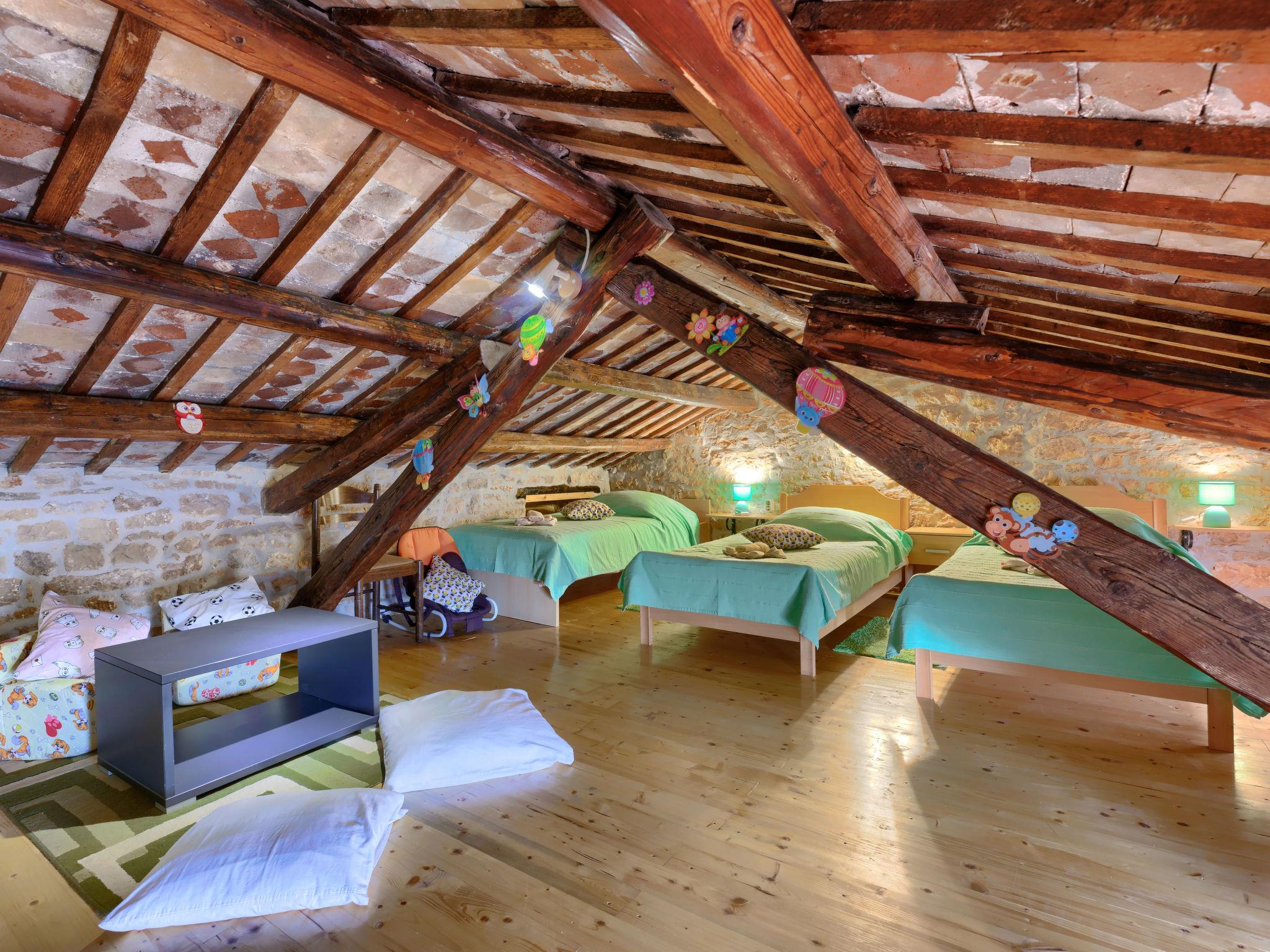 Semi-detached house "Bozac", 3 storeys, surrounded by meadows and fields. In the hamlet Guran 3 km from the centre of Vodnjan, 10 km from the sea. For shared use: property 2'000 m2, trees, meadow, swimming pool heated (8 x 5 m, seasonal availability: 01.May. - 01.Jun.). (swing, sandbox). Private: swimming pool (6 x 4 m, depth 130 cm, seasonal availability: 01.May. - 14.Oct.). Outdoor shower, terrace (16 m2), garden furniture, barbecue. In the house: internet access, washing machine. Available: bicycles (3) (extra). Breakfast and half board possible (extra). Parking (for 2 cars) on the premises. Supermarket 3 km, bus stop 3.2 km, pebble beach 10 km. The owner does not accept any youth groups. Local sale of farm products.
