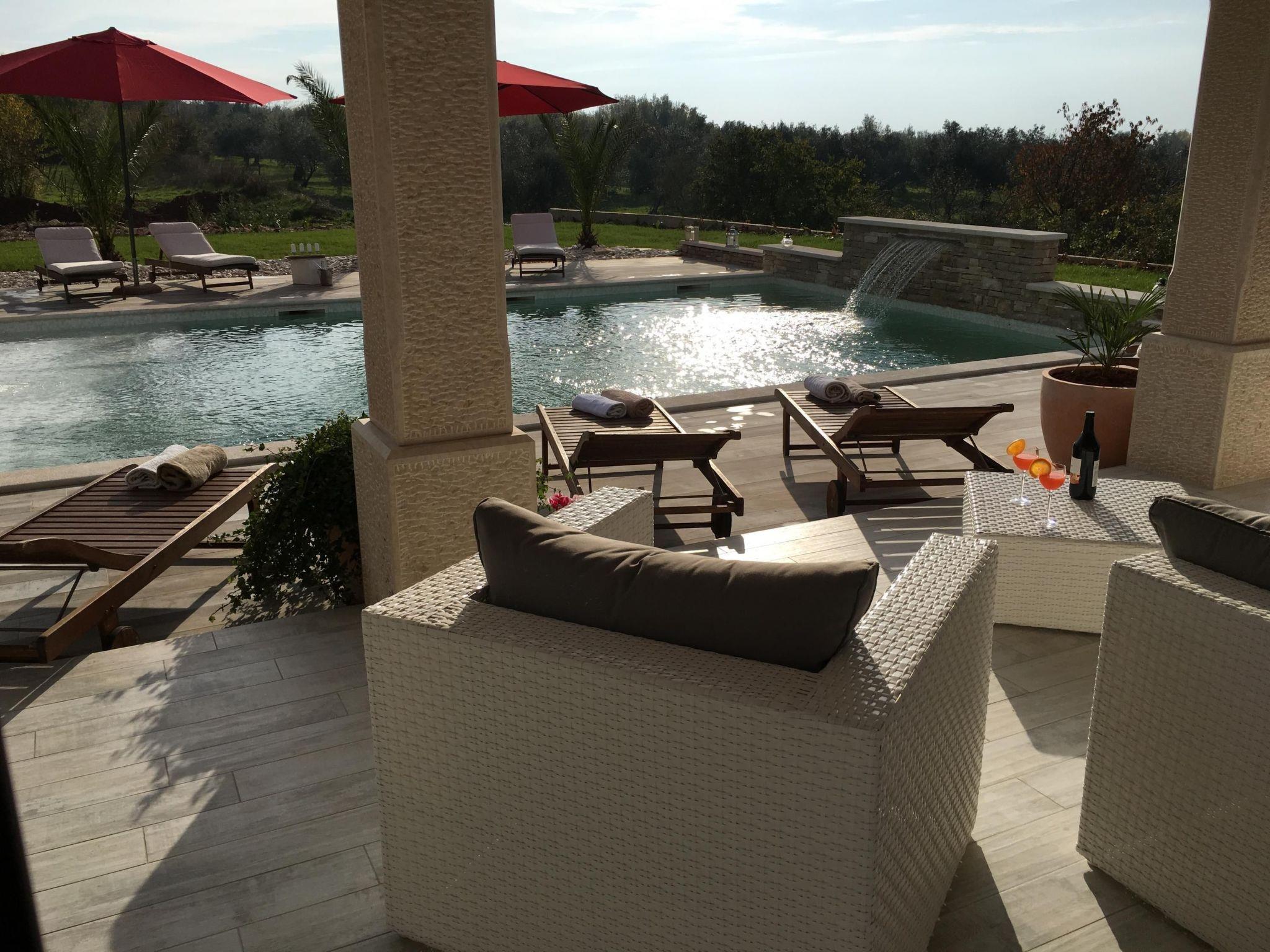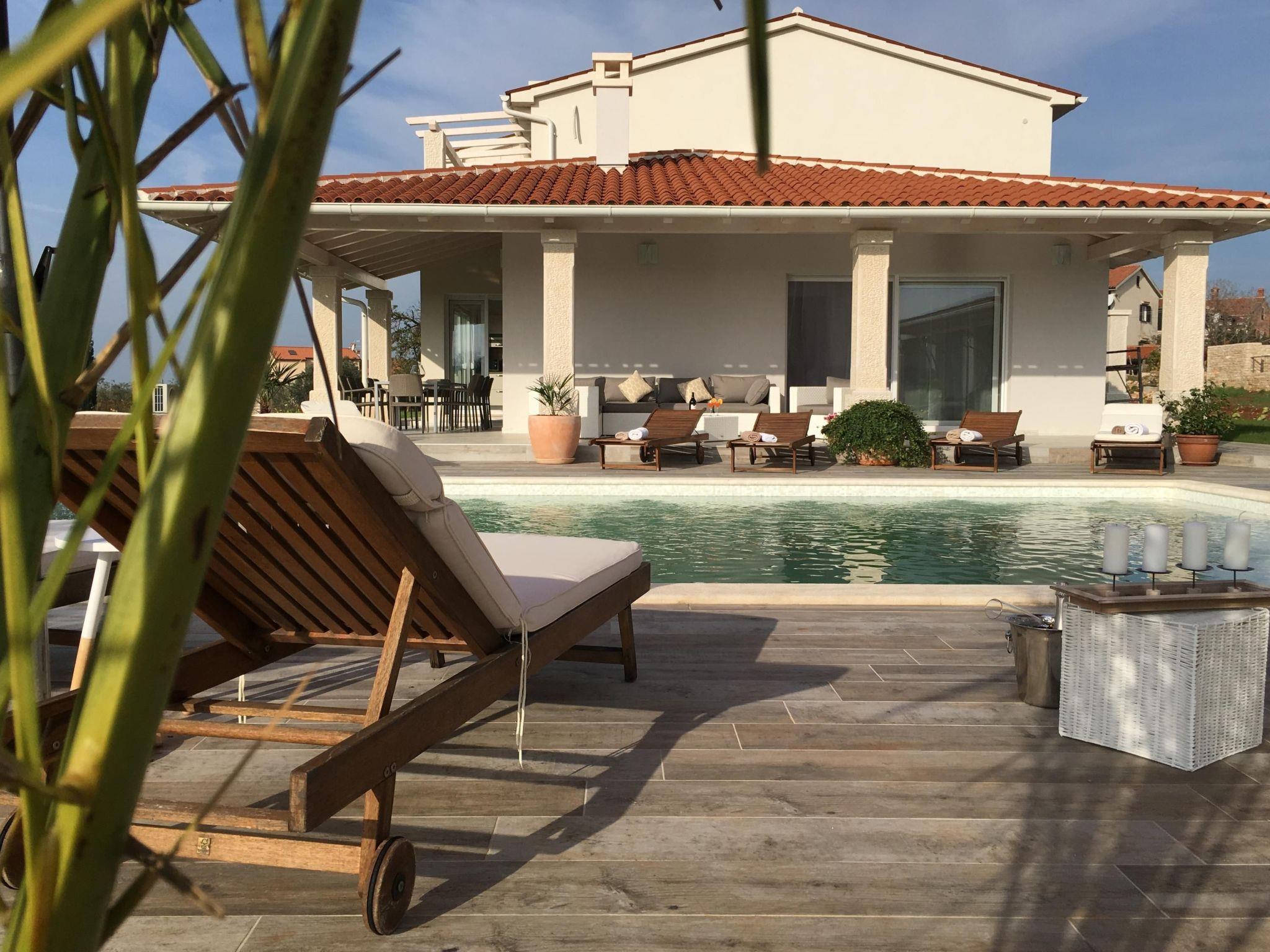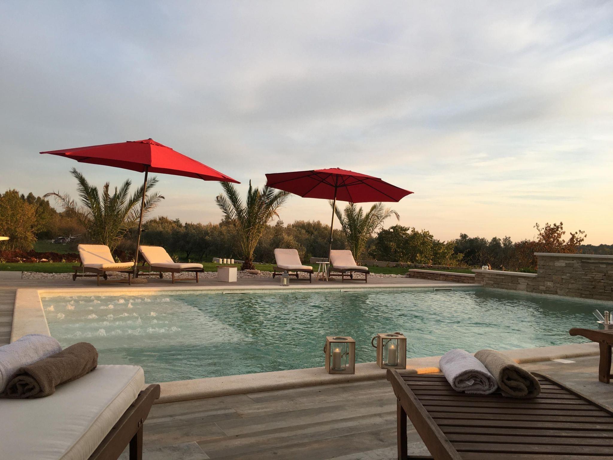 This fabulous white villa lies in Vodnjan, on the southern tip of the Istrian peninsula, near Pula, affording a view of the sea and the Brijuni Islands.