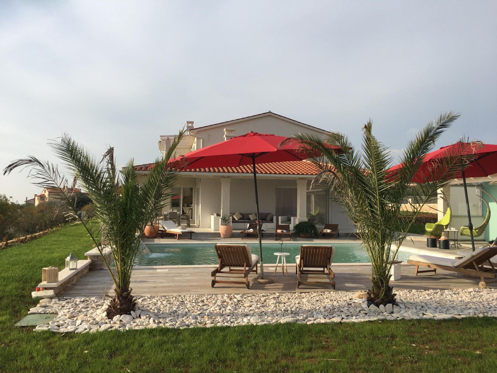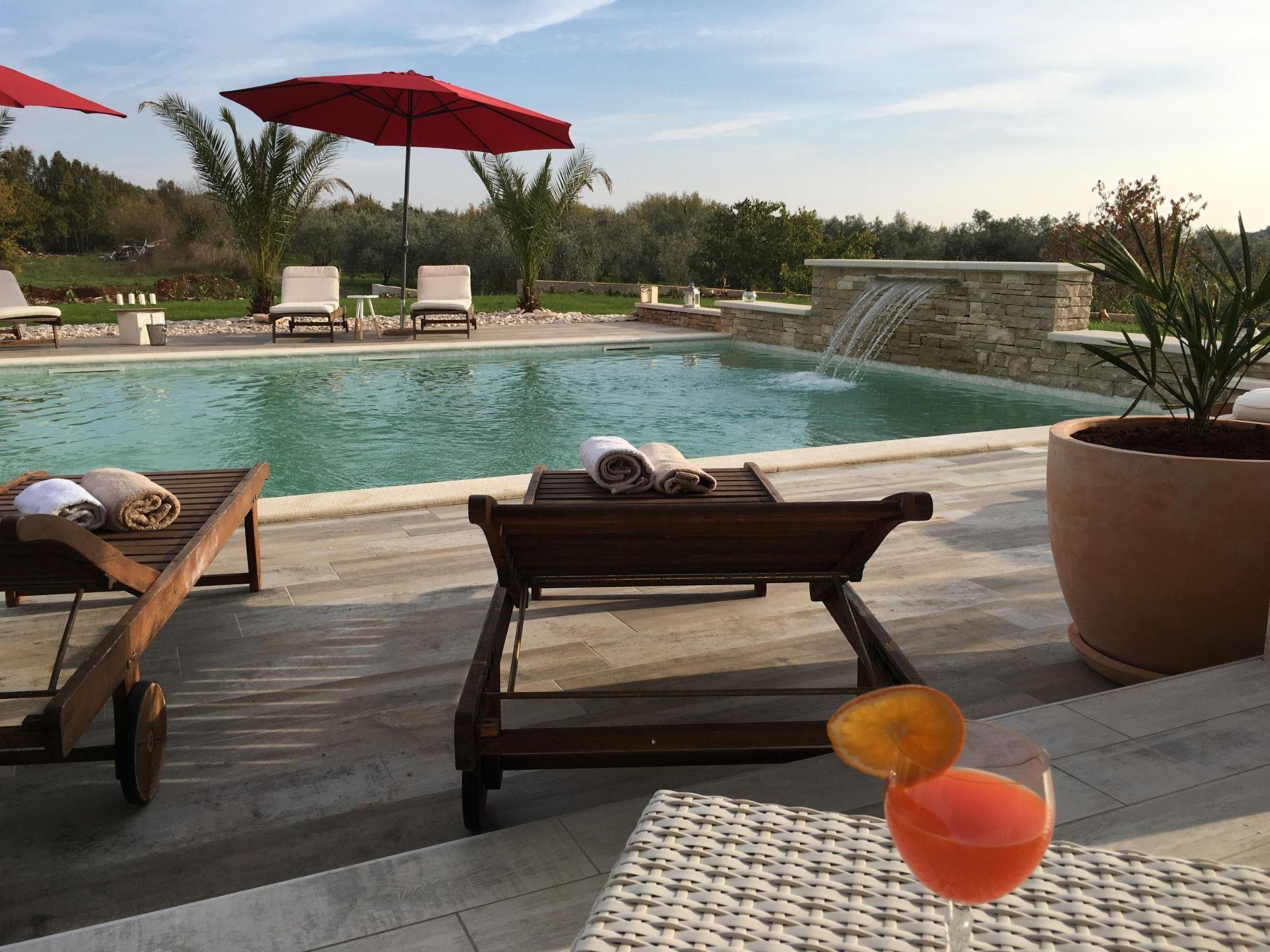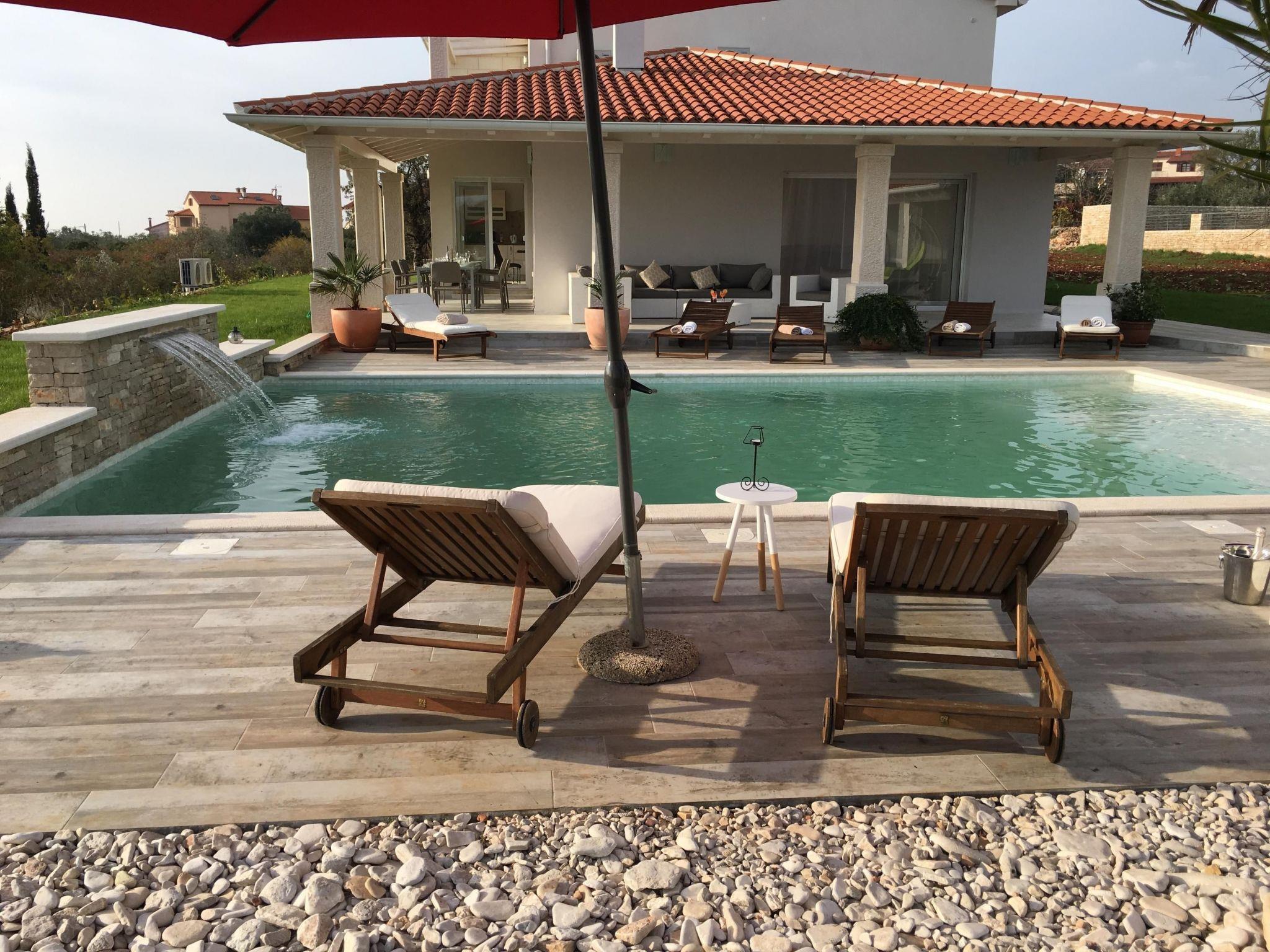 This fabulous white villa lies in Vodnjan, on the southern tip of the Istrian peninsula, near Pula, affording a view of the sea and the Brijuni Islands.