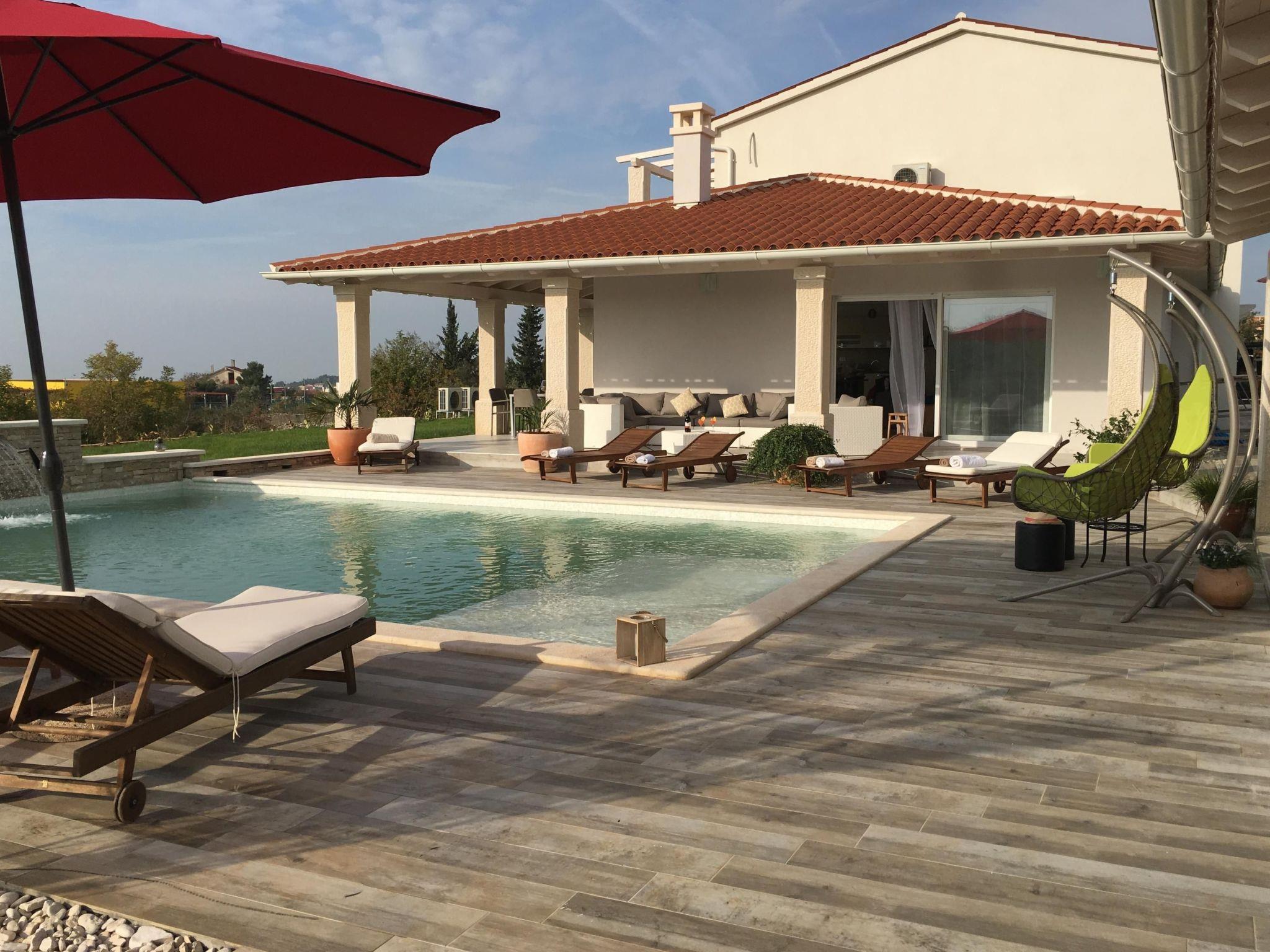 It was newly built in 2016 in a modern architectural style, paying attention to comfort and a touch of luxury, so that discerning guests will also feel comfortable here. The living space of around 450m² is spread over two floors. The lower floor of the villa comprises a total of three bedrooms, two with a double bed and an ensuite shower room, and one with two single beds and a bathroom next to it. There are a further four bedrooms with a double bed and ensuite bathroom, as well as a balcony, on the upper floor, accessed up stairs. All the bedrooms are equipped with air conditioning with a heating function and very good video and audio devices. The living room with elegant leather furniture and a flatscreen TV, is separated from the kitchen by large glass panes, so the whole room is pleasantly bathed in daylight. The modern kitchen block is fully-equipped and includes a dishwasher, a microwave and a coffee machine. In front of it there is a counter, perfect for breakfast or quick meals. There is also a large dining table with chairs. The living room and kitchen have air conditioning (cool/warm). Good-quality and free wireless Internet access is available in the villa and in the outdoor areas. Bed linen and towels are provided by the owner. A sofa in the living room can be pulled out as a double bed. Supplementary beds can also be set up in the spacious bedrooms, so that the villa can accommodate up to 18 people.