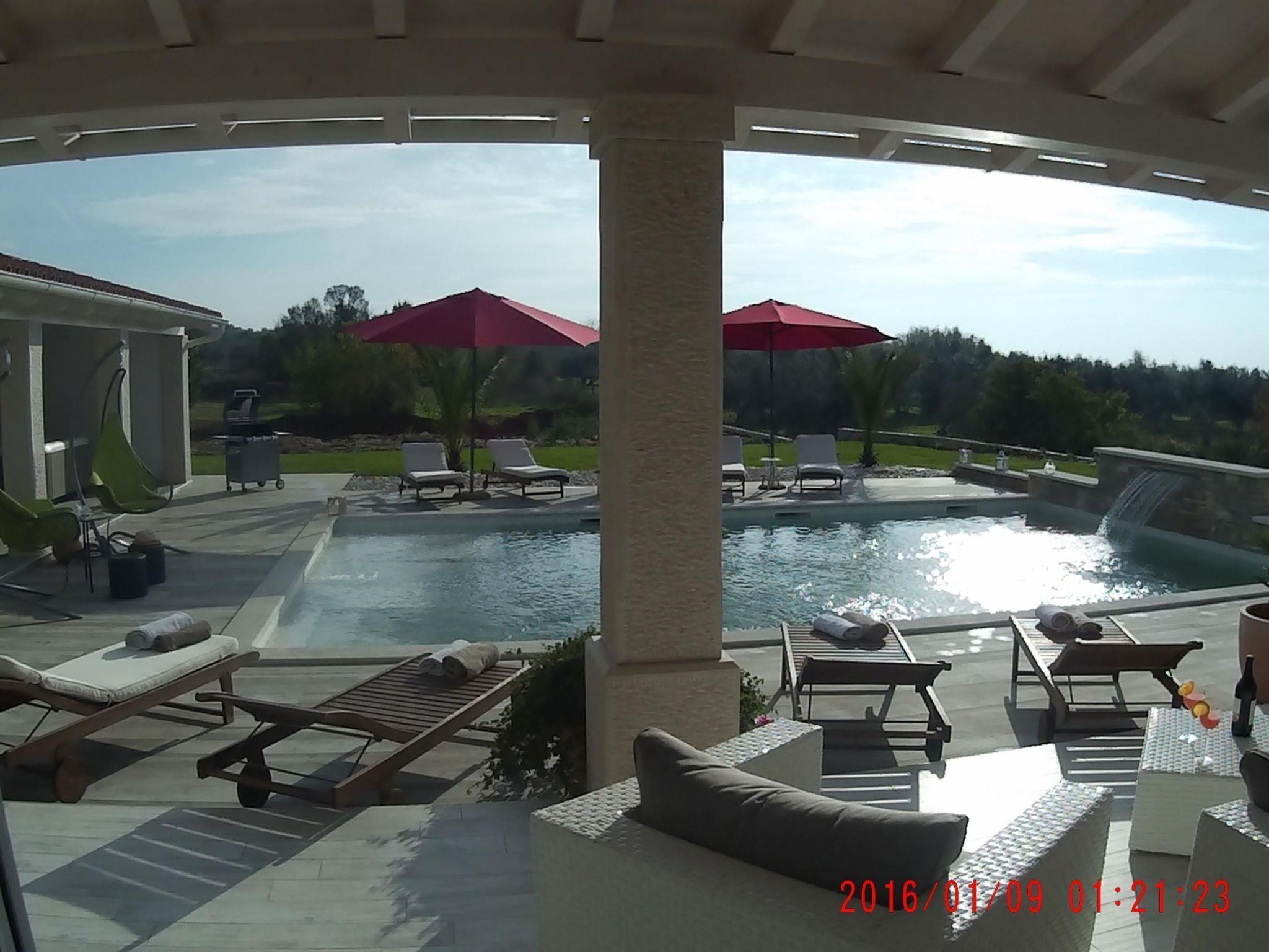 The villa has a fully-enclosed site of around 2000m² with a garden and a wonderful saltwater pool (60m²) with a waterfall and massage jets. The sunny terrace all around the swimming pool provides sun loungers, large parasols and swings. In front of the building there is a large veranda with a big dining table and chairs: an ideal place for enjoying meals and sitting together sociably in summer. Part of the veranda has comfortable wicker seating, a favourite spot for good conversations and for parents who want to keep an eye on their children in the pool. There is a barbecue for grill evenings under a starry sky. There are car parking spaces in the courtyard behind the villa.