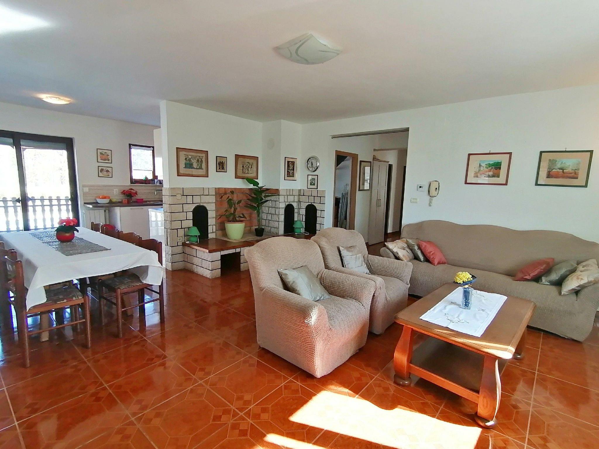 • open space living room with sitting couch and 2 arm chairs, dining table with 8 chairs, kitchen, exit to the garden and swimming pool