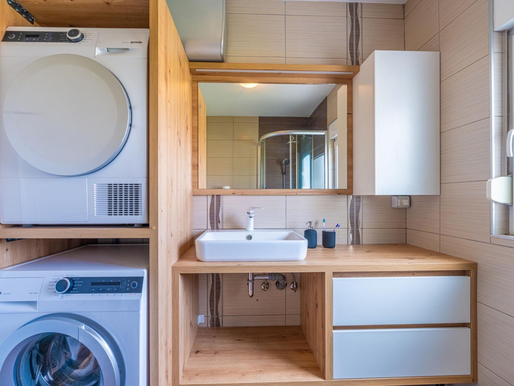two bathrooms with shower, one with bathtub. One bathroom has a dryer and a washing machine. : The kitchen is equipped with an oven, refrigerator, freezer, dishwasher and coffee machine. The living room has a comfortable sofa and TV.
