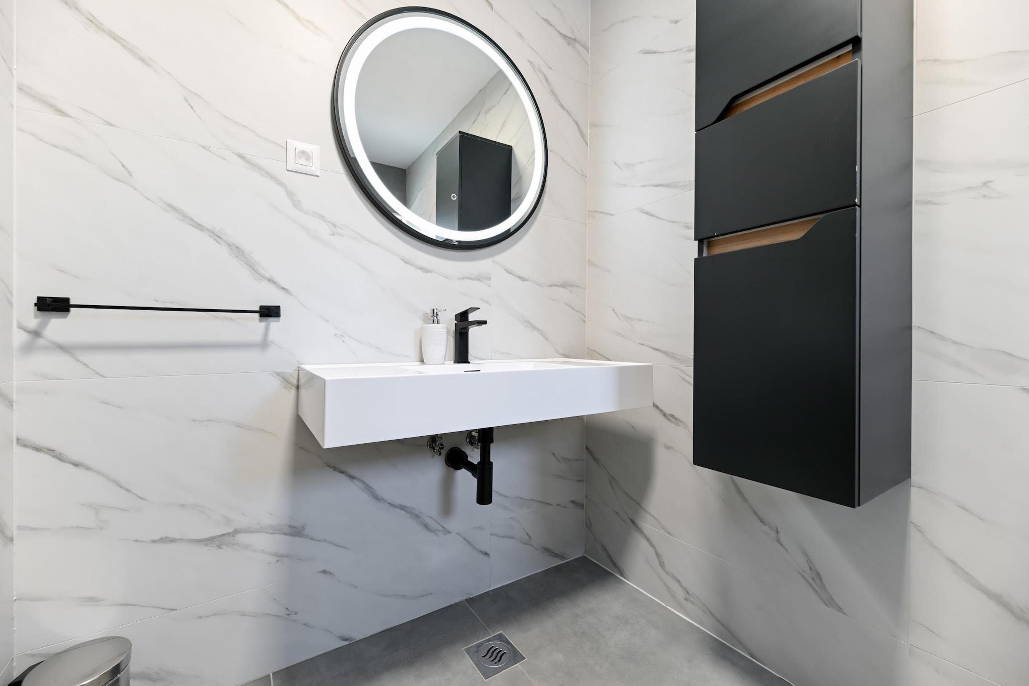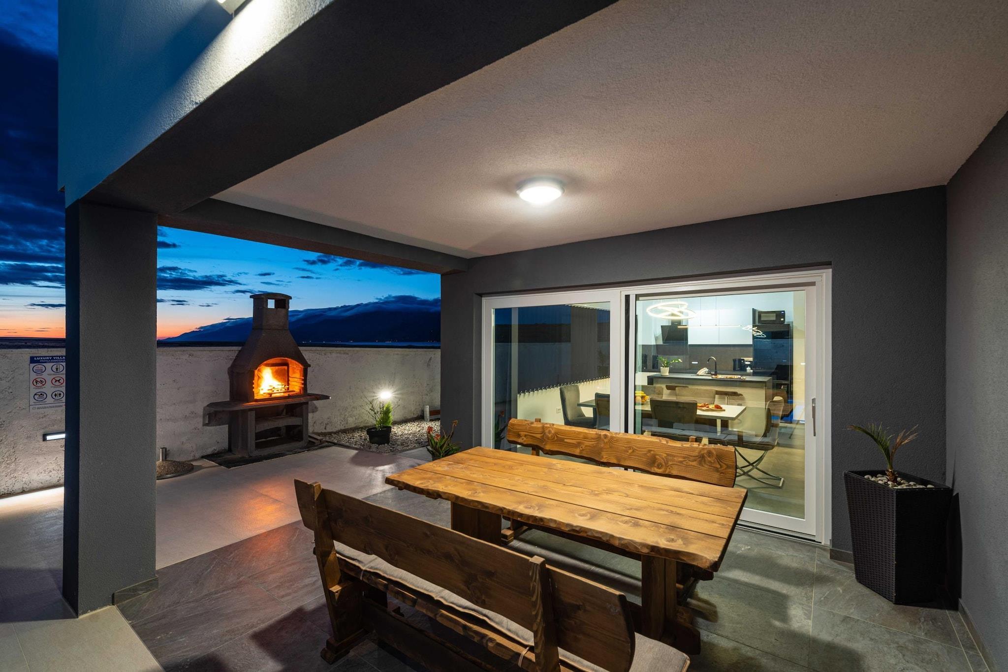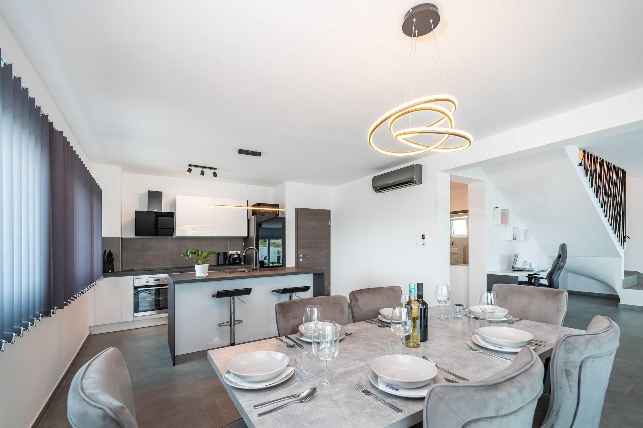 Denne fantastiske, nybyggede villa i Ražanac lover en perfekt blanding af luksus, privatliv og førsteklasses beliggenhed. Beliggende mindre end 200 meter fra den nærmeste strand, har denne smukke villa på 155 m² komfortabel plads til op til seks voksne og to børn. Du vil blive forkælet med en fantastisk panoramaudsigt over Adriaterhavet og den dramatiske Velebit-bjergkæde, som bedst nydes fra det private swimmingpoolområde eller balkonen ovenpå. Interiøret er moderne, lyst og usædvanligt veludstyret med aircondition i hele villaen. Villaen kan prale af tre dejlige soveværelser med aircondition, hver med eget badeværelse (i alt tre badeværelser plus et ekstra toilet). Sovepladserne inkluderer to kingsize-senge, en queensize-seng og en enkelt sovesofa. Den rummelige, åbne stue/spisestue og det fuldt udstyrede køkken (med induktionskogeplade, opvaskemaskine, ovn og stort køleskab/fryser) er problemfrit forbundet med udendørsområdet. Gården er sikkert indhegnet med høje mure, hvilket sikrer total privatliv, så du kan nyde poolen, liggestolene og den overdækkede terrasse med grillfaciliteter. Villaen er ideelt placeret til både afslapning og eventyr. En fem minutters gang fører til lokale restauranter, caféer og købmandsforretninger. Naturelskere kan udforske Nationalparken Paklenica, kun en halv time væk. Historiske Zadar ligger 20 minutters kørsel derfra, og øen Pag ligger ca. 10 km over en bro. NP Krka og NP Plitvicesøerne ligger også inden for en times kørsel. Bemærk venligst, at rygning og kæledyr ikke er tilladt, og grupper af unge (under 25 år) accepteres ikke.