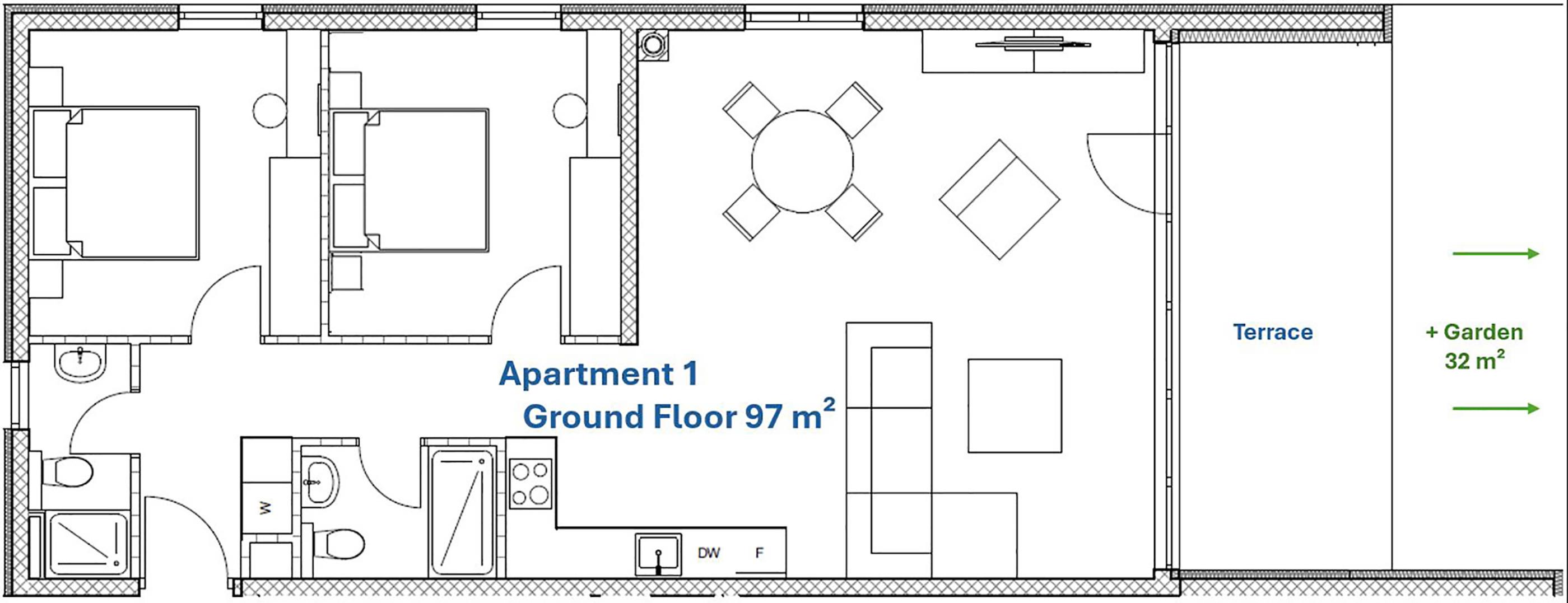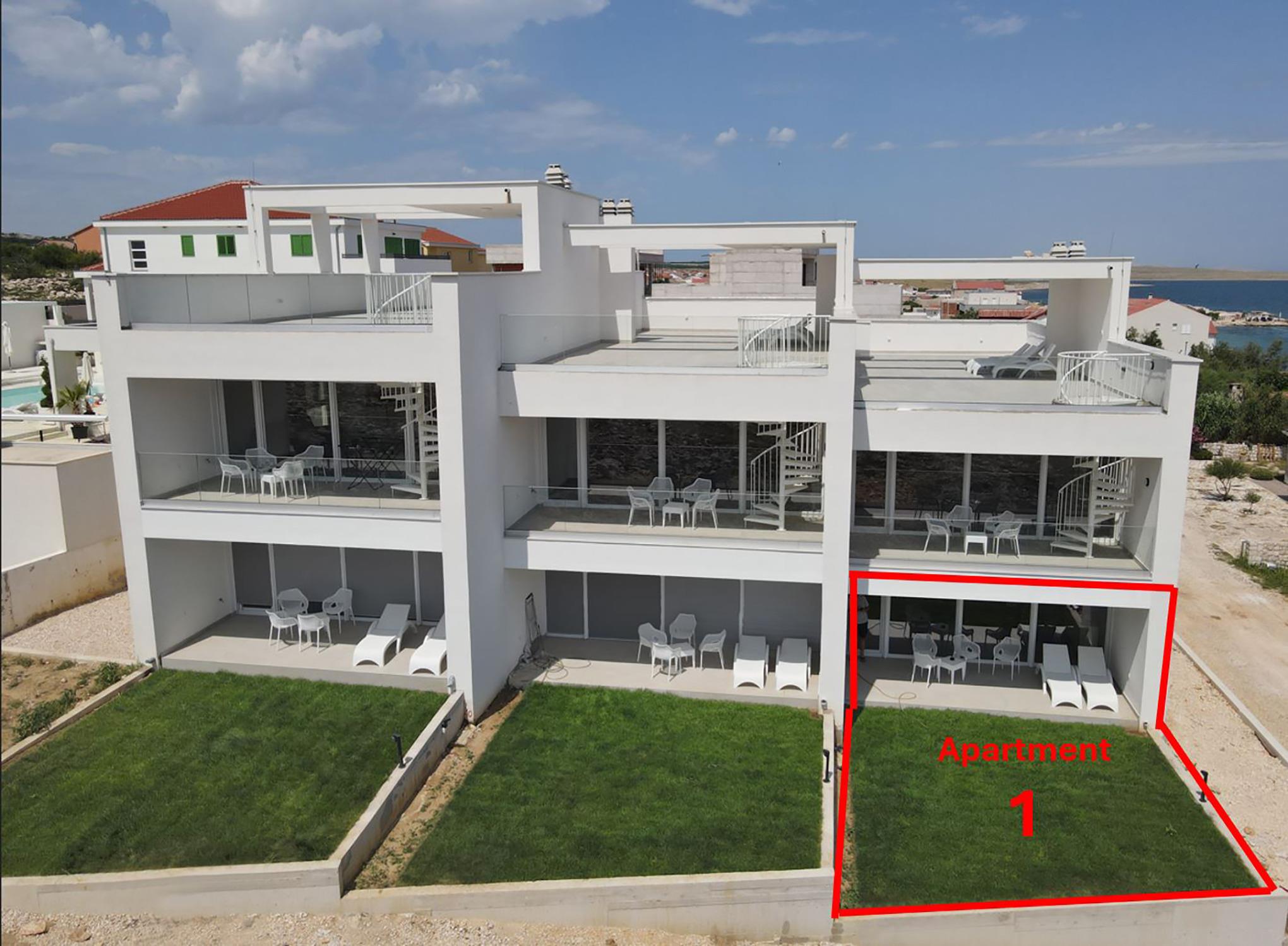 Dieses Apartment Nautica 1 ist im Erdgeschoß von vorne gesehen ganz rechts.