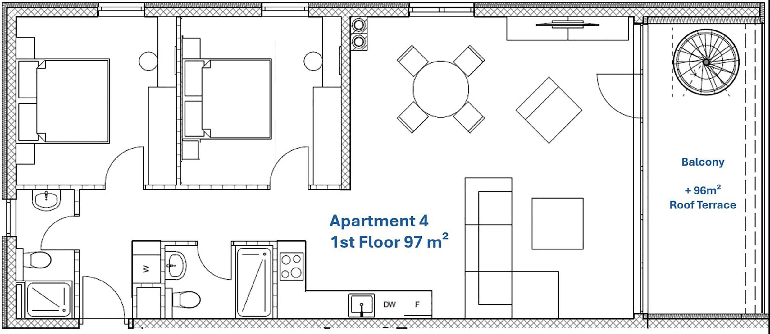 Die zwei Bäder pro Apartment sind edel, aber effizient konstruiert und haben eine extra breite Dusche.