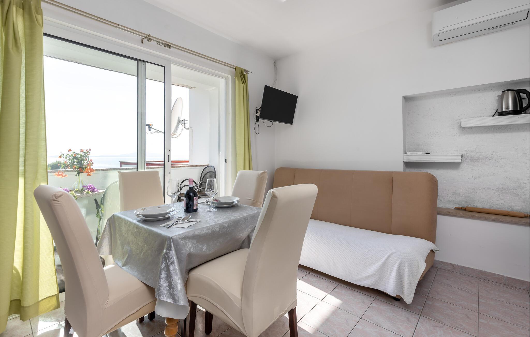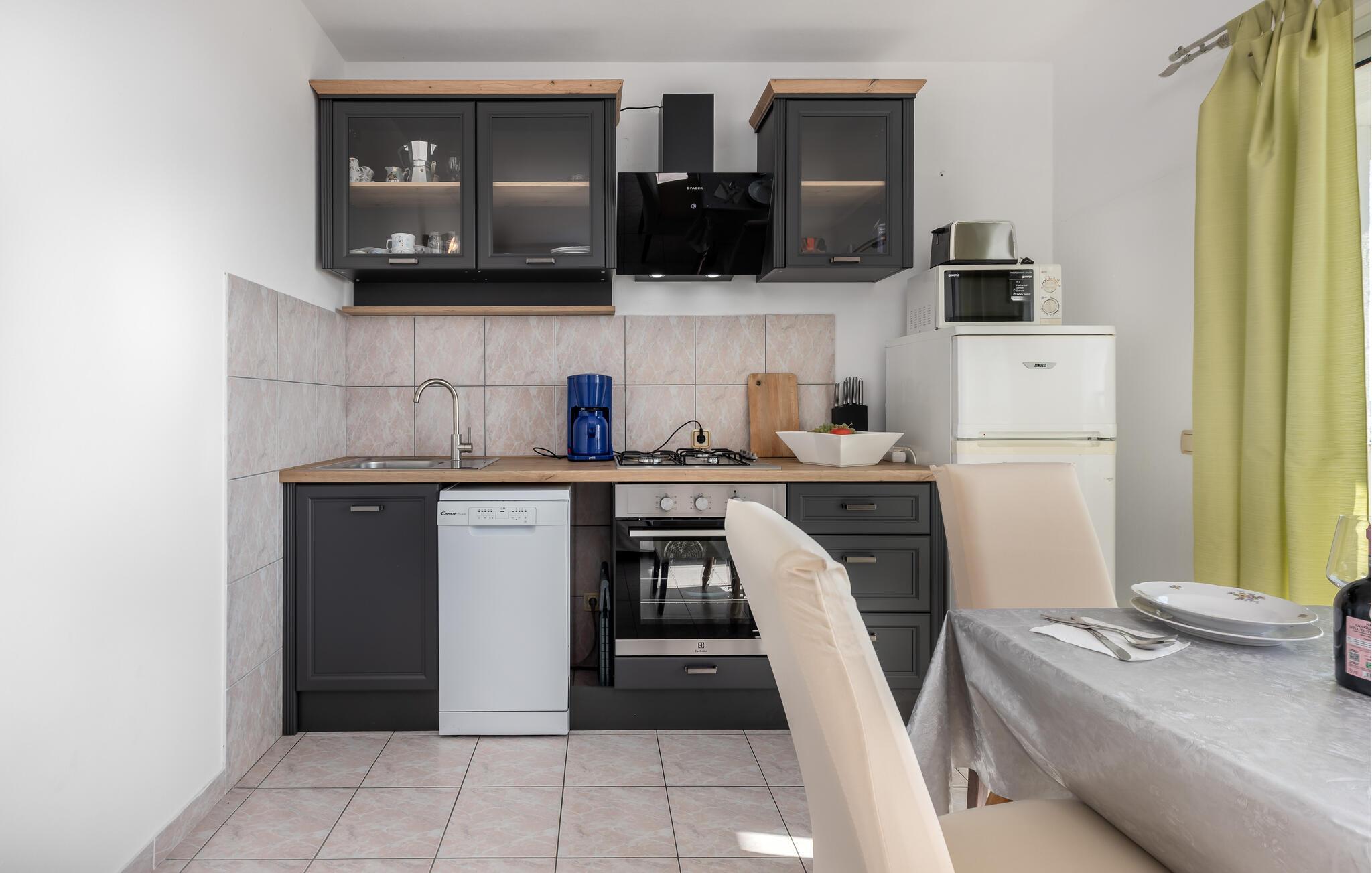 Denne maleriske lejlighed på øen Rab er perfekt til en pause fra hverdagen. Slap af med en kop kaffe i den smukke opholdsstue, hvis store vinduer lukker masser af klart lys ind. Lav planer for den kommende dag eller afhold en lille madlavningskonkurrence for to i det praktiske køkken.