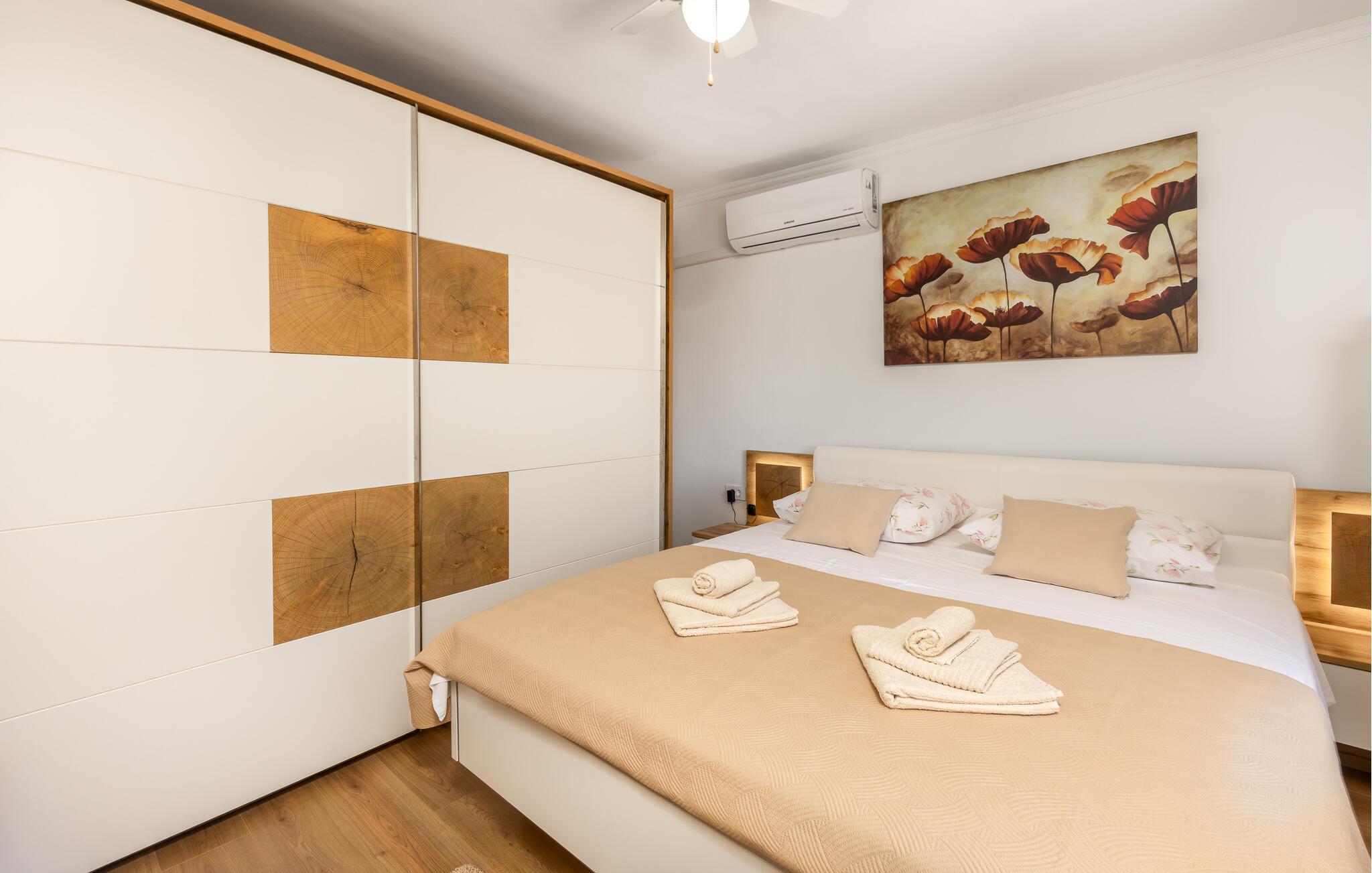 I dette smagfulde feriehus på øen Rab kan I nyde en pause med en vidunderlig udsigt over havet. De lyse værelser skaber en behagelig atmosfære, mens den stilfulde indretning kombinerer komfort og velvære. I kan tilberede kulinariske lækkerier i det veludstyrede køkken med udsigt over vandet og øen. De komfortable værelser lægger op til at slappe af.
