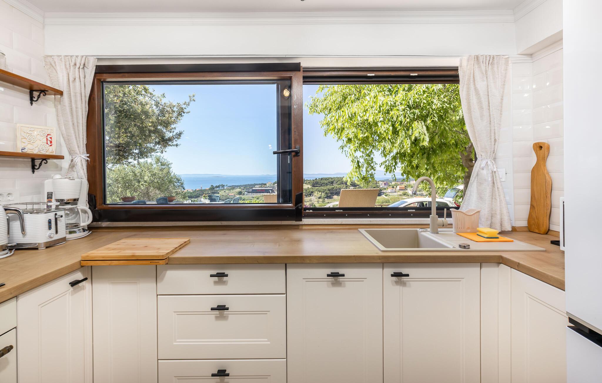 Nyd en afslappende ferie i dette lyse feriehus med fantastisk havudsigt.