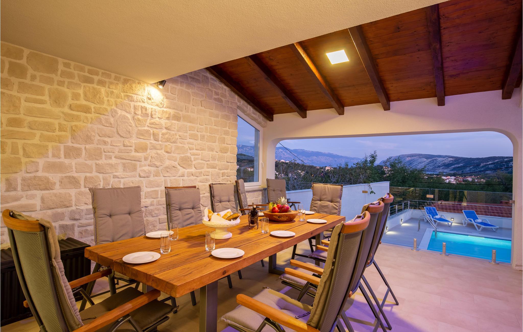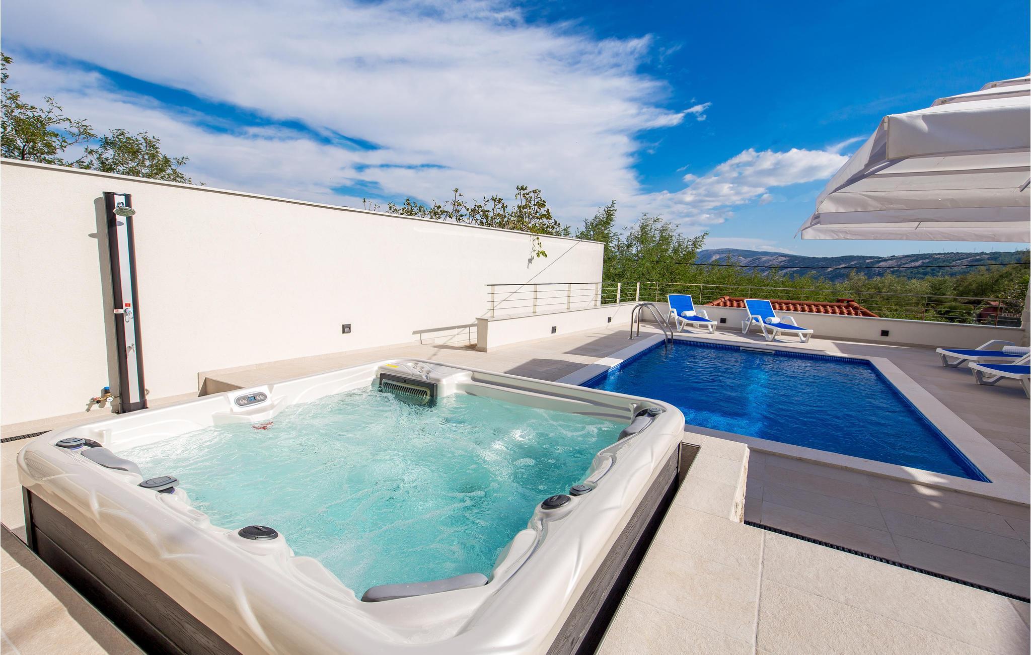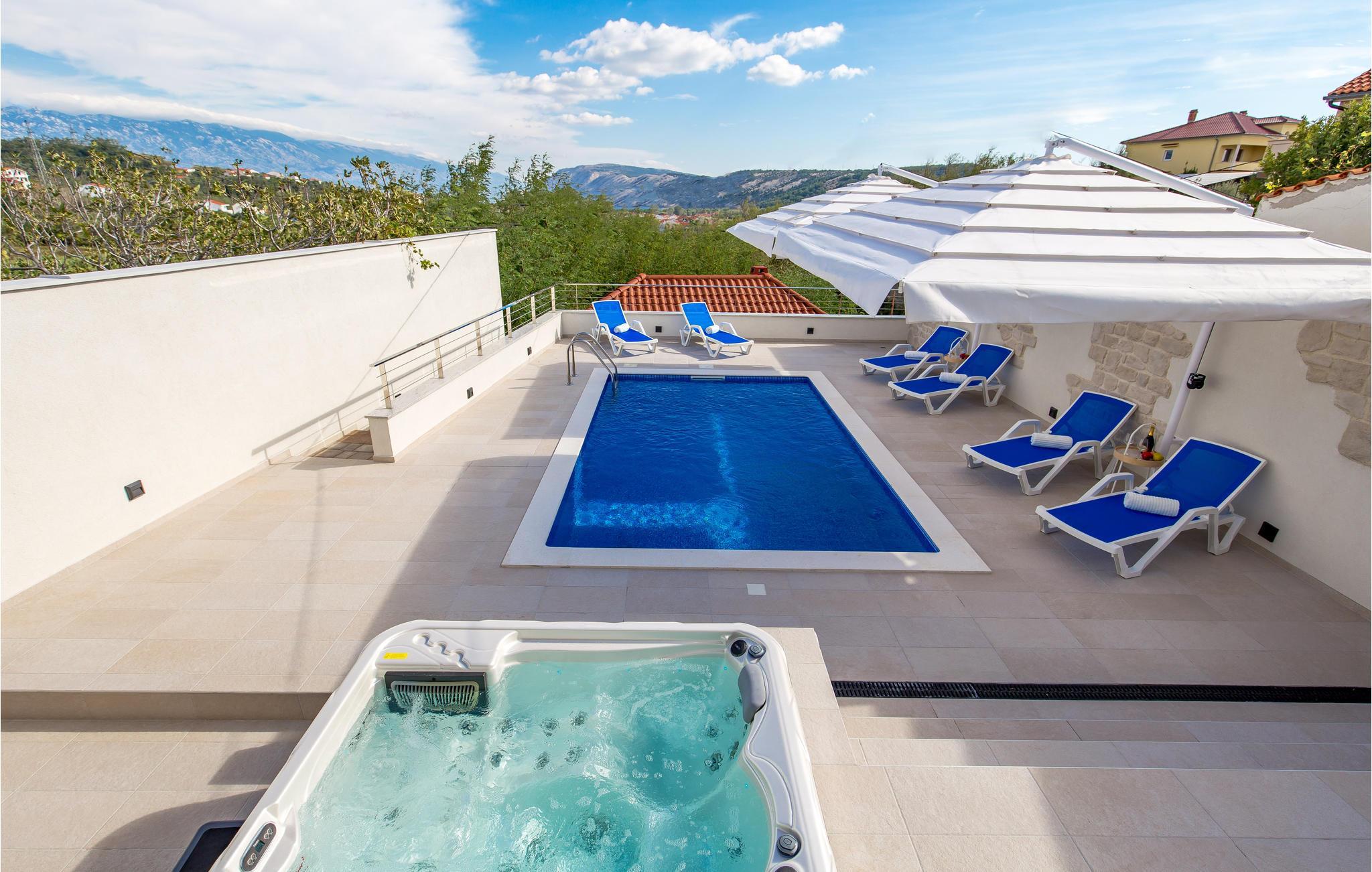 På den paradisiske ferieø Rab, i byen Lopar, ligger dette vidunderlige feriehus med pool og delvis udsigt til havet. Dette drømmeskønne hus, lader intet ønske åbent. Ud over den store terrasse, den forfriskende private udendørs pool og whirlpoolen på den indhegnede grund, er husets indre, der er smukt møbleret og gennemstrømmet af lys, også et skønt sted at opholde sig. Her er der en overdækket terrasse med grill, der ligger lidt fra huset hvor I kan tilberede lækker mad til hele familien og spise den udendørs. I bor helt fantastisk godt, i gåafstand af de fantastiske sandstrande. I løbet af ferien kan I gå på jagt efter øens skønne hemmelighedsfulde bugter og finde den der passer jer bedst. Der er gode færgeforbindelser fra fastlandet og om sommeren kan I se frem til mange former for underholdning. Øens største by hedder også Rab, hvor der er mange kulturhistoriske seværdigheder. Lopar er meget populær blandt børnefamilier pga sin sandstrand ud til lavt vand, den kaldes også Paradisstranden og indbyder til skønne badedage under den varme sol. Maleriske bugter, klart vand, historiske byer og kulturelle seværdigheder er alt sammen noget, I kan glæde jer til når I holder ferie på øen Rab.