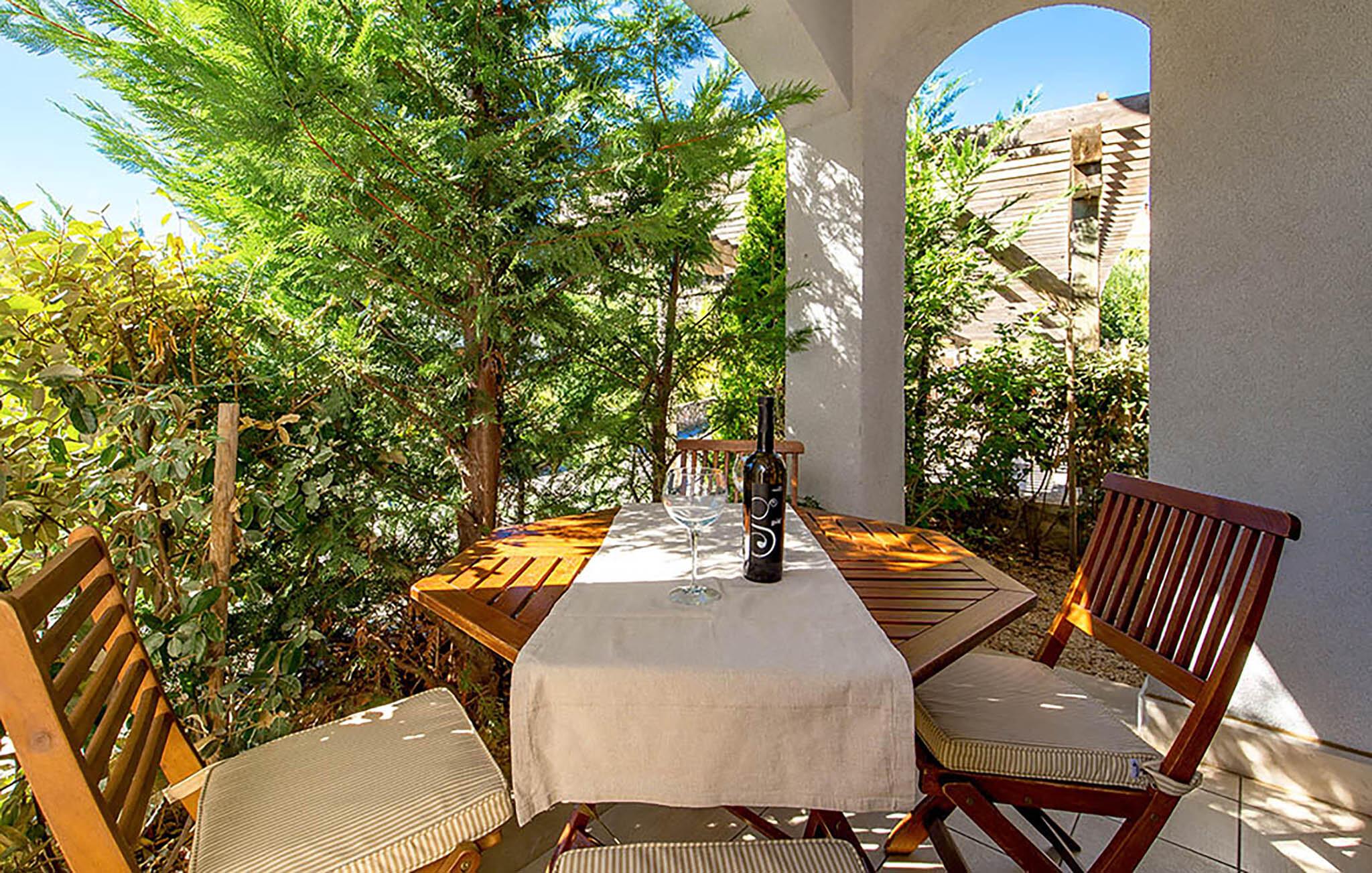 Oplev afslappende dage i denne komfortable ferielejlighed med adgang til poolen. Tilbring en afslappende ferie i denne lyse lejlighed, der charmerer med sine smukke træelementer og indbydende atmosfære. Den venter sine gæster tæt på havet. I den indbydende opholdsstue indbyder sofaen til afslapning; hyg jer sammen efter en dejlig dag på stranden. Gå fra stuen ud på terrassen, nyd en afslappet morgenmad og slap af i solen, kun afbrudt af forfriskende dukkerter i den fælles pool. Om aftenen kan I samle familien til en lækker grillfest. Gå en tur langs Palit-promenaden og nyd udsigten over Rabs gamle bydel. Oplev de små bugter og svøm i Adriaterhavets klare vand. Besøg Rabs gamle bydel med dens fire karakteristiske kirketårne. Gå en tur gennem de smalle gader, beundr den venetianske arkitektur, og stop ved en af de mange caféer eller restauranter. Udforsk Komrcar Park, der ligger lige over den gamle bydel. Gå en tur gennem fyrreskove og nyd skyggen og havudsigten.