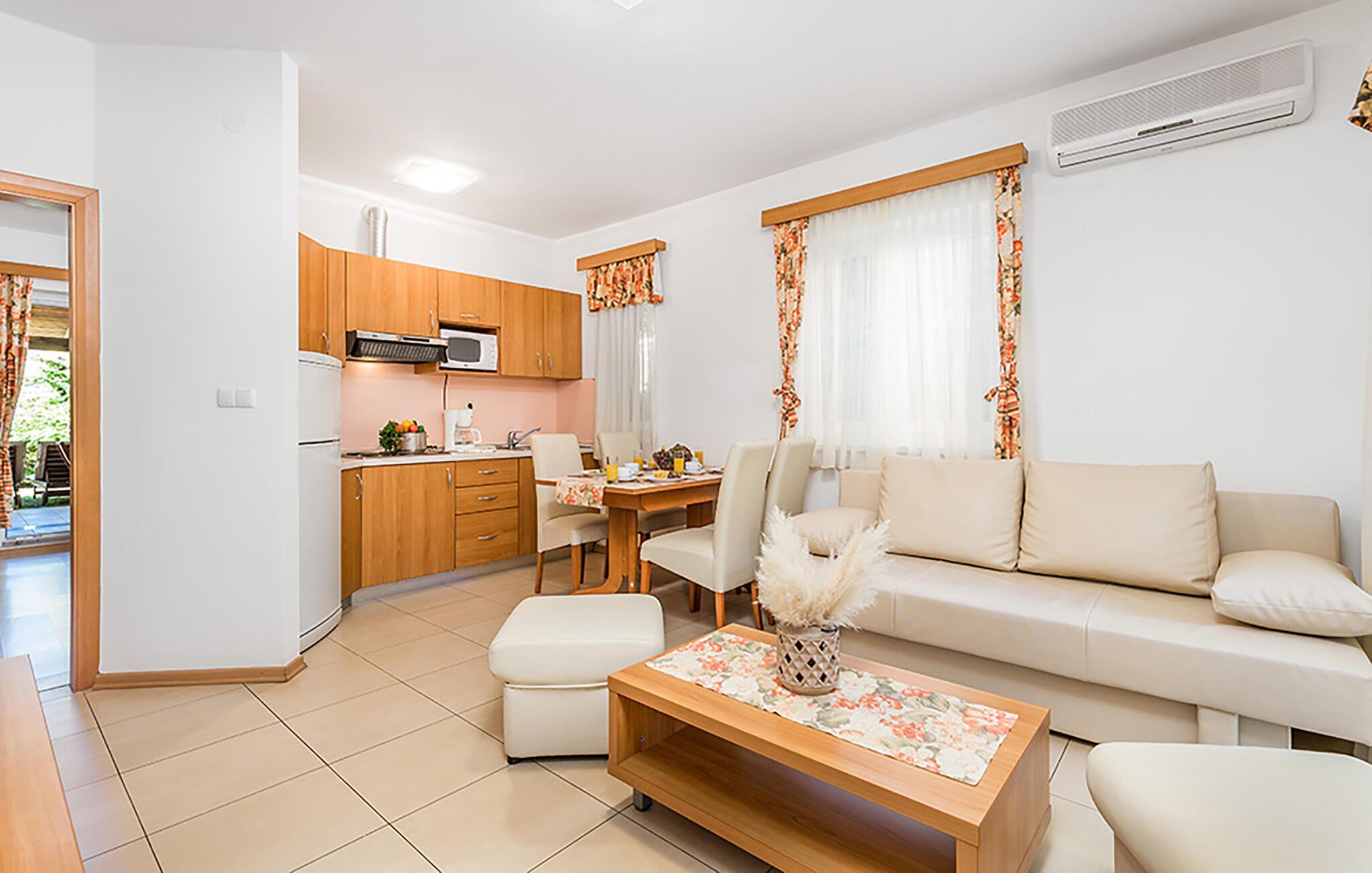Nyd en afslappende ferie i denne komfortable lejlighed med adgang til poolen. Væk fra sommerens folkemængder, men alligevel tæt på smukke strande, venter denne lyse og indbydende lejlighed på jer. Tilbered kroatiske retter sammen, planlæg jeres udflugter over afslappende måltider, og efter en lang dag kan I hygge jer sammen i sofaen med en god bog eller tilbringe en aften med sjove spil. Jeres dejlige overdækkede terrasse er det perfekte sted til morgenmad. Bagefter kan I forfriske jer i den smukke fælles pool, lade op på behagelige liggestole, få nye venner ved grillen og afslutte dagen med et glas vin under åben himmel. Gå en tur langs promenaden ved bugten fra Soline til Rab og vandr gennem den charmerende gamle bydel. Snorkel i det krystalklare vand ved uberørte strande, prøv regionale specialiteter på en af de mange restauranter, og fordyb jer i det pulserende natteliv. Udforsk kysten med båd og nyd en drink på en hyggelig strandbar, mens solen går ned.