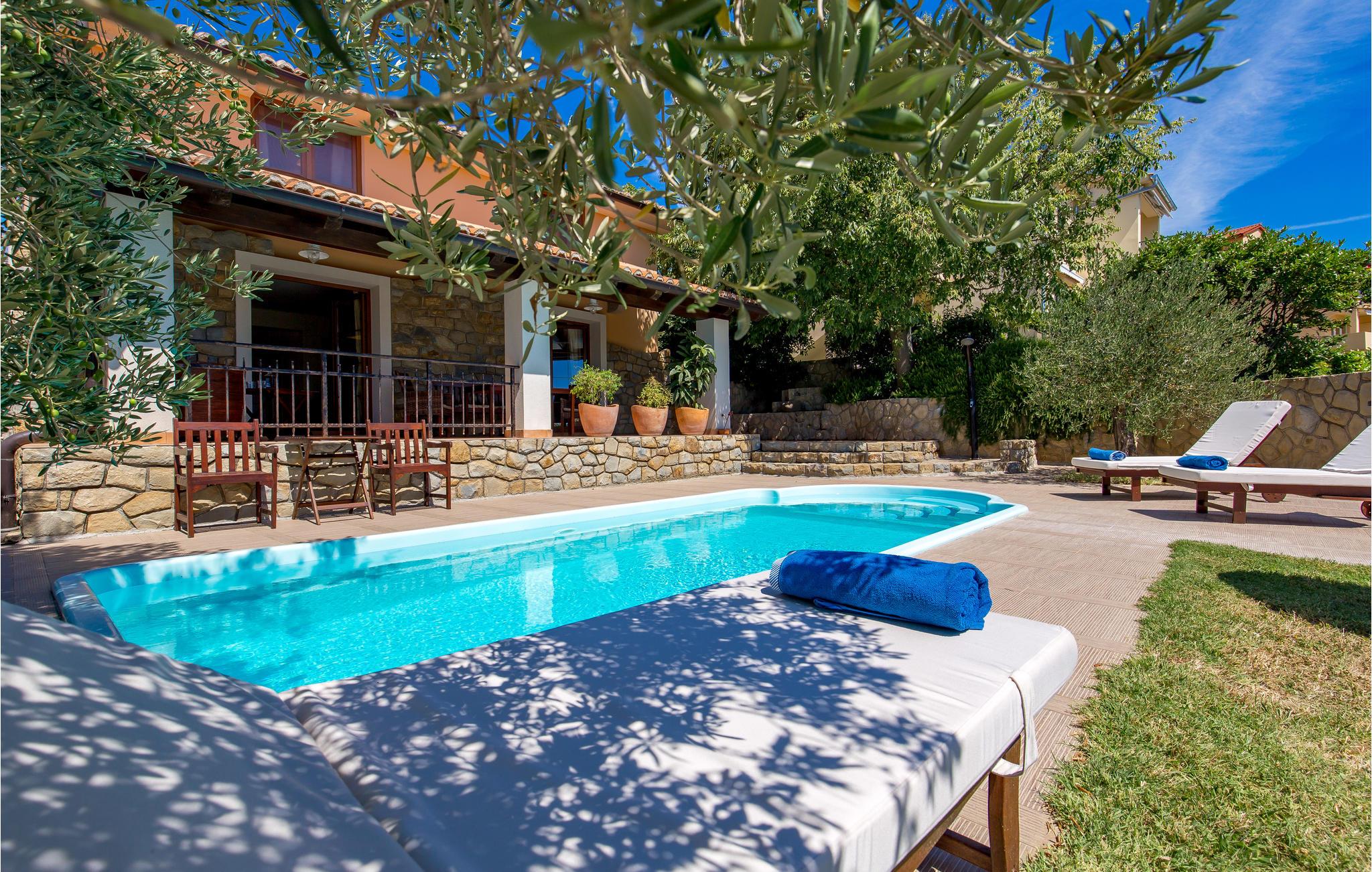 Dette nænsomt renoverede hus ligger på øen Rab, i et roligt område. Fra huset har I en smuk panoramaudsigt over ud havet og byen Rab. I kan slappe af på liggestolene eller tage en dukkert i swimmingpoolen på de varme dage. Huset har to etager, forbundet af indvendige trapper. På 1. sal finder I soveværelserne og stort badeværelse. I stueetagen er køkken, spisestue og et badeværelse. På terrassen bag huset i skyggen, kan I læse en bog eller spille kort. I byen Rab, finder I mange restauranter, butikker og gallerier. Eller besøg den smukke strand i Sv. Euphemia Bay. Den venlige ejer bor i nærheden i et separat hus og ser frem til at byde jer velkommen. Han står gerne til rådighed såfremt I har spørgsmål, eller ønsker gode råd til hvad I skal se i løbet af jeres ophold. Et dejligt hus til en skøn afveklsende ferie.