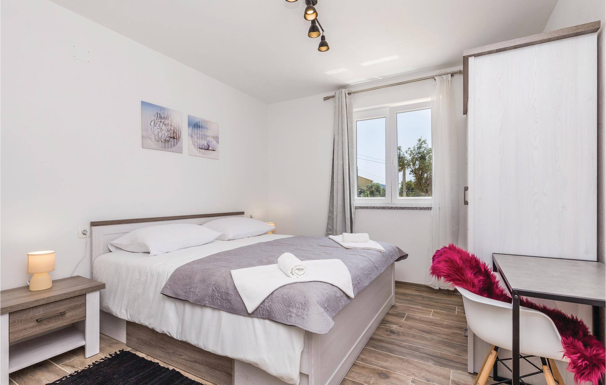 I byen Supetarska Draga, på den solrige ø Rab, ligger dette feriehus med en skøn udsigt over havet og landskabet som et perfekt rejsemål, til jer der vil holde en behagelig ferie. I stueplan er der to soveværelser og et badeværelse som er indrettet til handicappede, mens de to resterende badeværelser ligger på første sal. Husets to etager er forbundet med en ydre trappe.