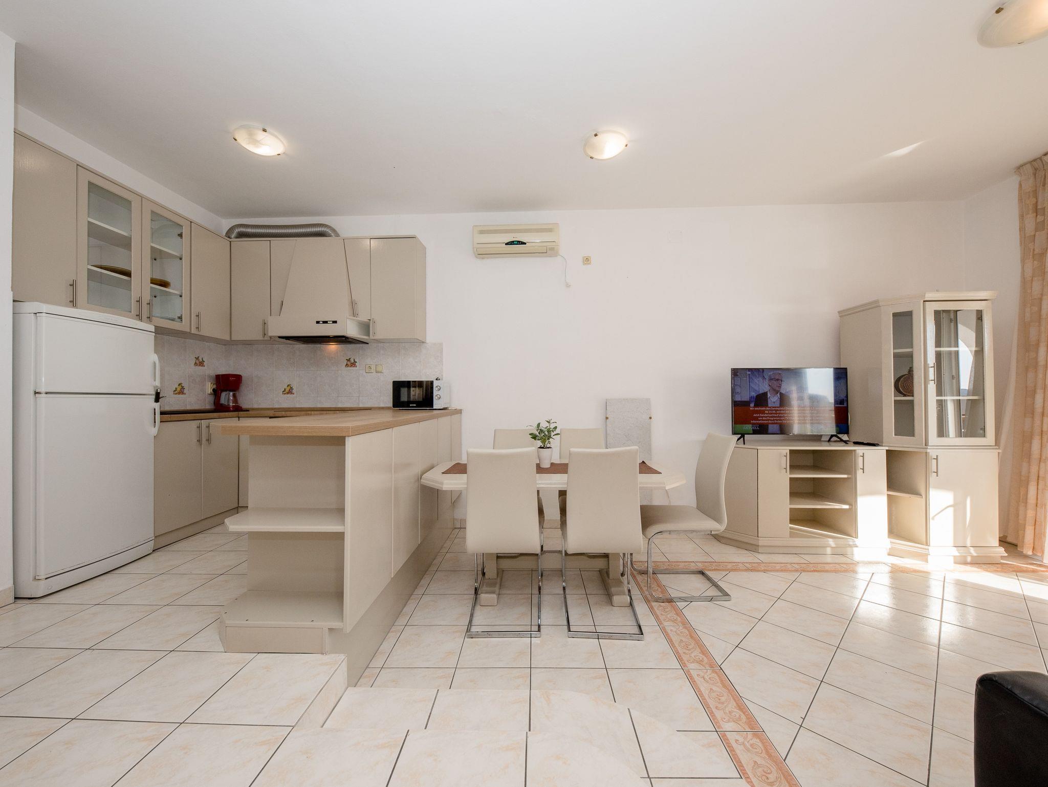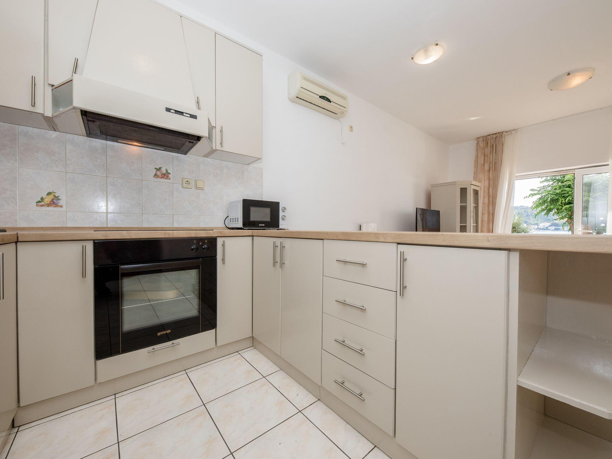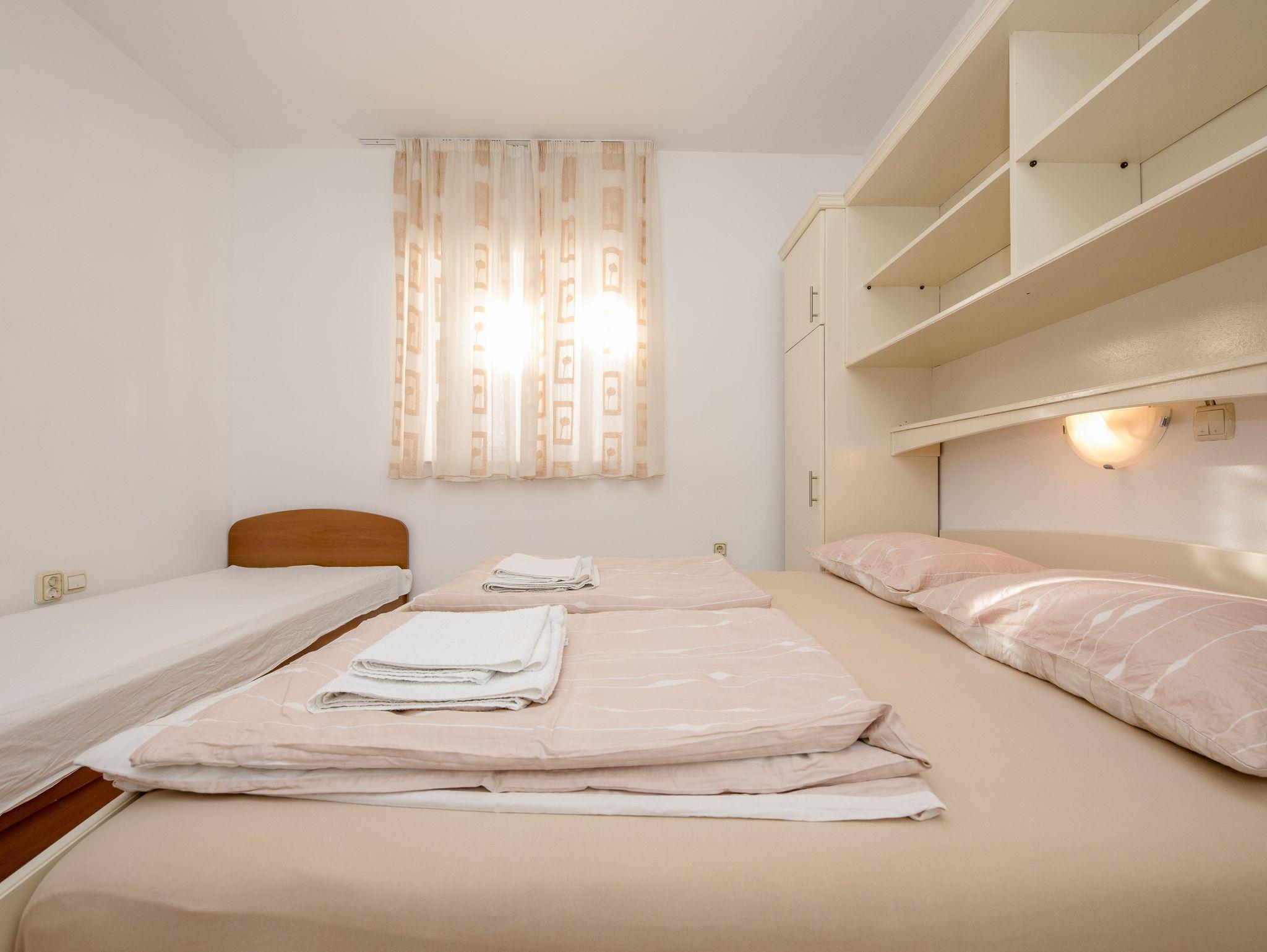 Ferienwohnung bietet Platz für 4 Gäste. Die Betten sind in Schlafzimmern, die es 2 gibt, innerhalb einer Gesamtfläche von 60m2, angeordnet. Die Gäste haben eine eigene Terrasse zur Verfügung, auf der sie in warmen Sommernächten genießen können. Das Apartment bietet Meerblick. Es ist erlaubt, Speisen auf dem Gemeinschafts-Grill vorzubereiten. In der Unterkunftseinheit besteht die Möglichkeit des Mitbringens von Haustieren gegen Aufpreis. IM PREIS INBEGRIFFEN: Kurtaxe, Endreinigung, Klimatisierung, Parkplatz, Internet, tragbarer Grill, Sonnenschirm, Liegestühle. VERBINDLICHE ZUSÄTZLICHE KOSTEN: Aufzahlung für Kurzaufenthalte (prozentualer Zuschlag pro Nächtigungsanzahl: 30% - 1, 20% - 2, 10% - 3). UNVERBINDLICHE ZUSÄTZLICHE KOSTEN: Wäschewaschen (5,00 € Waschen), Boot (160,00 € pro Nacht), Bootsanlegeplatz (20,00 € pro Nacht), Haustiere (5,00 € pro Nacht). Die Verfügbarkeit zusätzlicher Dienstleistungen in Ihrem reservierten Termin und die Preise derselben (falls nicht aufgeführt) müssen im Voraus überprüft werden. Zusätzliche Dienstleistungen die in der Zahlungsaufforderung nicht aufgeführt sind werden direkt beim Vermieter bezahlt, angenommen der Gast nutzt auch diese.