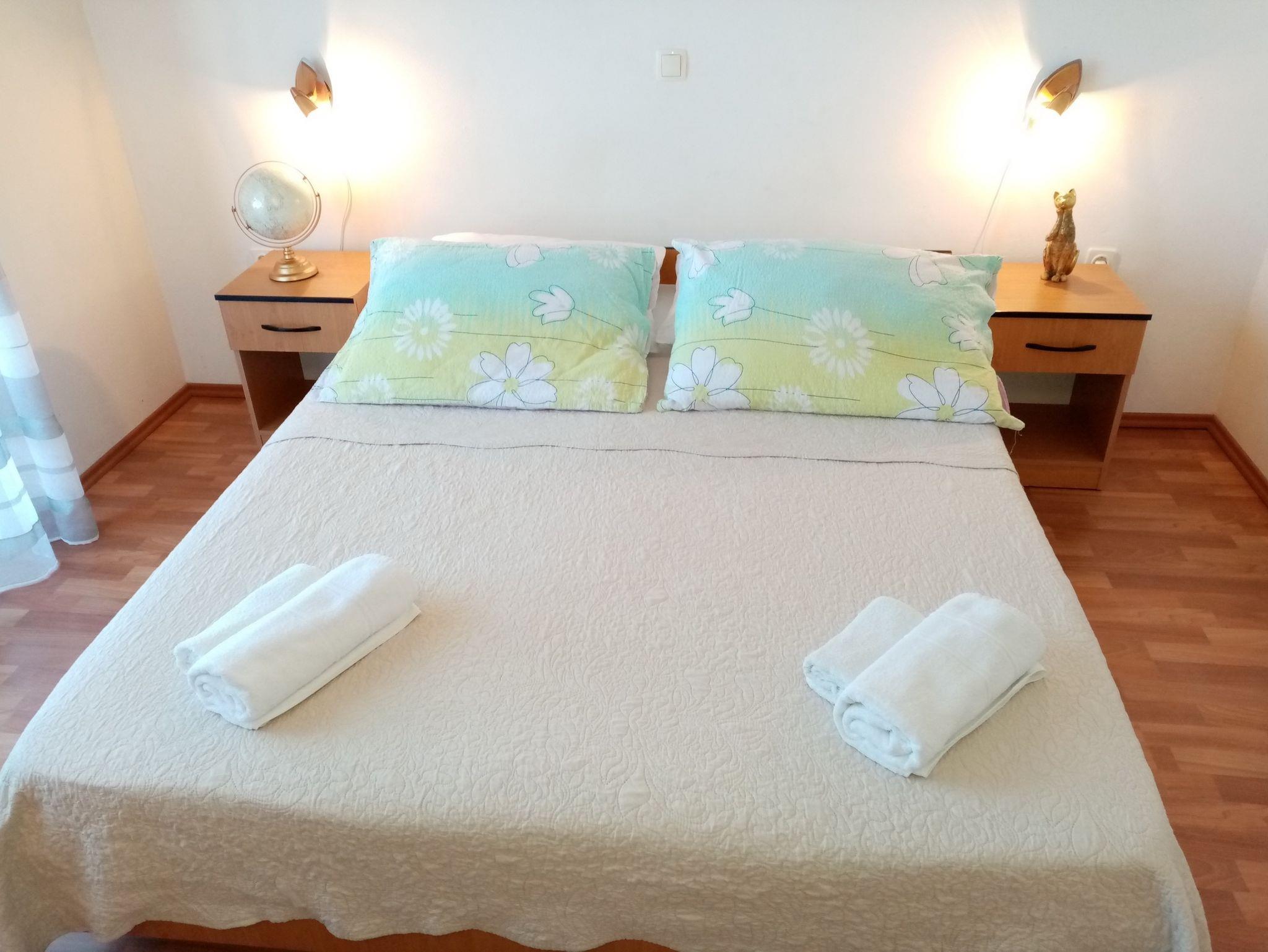 Ferienwohnung bietet Platz für 5 Gäste. Die Betten sind in Schlafzimmern, die es 2 gibt, und in Wohnzimmer, innerhalb einer Gesamtfläche von 52m2, angeordnet. Die Gäste haben einen eigenen Balkon zur Verfügung, auf der sie in warmen Sommernächten genießen können. Das Apartment bietet Meerblick. Es ist erlaubt, Speisen auf dem Gemeinschafts-Grill vorzubereiten. IM PREIS INBEGRIFFEN: Kurtaxe, Endreinigung, Klimatisierung, Internet. VERBINDLICHE ZUSÄTZLICHE KOSTEN: Aufzahlung für Kurzaufenthalte (prozentualer Zuschlag pro Nächtigungsanzahl: 30% - 1, 20% - 2, 10% - 3). UNVERBINDLICHE ZUSÄTZLICHE KOSTEN: Bootsanlegeplatz (10,00 € pro Nacht). Die Verfügbarkeit zusätzlicher Dienstleistungen in Ihrem reservierten Termin und die Preise derselben (falls nicht aufgeführt) müssen im Voraus überprüft werden. Zusätzliche Dienstleistungen die in der Zahlungsaufforderung nicht aufgeführt sind werden direkt beim Vermieter bezahlt, angenommen der Gast nutzt auch diese. Ermäßigung auf den Grundpreis: Gratistag 14=13 (bei einem Aufenthalt von 14 Tagen oder mehr erhalten Sie einen Gratistag für den Aufenthalt bis 31.12.26).
