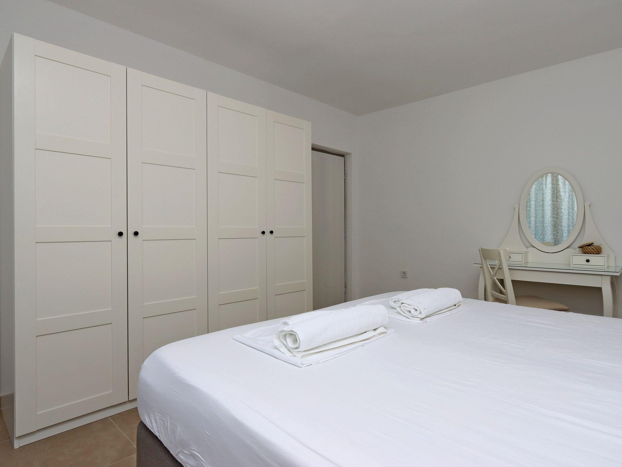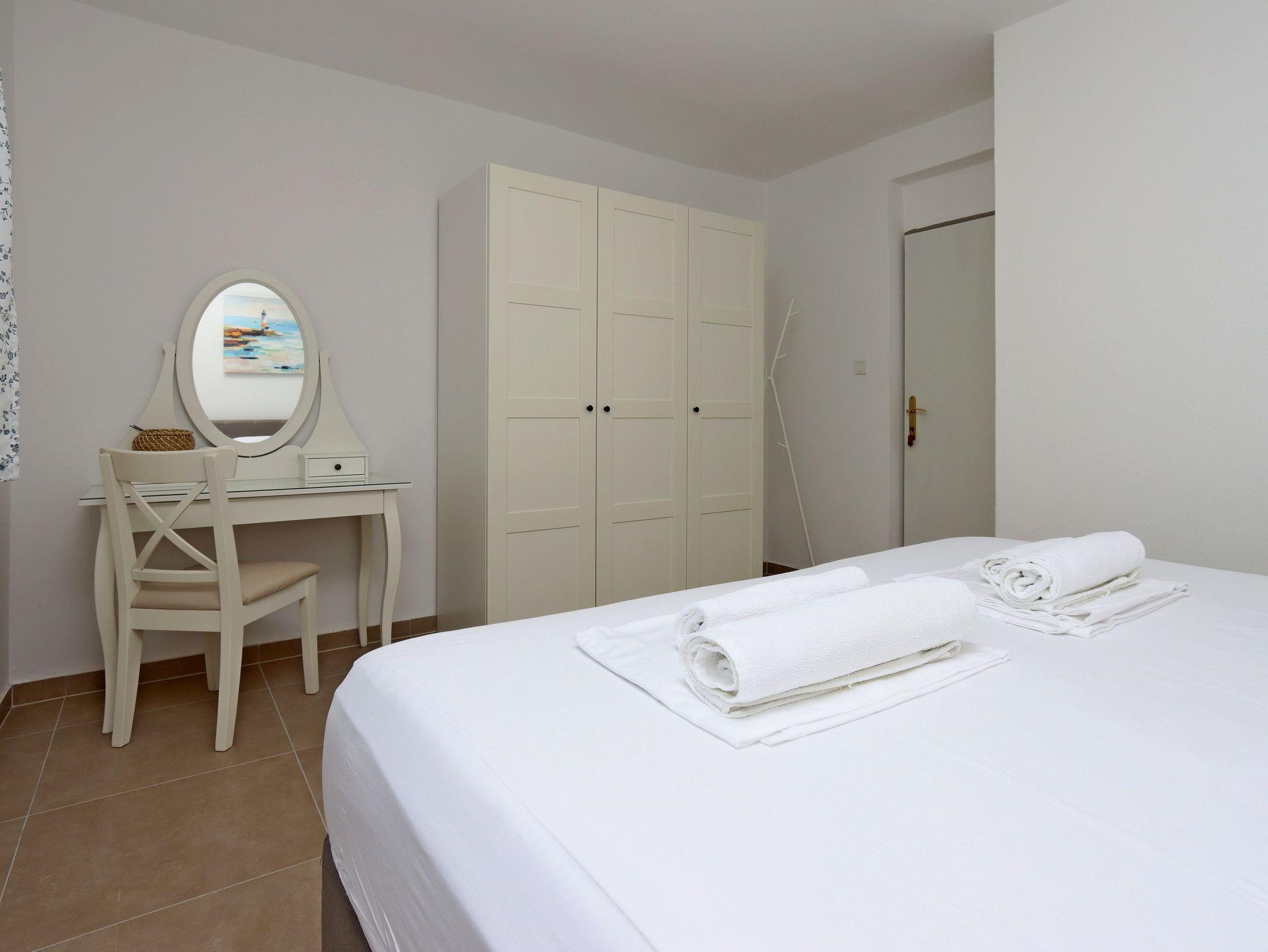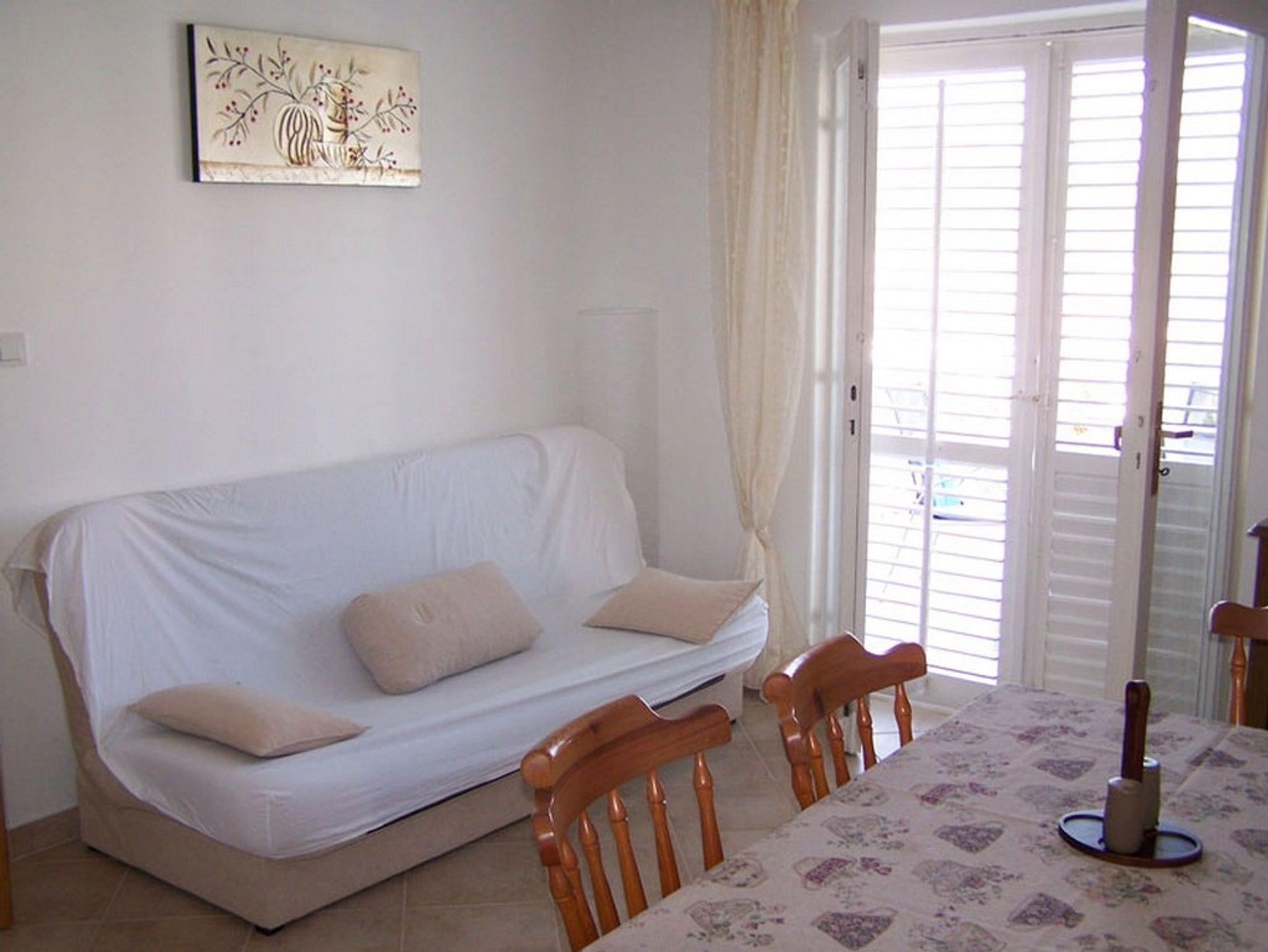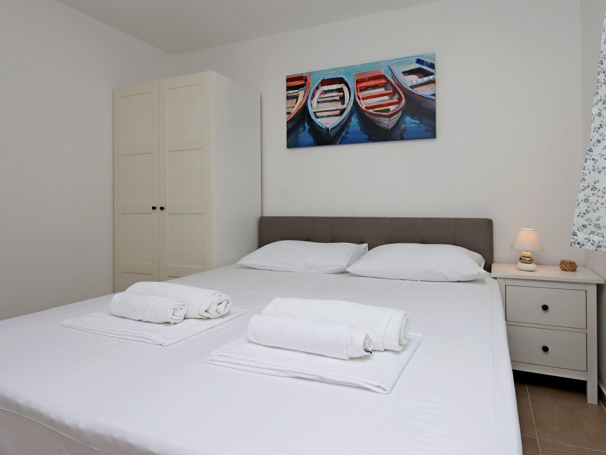 Ferienwohnung bietet Platz für 6 Gäste. Die Betten sind in Schlafzimmern, die es 3 gibt, innerhalb einer Gesamtfläche von 71m2, angeordnet. Die Gäste haben eine eigene Terrasse zur Verfügung, auf der sie in warmen Sommernächten genießen können. Das Apartment bietet Meerblick. Es ist erlaubt, Speisen auf dem Gemeinschafts-Grill vorzubereiten. IM PREIS INBEGRIFFEN: Kurtaxe, Endreinigung, Klimatisierung, Parkplatz, Internet, Wäschewaschen, Bootsanlegeplatz, Kinderbett, Föhn. VERBINDLICHE ZUSÄTZLICHE KOSTEN: Aufzahlung für Kurzaufenthalte (prozentualer Zuschlag pro Nächtigungsanzahl: 30% - 1, 20% - 2, 10% - 3). UNVERBINDLICHE ZUSÄTZLICHE KOSTEN: 2 Kinderbettchen (10,00 € Person/Tag). Die Verfügbarkeit zusätzlicher Dienstleistungen in Ihrem reservierten Termin und die Preise derselben (falls nicht aufgeführt) müssen im Voraus überprüft werden. Zusätzliche Dienstleistungen die in der Zahlungsaufforderung nicht aufgeführt sind werden direkt beim Vermieter bezahlt, angenommen der Gast nutzt auch diese.