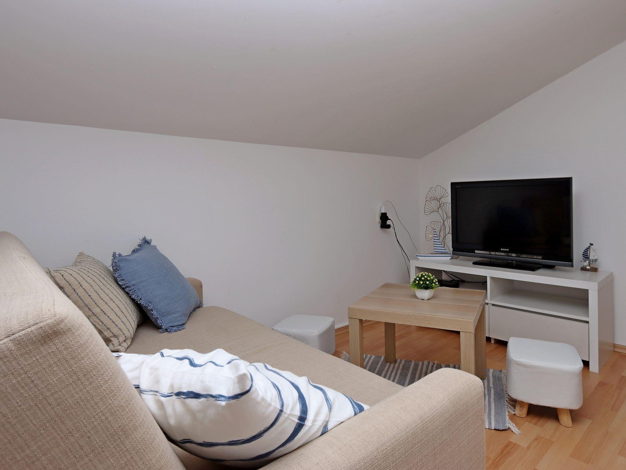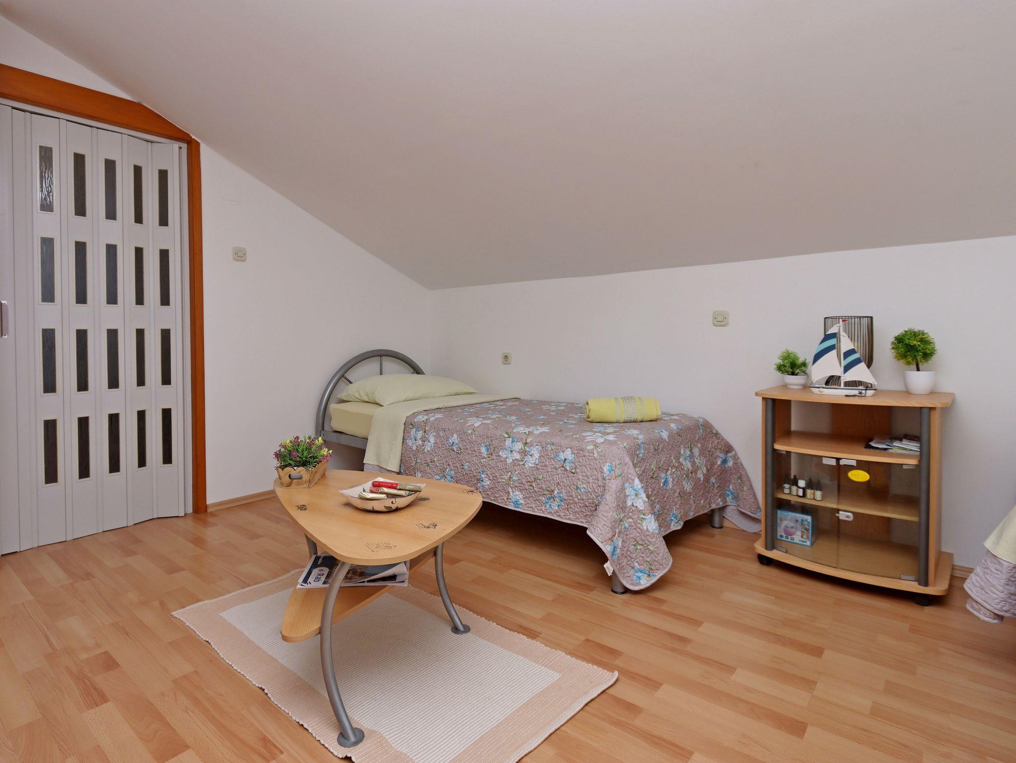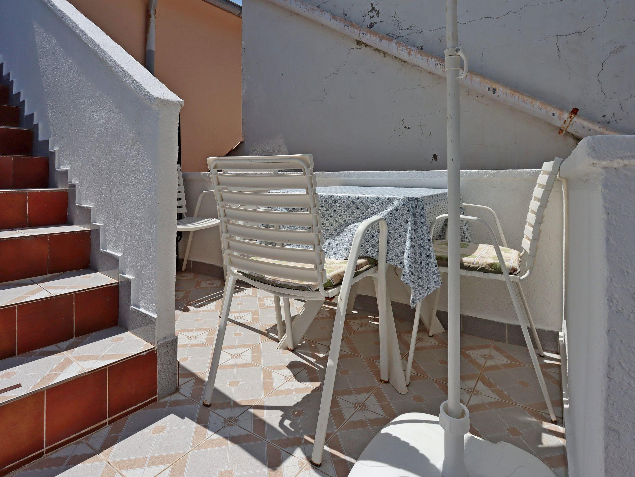 Studio bietet Platz für 4 Gäste. Die Betten sind in Schlafzimmern, die es 1 gibt, innerhalb einer Gesamtfläche von 42m2, angeordnet. Die Gäste haben eine eigene Terrasse zur Verfügung, auf der sie in warmen Sommernächten genießen können. Es ist erlaubt, Speisen auf dem Gemeinschafts-Grill vorzubereiten. In der Unterkunftseinheit besteht die Möglichkeit des Mitbringens von Haustieren gegen Aufpreis. IM PREIS INBEGRIFFEN: Kurtaxe, Endreinigung, Klimatisierung, Parkplatz, Internet, Kinderbett, Bügeleisen, Bügelbrett, Föhn, tragbarer Grill, Liegestühle. VERBINDLICHE ZUSÄTZLICHE KOSTEN: Aufzahlung für Kurzaufenthalte (prozentualer Zuschlag pro Nächtigungsanzahl: 30% - 1, 20% - 2, 10% - 3). UNVERBINDLICHE ZUSÄTZLICHE KOSTEN: Haustiere (8,00 € pro Nacht), Zusatzbett (20,00 € pro Nacht). Die Verfügbarkeit zusätzlicher Dienstleistungen in Ihrem reservierten Termin und die Preise derselben (falls nicht aufgeführt) müssen im Voraus überprüft werden. Zusätzliche Dienstleistungen die in der Zahlungsaufforderung nicht aufgeführt sind werden direkt beim Vermieter bezahlt, angenommen der Gast nutzt auch diese. Ermäßigung auf den Grundpreis: Gratistag 14=13 (bei einem Aufenthalt von 14 Tagen oder mehr erhalten Sie einen Gratistag für den Aufenthalt bis 31.12.26).