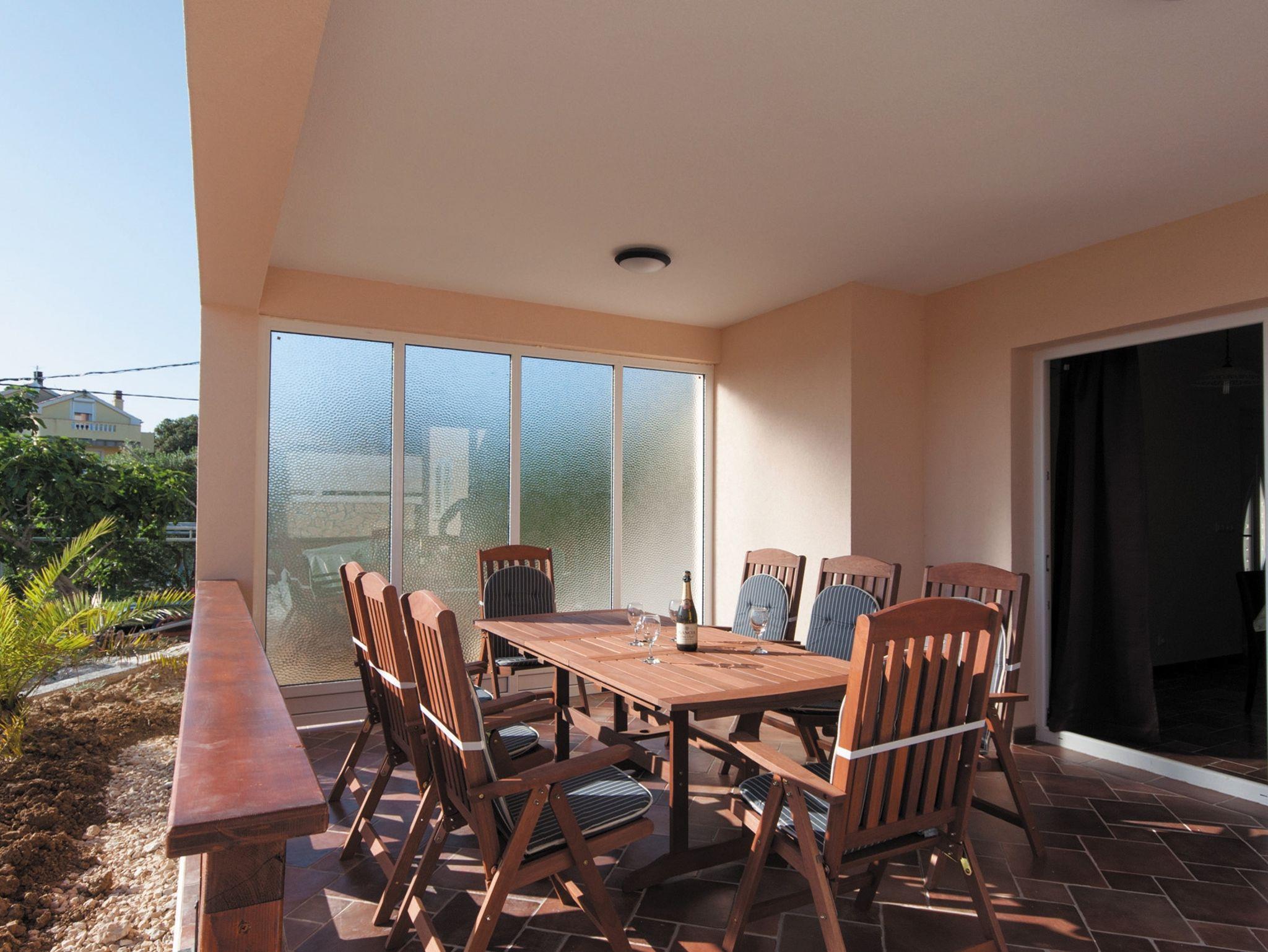 Haus bietet Platz für 8 Gäste. Die Betten sind in Schlafzimmern, die es 3 gibt, und in Wohnzimmer, innerhalb einer Gesamtfläche von 149m2, angeordnet. Die Gäste haben eine eigene Terrasse zur Verfügung, auf der sie in warmen Sommernächten genießen können. Das Haus bietet Meerblick. Es ist erlaubt, Speisen auf dem Gemeinschafts-Grill vorzubereiten. Während ihres Aufenthalts können sich Gäste im privaten Schwimmbad entspannen. In der Unterkunftseinheit besteht die Möglichkeit des Mitbringens von Haustieren, und die Dienstleistung ist im Preis der Unterkunft enthalten. IM PREIS INBEGRIFFEN: Kurtaxe, Endreinigung, Klimatisierung, Pool, Parkplatz, Internet, Bootsanlegeplatz, Haustiere, Fahrrad, Kinderbett, Bügeleisen, Bügelbrett, Föhn, tragbarer Grill. Die Verfügbarkeit zusätzlicher Dienstleistungen in Ihrem reservierten Termin und die Preise derselben (falls nicht aufgeführt) müssen im Voraus überprüft werden. Zusätzliche Dienstleistungen die in der Zahlungsaufforderung nicht aufgeführt sind werden direkt beim Vermieter bezahlt, angenommen der Gast nutzt auch diese. Ermäßigung auf den Grundpreis: Gratistag 28=25 (bei einem Aufenthalt von 28 oder mehr Tagen erhalten Sie 3 kostenlose Tage für den Aufenthalt bis 31.12.26).