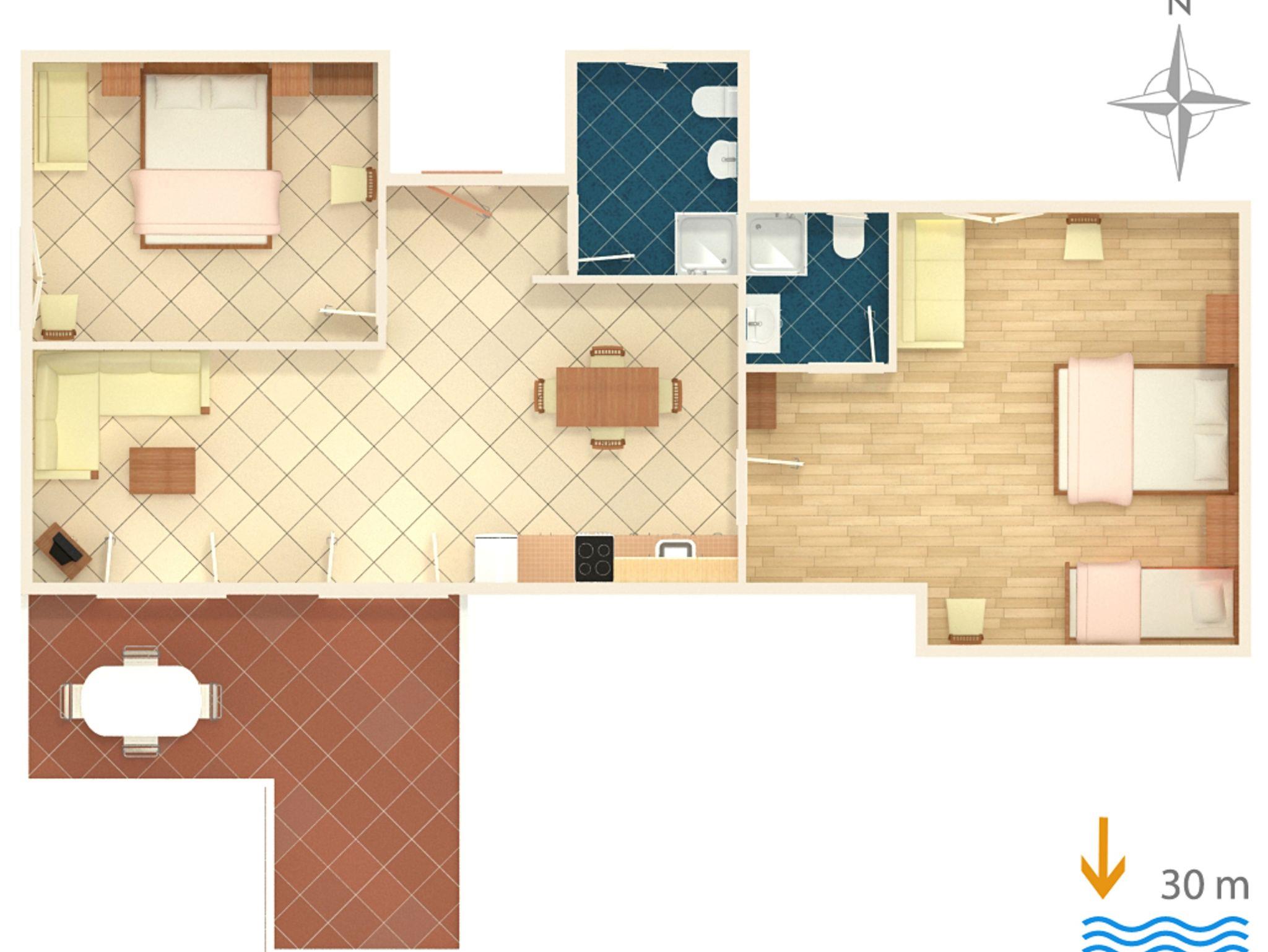 Ferienwohnung bietet Platz für 6 Gäste. Die Betten sind in Schlafzimmern, die es 2 gibt, innerhalb einer Gesamtfläche von 76m2, angeordnet. Die Gäste haben eine eigene Terrasse zur Verfügung, auf der sie in warmen Sommernächten genießen können. Das Apartment bietet Meerblick. Es ist erlaubt, Speisen auf dem Gemeinschafts-Grill vorzubereiten. In der Unterkunftseinheit besteht die Möglichkeit des Mitbringens von Haustieren gegen Aufpreis. IM PREIS INBEGRIFFEN: Kurtaxe, Endreinigung, Klimatisierung, Parkplatz, Internet, Bügeleisen, Föhn, tragbarer Grill, Liegestühle. VERBINDLICHE ZUSÄTZLICHE KOSTEN: Aufzahlung für Kurzaufenthalte (prozentualer Zuschlag pro Nächtigungsanzahl: 30% - 1, 20% - 2, 10% - 3). UNVERBINDLICHE ZUSÄTZLICHE KOSTEN: Wäschewaschen (10,00 € Waschen), Boot (180,00 € pro Nacht), Bootsanlegeplatz (15,00 € pro Nacht), Haustiere (10,00 € pro Nacht), Zusatzbett (10,00 € pro Nacht). Die Verfügbarkeit zusätzlicher Dienstleistungen in Ihrem reservierten Termin und die Preise derselben (falls nicht aufgeführt) müssen im Voraus überprüft werden. Zusätzliche Dienstleistungen die in der Zahlungsaufforderung nicht aufgeführt sind werden direkt beim Vermieter bezahlt, angenommen der Gast nutzt auch diese.