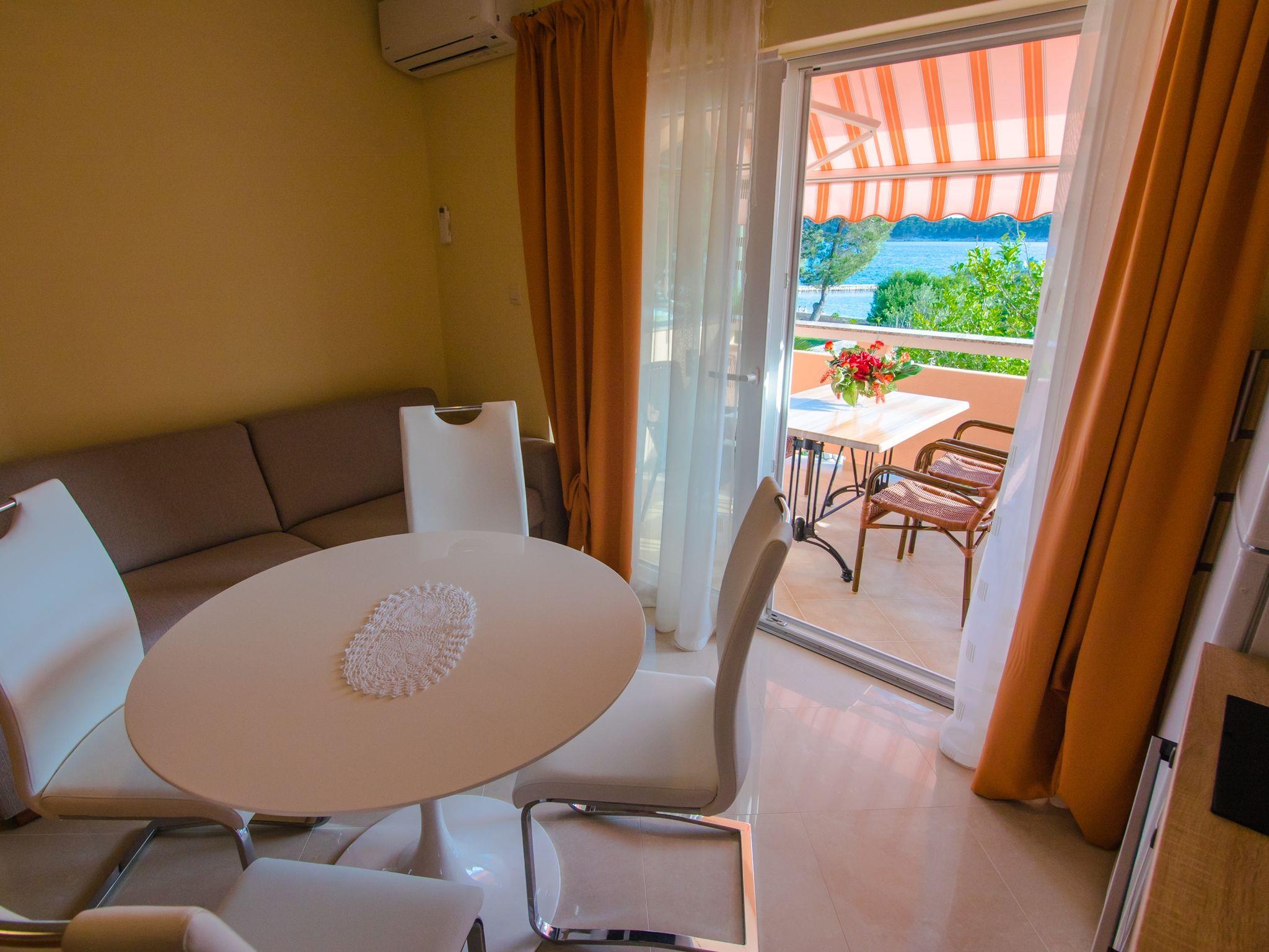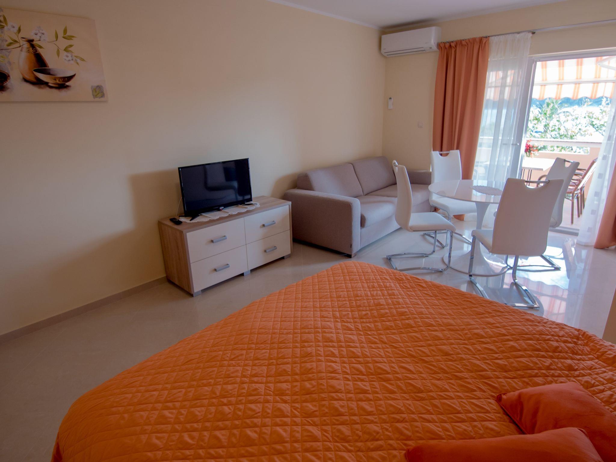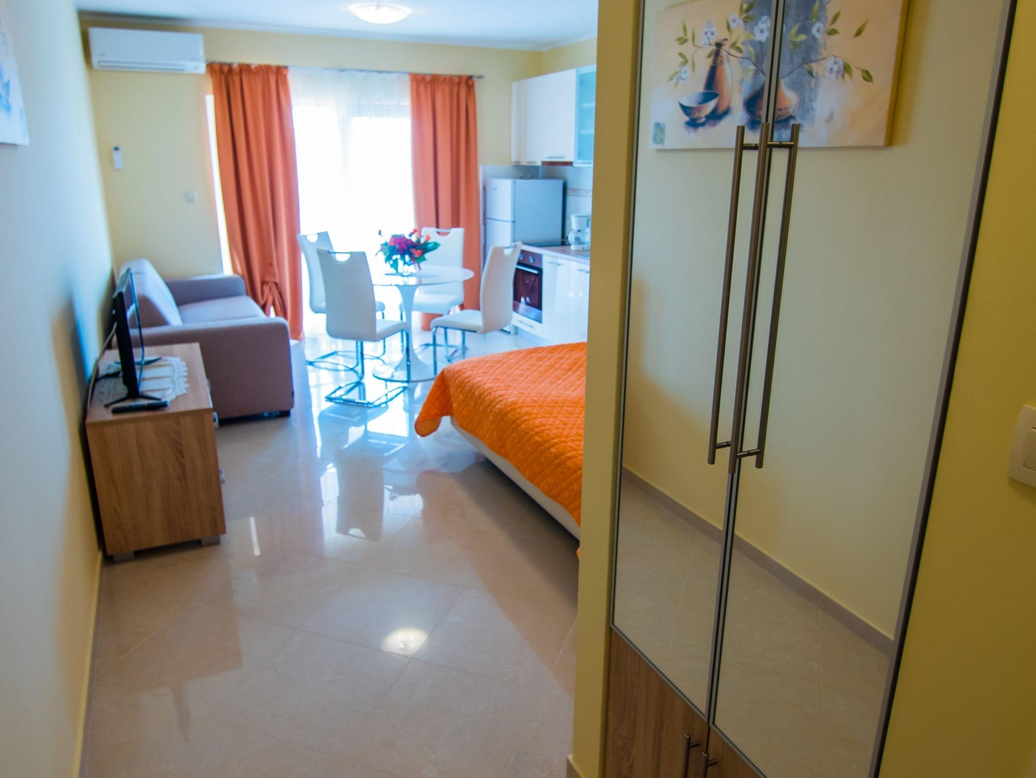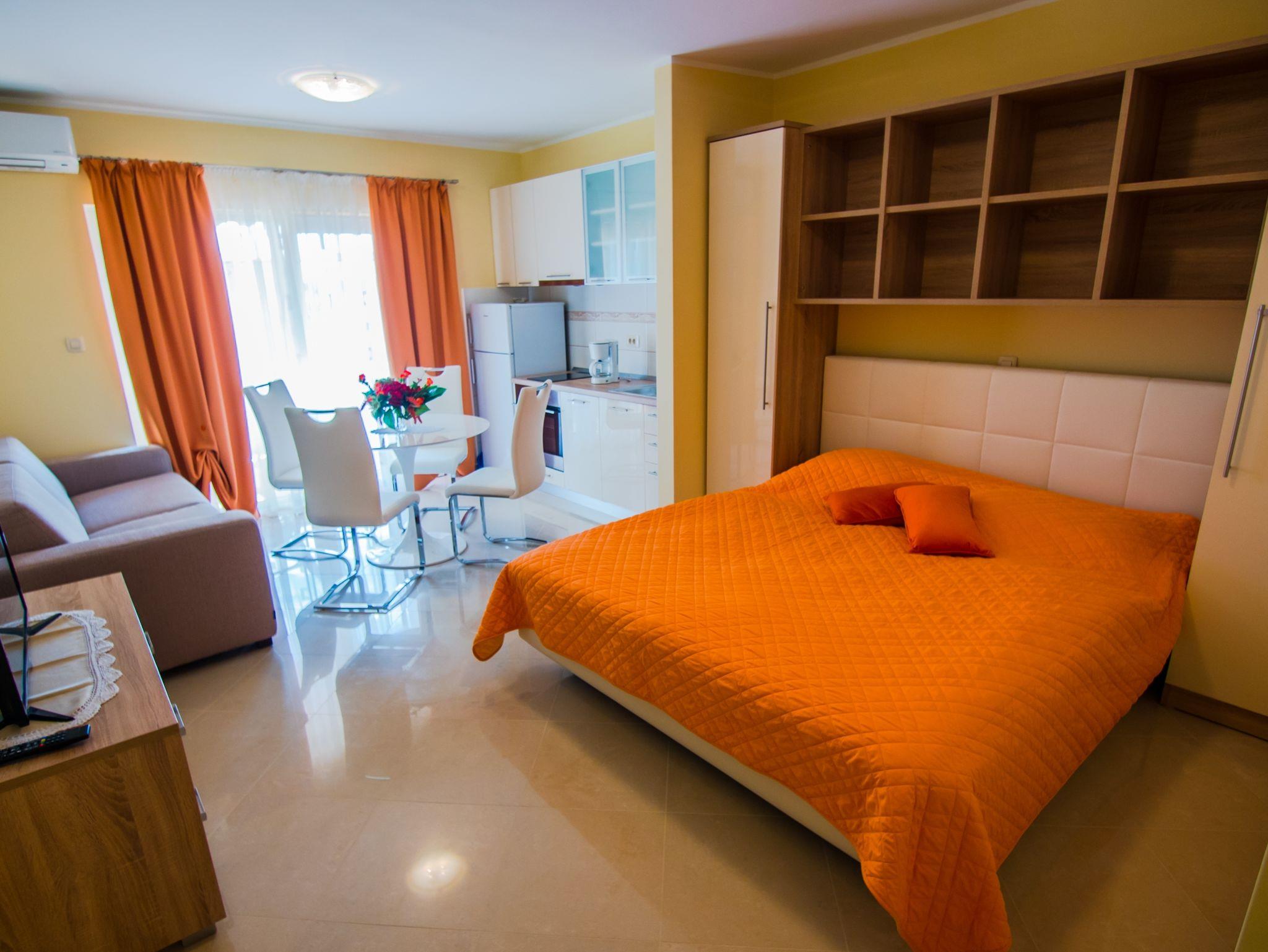 Studio bietet Platz für 2 Gäste. Die Betten sind in Schlafzimmern, die es 1 gibt, innerhalb einer Gesamtfläche von 40m2, angeordnet. Die Gäste haben einen eigenen Balkon zur Verfügung, auf der sie in warmen Sommernächten genießen können. Das Studio-Apartment bietet Meerblick. Es ist erlaubt, Speisen auf dem Gemeinschafts-Grill vorzubereiten. In der Unterkunftseinheit besteht die Möglichkeit des Mitbringens von Haustieren gegen Aufpreis. IM PREIS INBEGRIFFEN: Kurtaxe, Endreinigung, Klimatisierung, Parkplatz, Internet, Wäschewaschen, Bootsanlegeplatz, Kinderbett, Bügeleisen, Bügelbrett, Föhn, 2 Kinderbettchen (im Preis enthalten). VERBINDLICHE ZUSÄTZLICHE KOSTEN: Aufzahlung für Kurzaufenthalte (prozentualer Zuschlag pro Nächtigungsanzahl: 30% - 1, 20% - 2, 10% - 3). UNVERBINDLICHE ZUSÄTZLICHE KOSTEN: Frühstück (14,00 €, 50% Nachlass für Kinder zwischen 4 und 12 Jahren, Kinder bis 4 Jahre sind frei.), Haustiere (5,00 € pro Nacht). Die Verfügbarkeit zusätzlicher Dienstleistungen in Ihrem reservierten Termin und die Preise derselben (falls nicht aufgeführt) müssen im Voraus überprüft werden. Zusätzliche Dienstleistungen die in der Zahlungsaufforderung nicht aufgeführt sind werden direkt beim Vermieter bezahlt, angenommen der Gast nutzt auch diese. Ermäßigung auf den Grundpreis: Gratistag 14=13 (bei einem Aufenthalt von 14 Tagen oder mehr erhalten Sie einen Gratistag für den Aufenthalt bis 31.12.26).