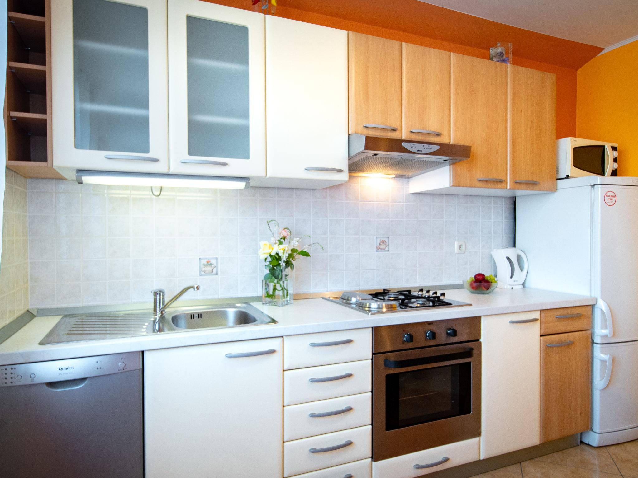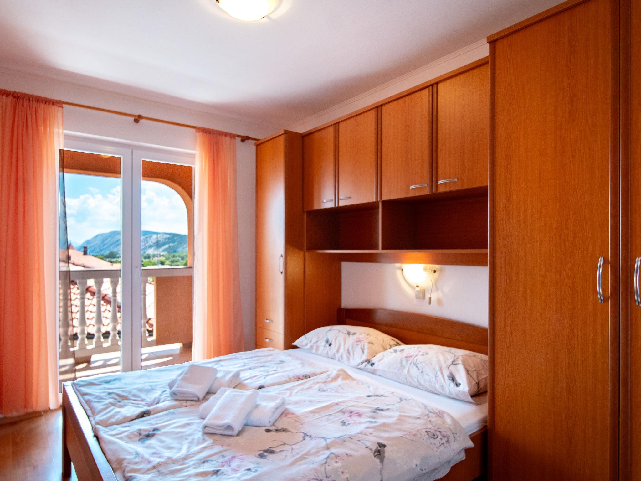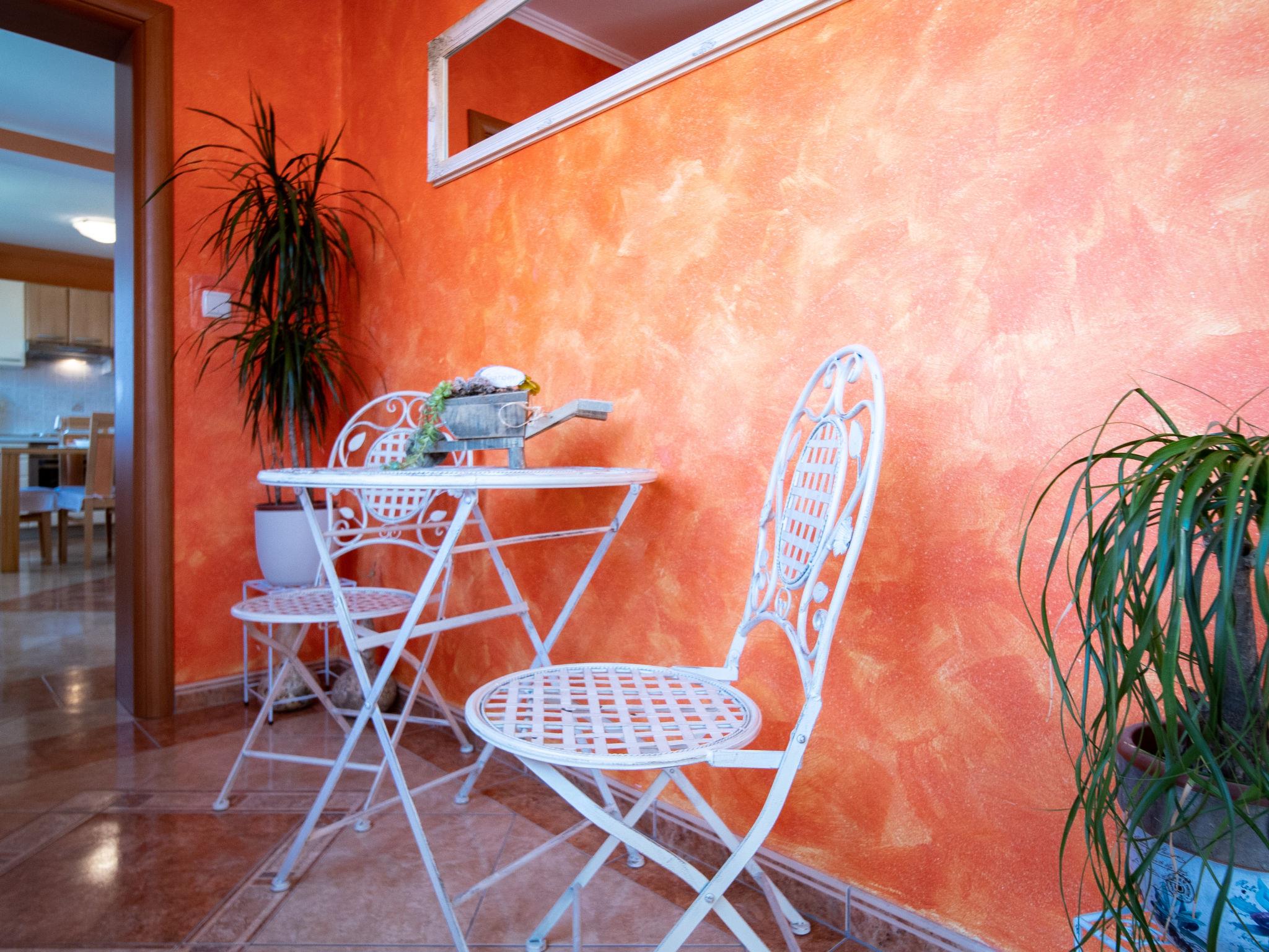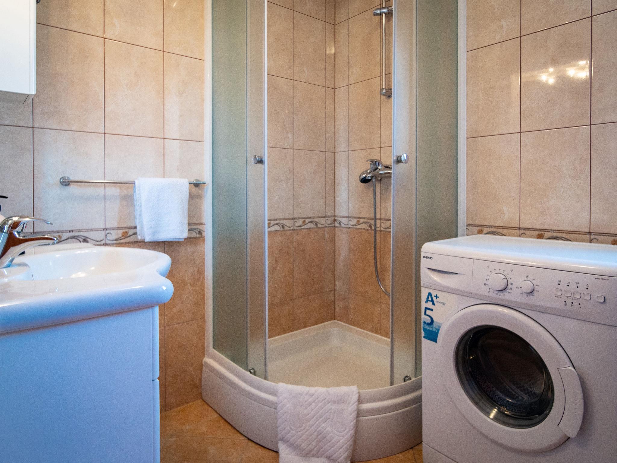 3-room apartment 60 m2 on 2nd floor. Living/dining room with satellite TV and air conditioning. 2 rooms, each room with 1 double bed (2 x 90 cm, length 200 cm). Exit to the terrace. Open kitchen (2 hot plates, oven, dishwasher, 2 gas rings, toaster, kettle, microwave, freezer, electric coffee machine) with air conditioning. Exit to the terrace. Shower/WC. No heating option. Terrace 12 m2, roofed. Terrace furniture. Facilities: washing machine, safe, hair dryer. Internet (WiFi, free). Please note: non-smoking house. Maximum 1 pet/ dog allowed.