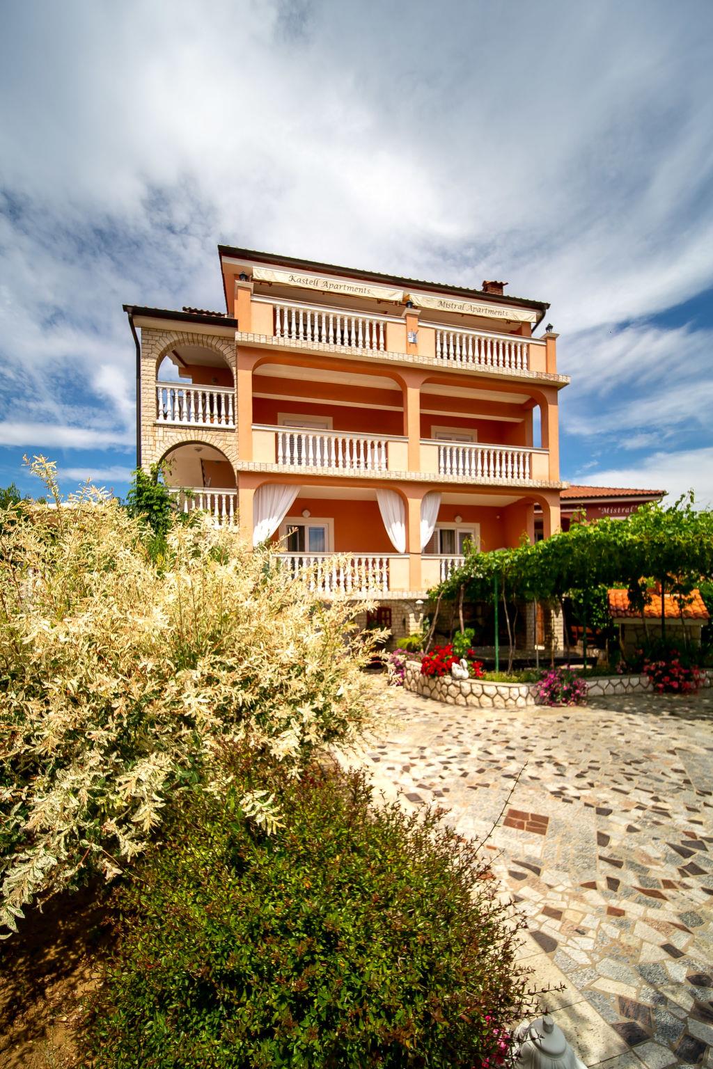 Apartment house "Kastell". 300 m from the centre of Lopar, 13 km from the centre of Rab, 350 m from the sea, 350 m from the beach. For shared use: property 750 m2, garden 40 m2 flowers and trees. Terrace (30 m2), garden furniture, barbecue, children's playground (slide, swing). In the house: internet access, washing machine (extra), tumble dryer (for shared use, extra). Breakfast on request (extra). Parking at the house on the premises. Shop 350 m, supermarket 250 m, restaurant 100 m, café, bus stop 150 m, ferry 1.5 km, sandy beach 350 m. Please note: private mooring (extra) on request.