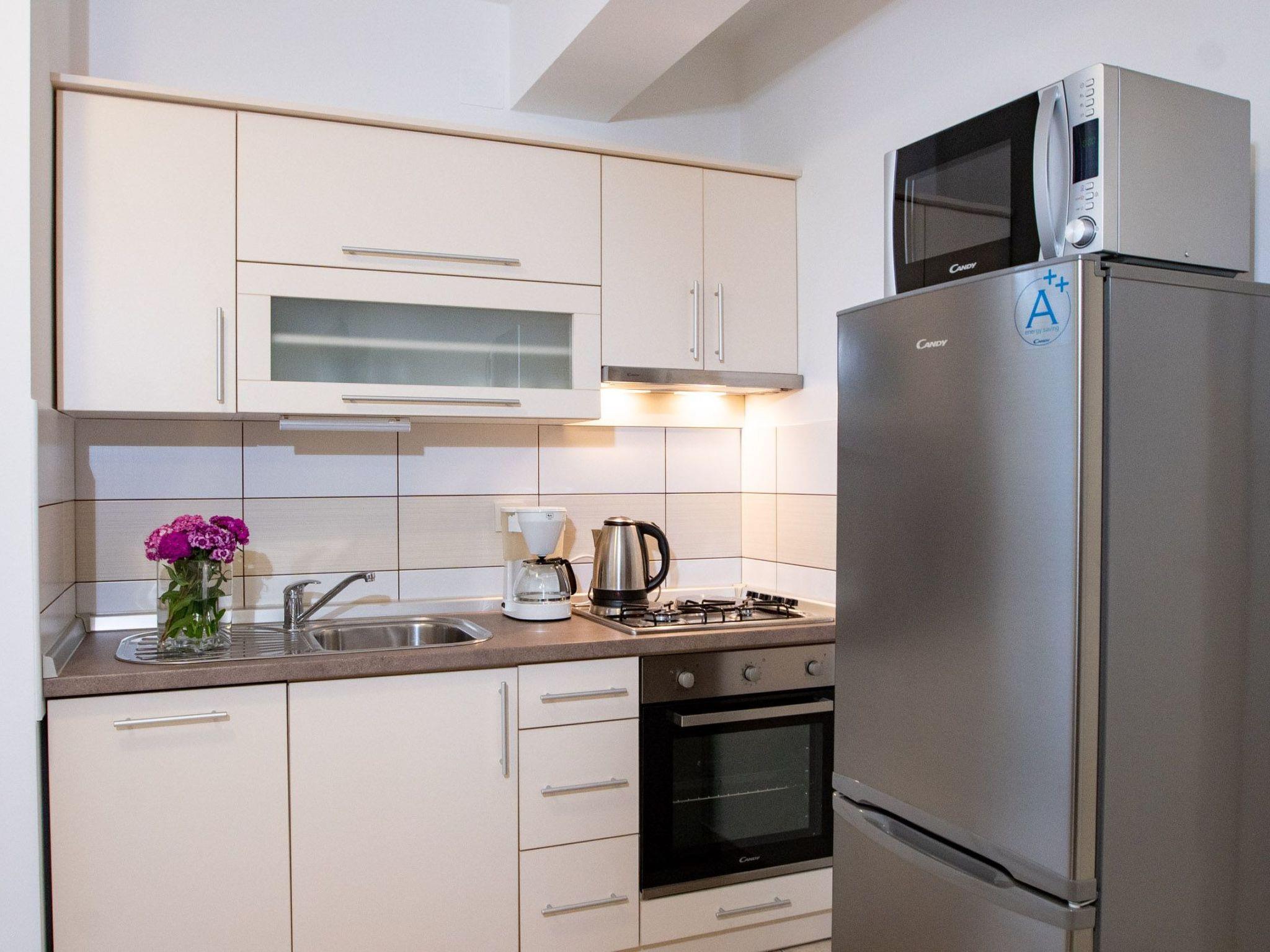 Flat D is a flat with 1 bedroom and an extra bed (folding couch) for 2 to 4 people. It is located in the basement of the house and covers an area of 40 square metres (no balcony). The flat is fully equipped - a bathroom with shower, dining room and kitchen with fridge, hob, oven, dishwasher, kettle, microwave and coffee machine. Clean bed linen and towels are provided and changed every 7 days.