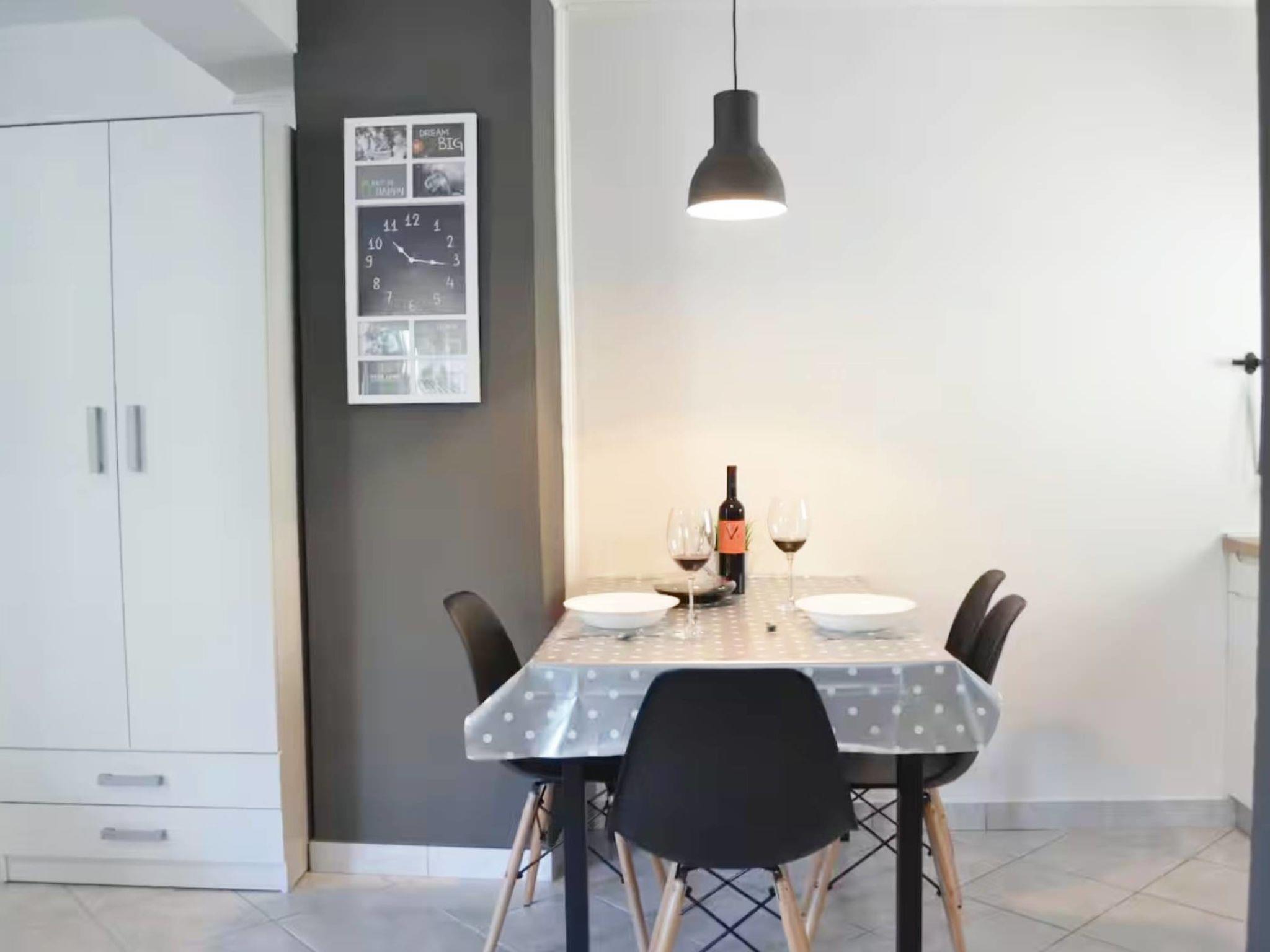1-room apartment 30 m2 on 1st floor. Studio with 1 french bed (160 cm, length 200 cm), satellite TV and air conditioning. Exit to the balcony. Open kitchen (oven, 2 induction hot plates, kettle) with dining table. Shower/WC. Forced-air heating. Balcony 7 m2. Balcony furniture. Facilities: Internet (WiFi, free). Please note: non-smoking house.