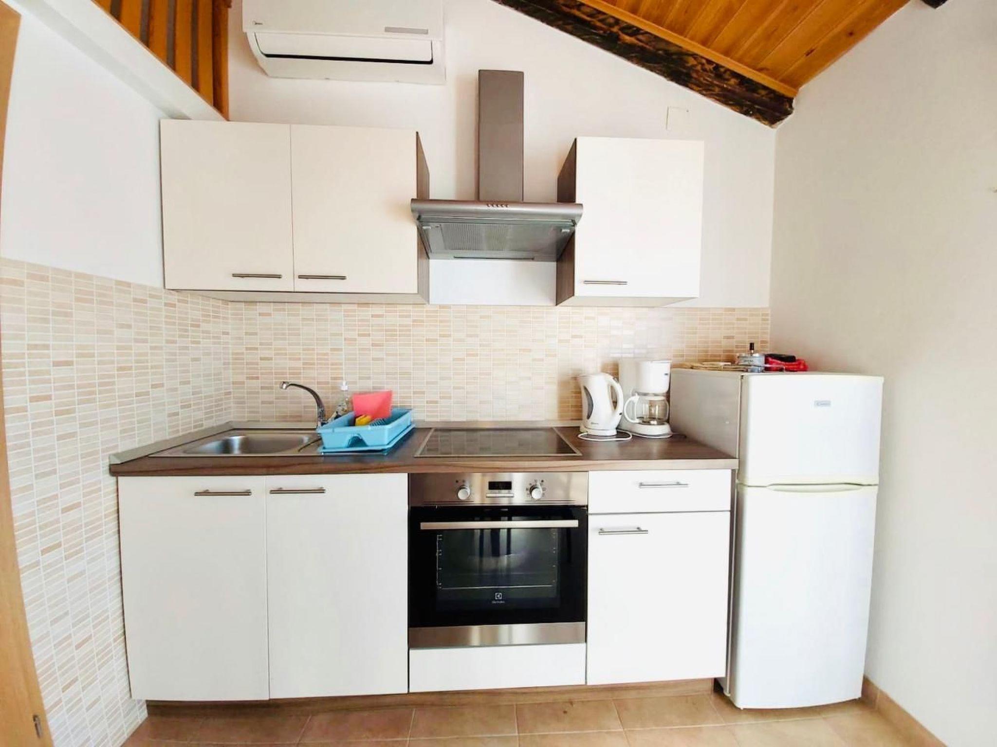 Inside, the apartment spans 50m² across two well-designed floors, providing an intimate and welcoming atmosphere for up to four guests. At its heart, the living room-kitchen area is thoughtfully equipped with a wall-mounted modern flat-screen TV with satellite channels, a dining table for four, and a kitchen unit boasting modern appliances including an oven, ceramic hob, fridge, coffee machine, and kettle. The inclusion of laminate flooring throughout adds to the apartment's warm and cozy ambiance. Ascend the somewhat steep wooden stairs to the second floor where the peaceful sleeping quarters await. Here, a comfortable double bed and an additional double bed on the sleeping gallery offer restful nights, while the modern bathroom, equipped with a shower, ensures convenience and comfort during your stay. Air conditioning units in both the kitchen and bedroom, together with free wireless Internet access (noting that reception may be weaker outside), guarantee an agreeable indoor climate and connectivity.