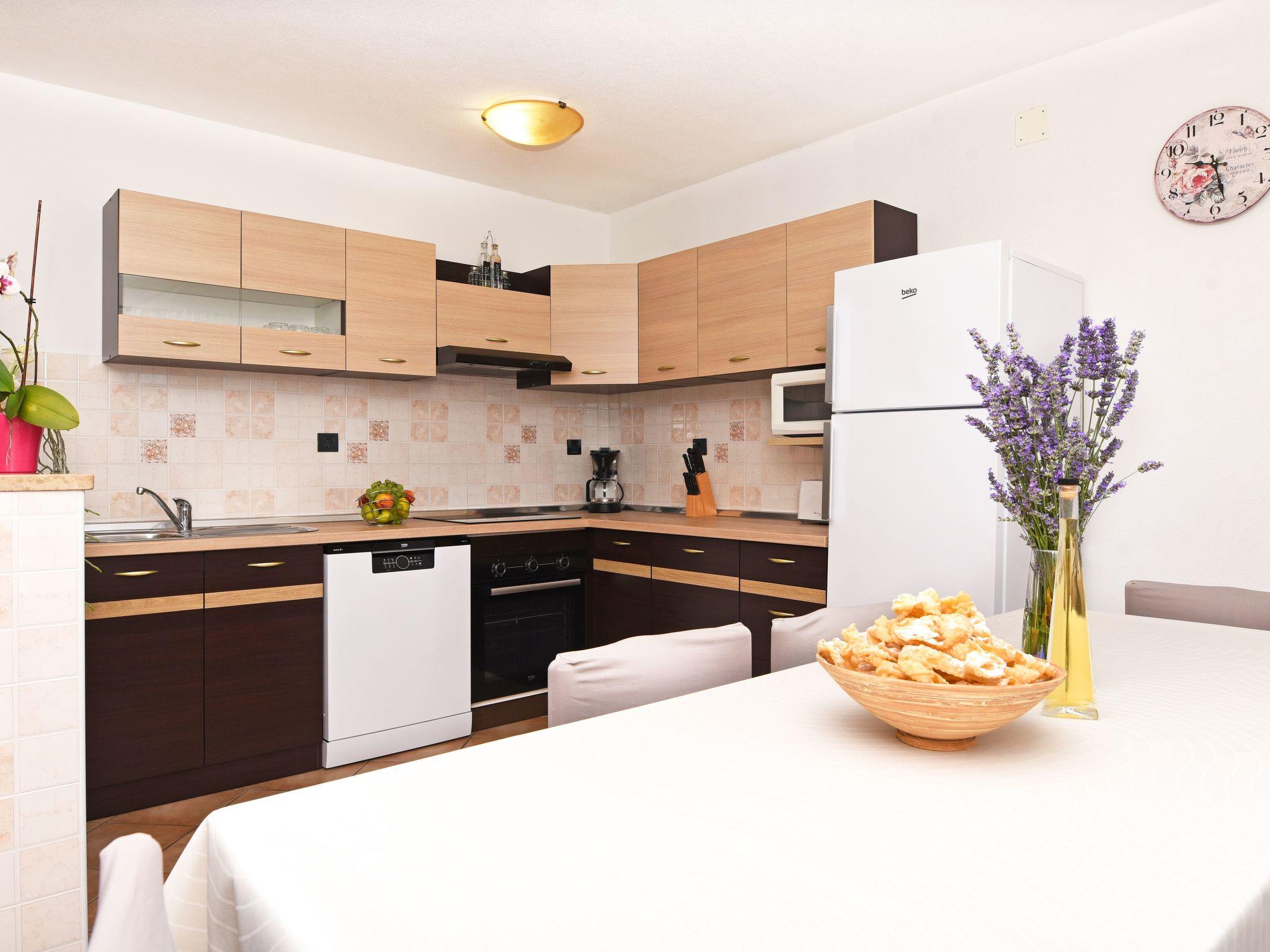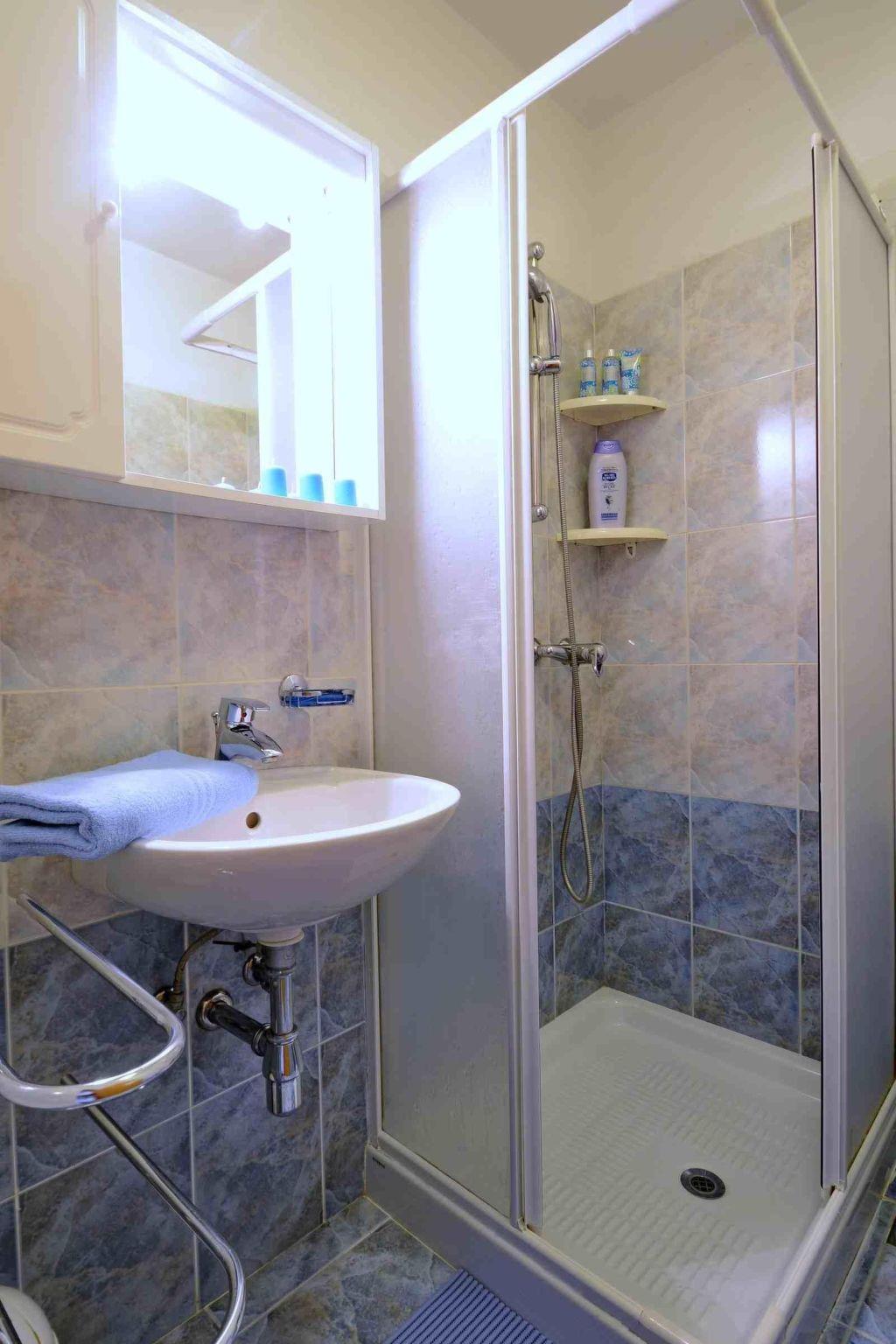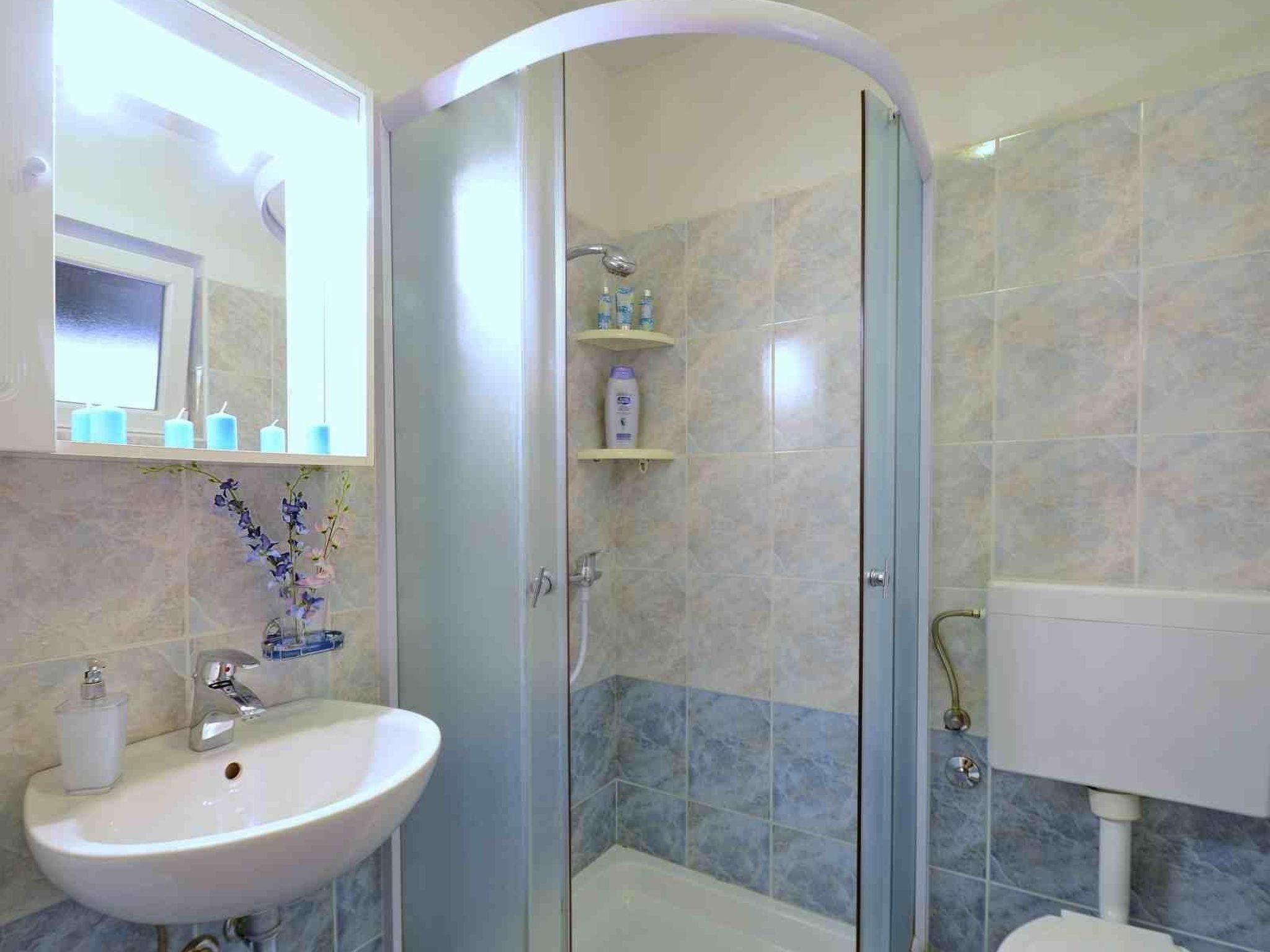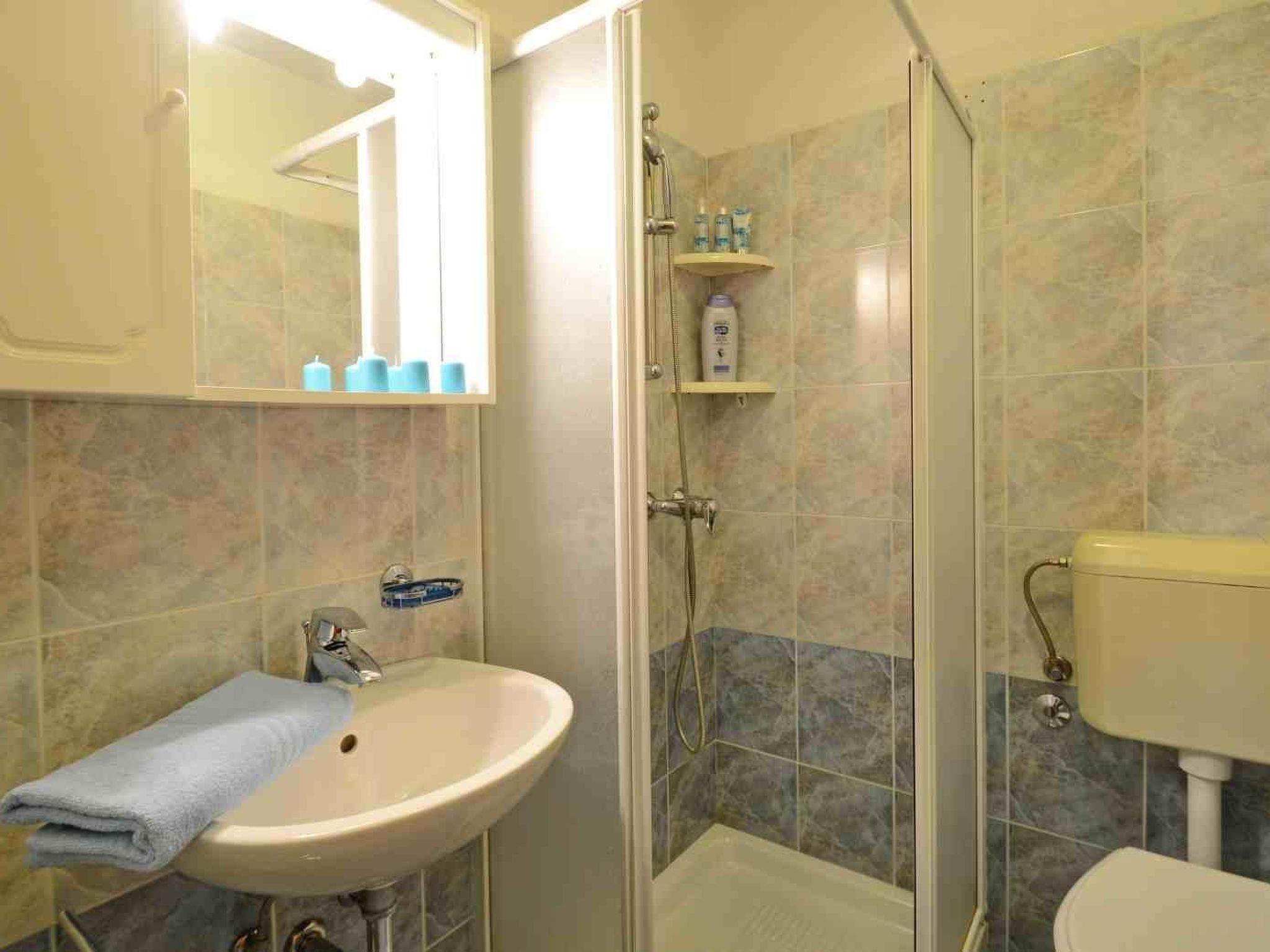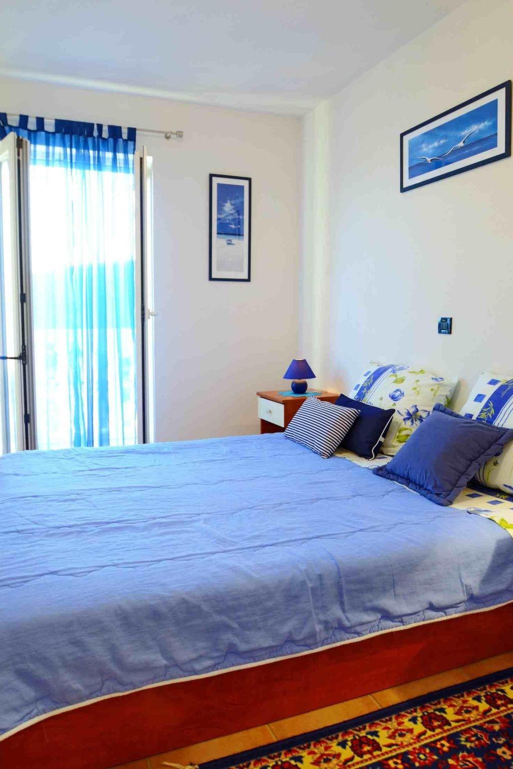 The living area of the house extends over the ground floor and the first floor. On the ground floor there is a bedroom with a double bed, a bathroom with a shower, a kitchen with a dining area, a living room and a utility room/laundry room with a washing machine, iron and hoover. The kitchen offers all comforts, such as gas and electric cooker and microwave, toaster, kettle, coffee machine with filter, dishwasher, refrigerator with freezer compartment and a large dining table for eight persons. Directly adjacent is the living room with sofa bed, radio and satellite TV. The first floor consists of three bedrooms with double beds (160 x 200 cm). One of the rooms has a balcony. Two more bathrooms with showers are also located on this floor. The house is air-conditioned. Air conditioning is present on each floor in the corridor and cools all the rooms. Internet connection (WLAN) is available free of charge.