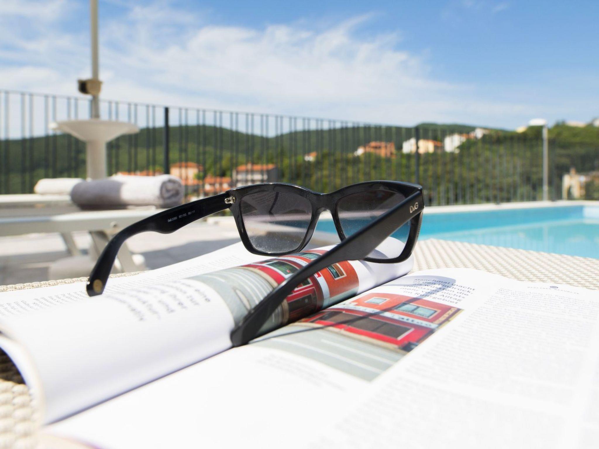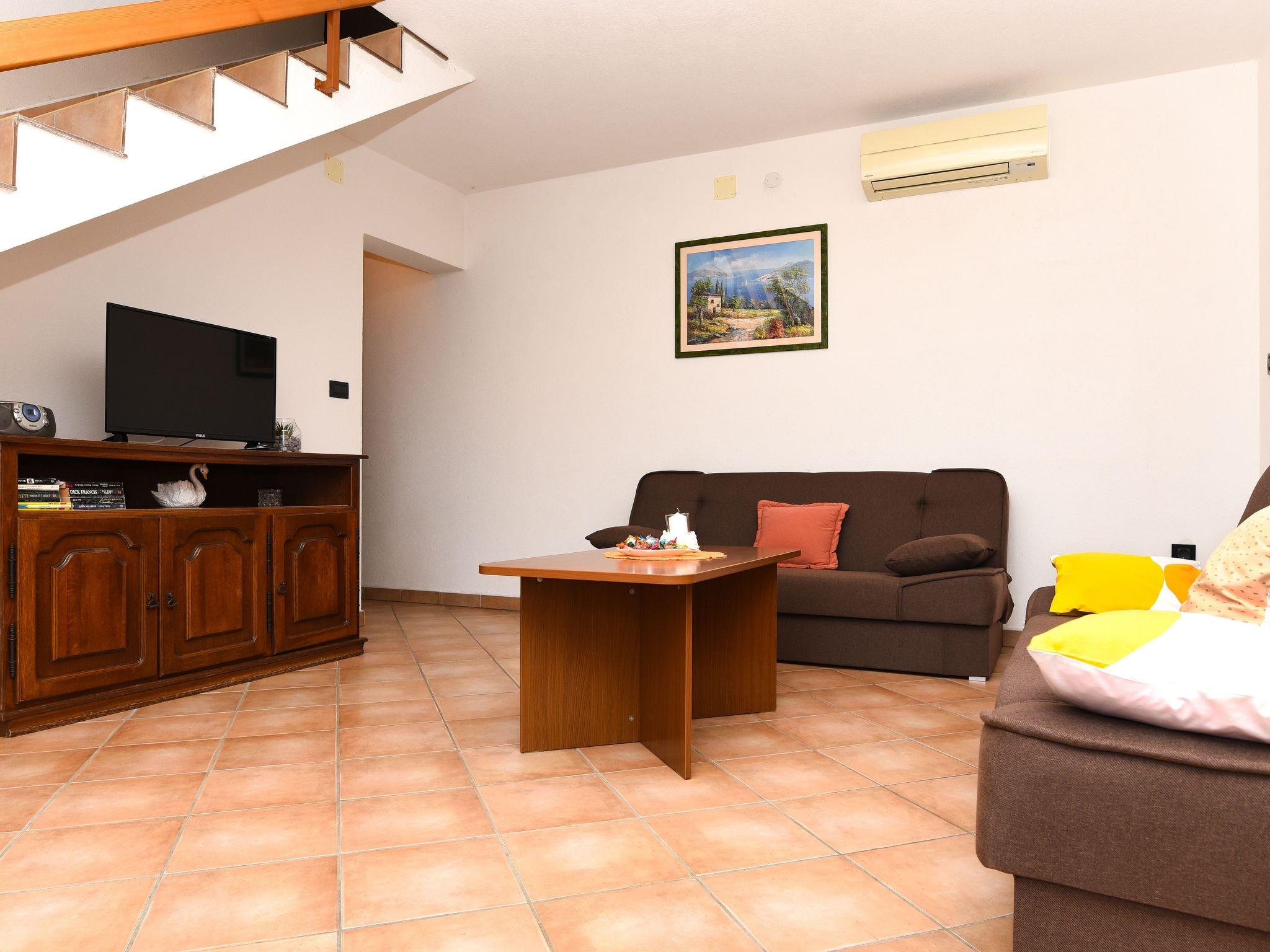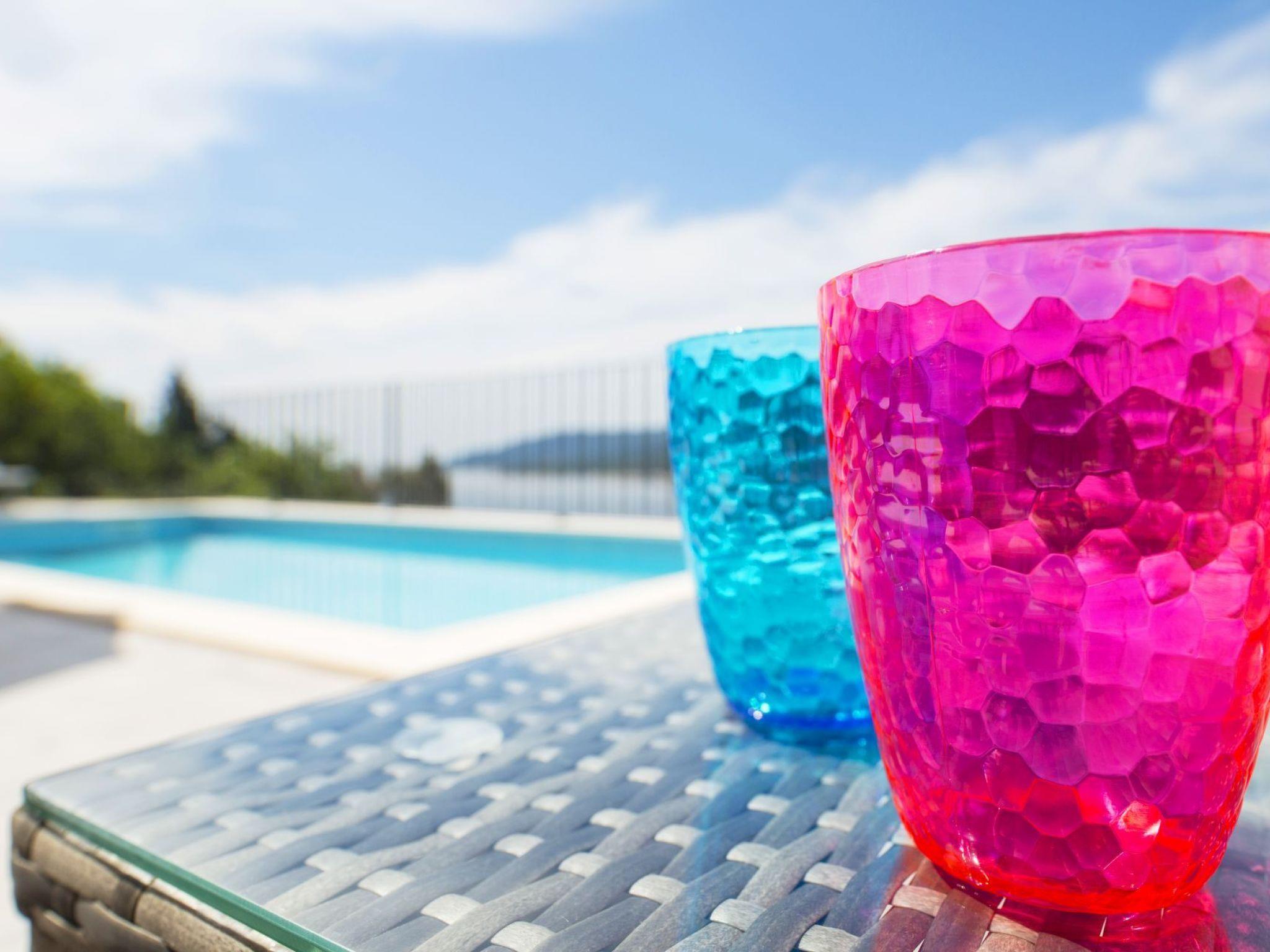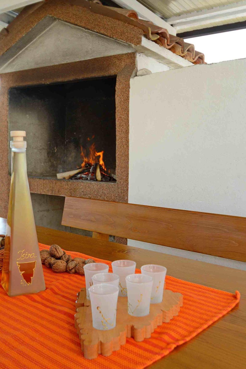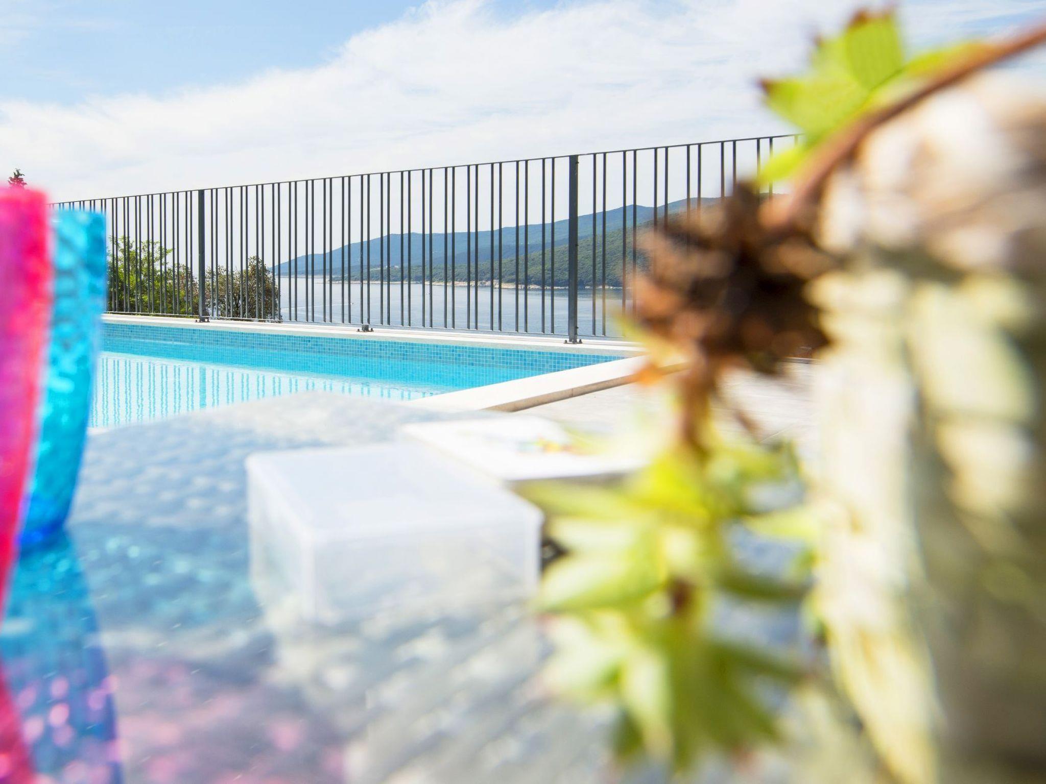 The ground floor leads to the large, partially covered terrace, furnished with a table and two benches for eight people. The barbecue (wood or charcoal) is located next to it. There are also four chairs and two parasols. From the terrace you can see the entire surrounding area, the Kvarner bay and islands, and the old town of Labin. Stairs lead to the private pool with a lounge area.