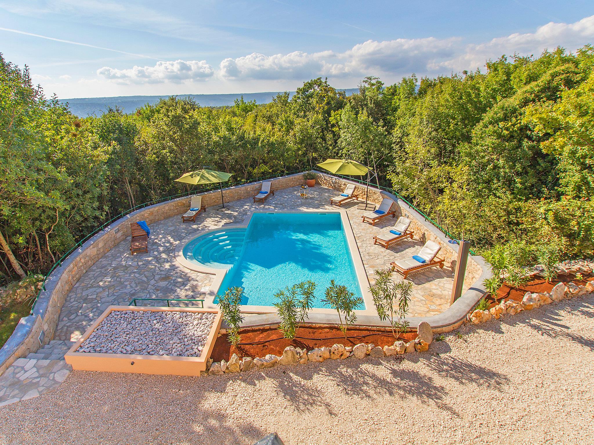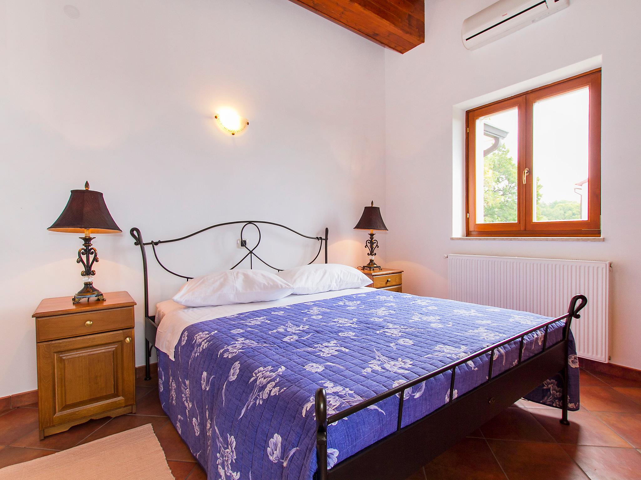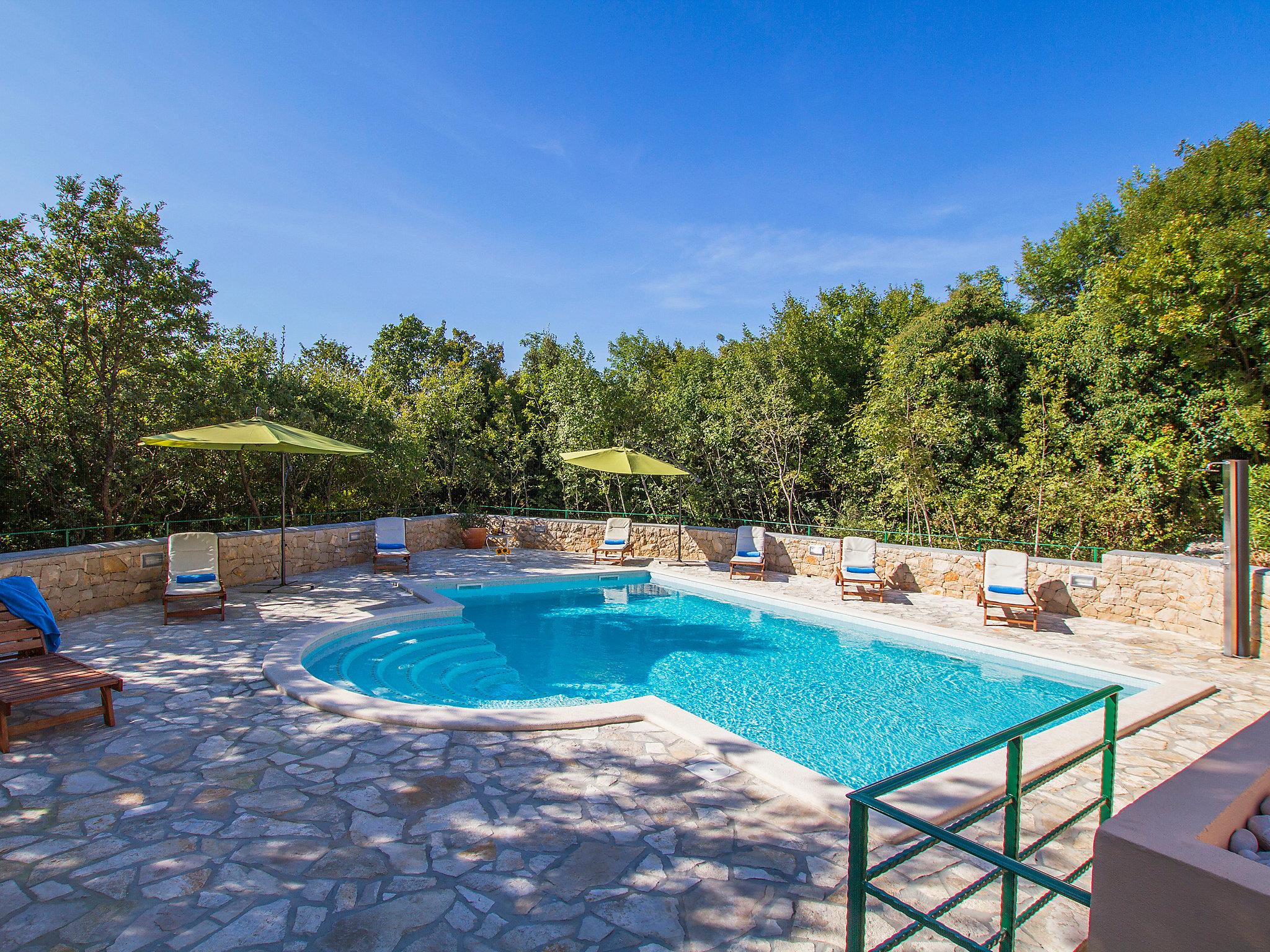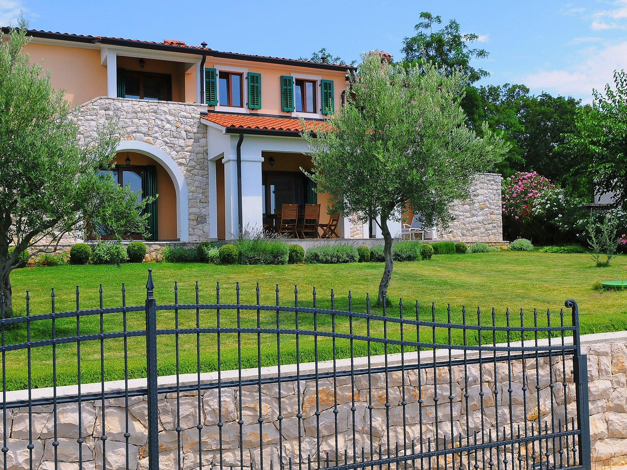 Sveti Lovrec Labinski 20 km from Rabac: Beautiful, comfortable villa "Marina", 2 storeys. In the hamlet Vlakovo 15 km from the centre of Labin, in a quiet, sunny, elevated position, 4 km from the sea, 4 km from the beach, in the countryside. For shared use: property (fenced), swimming pool angular (13 x 4 m, depth 140 cm, seasonal availability: 06.May. - 16.Sep.) with internal staircase. Outdoor shower, poolhouse, garden furniture, barbecue. Private: garden 600 m2 with lawn and trees. In the house: central heating system, air conditioning. Motor access (100 m via unmade road, ramp). Parking at the house on the premises. Shop 4 km, restaurant 4 km, bus stop 14.7 km, pebble beach 4 km, rocky beach 4 km. For shared use: 2 swimming pools (13 x 4 m, 8.5 x 4.5 m).