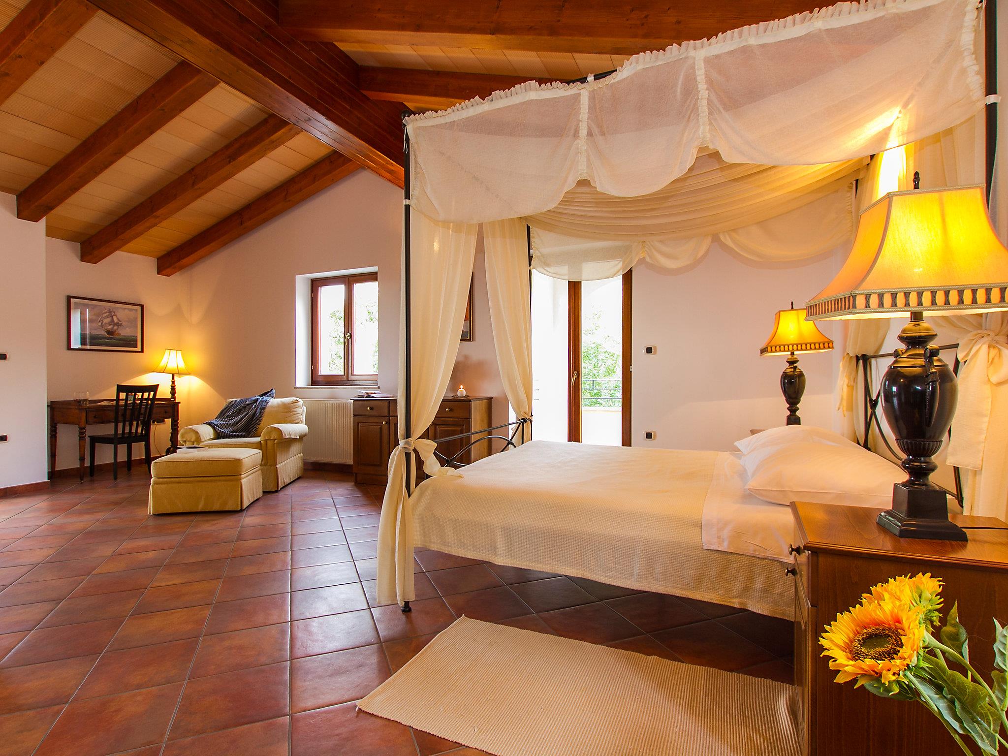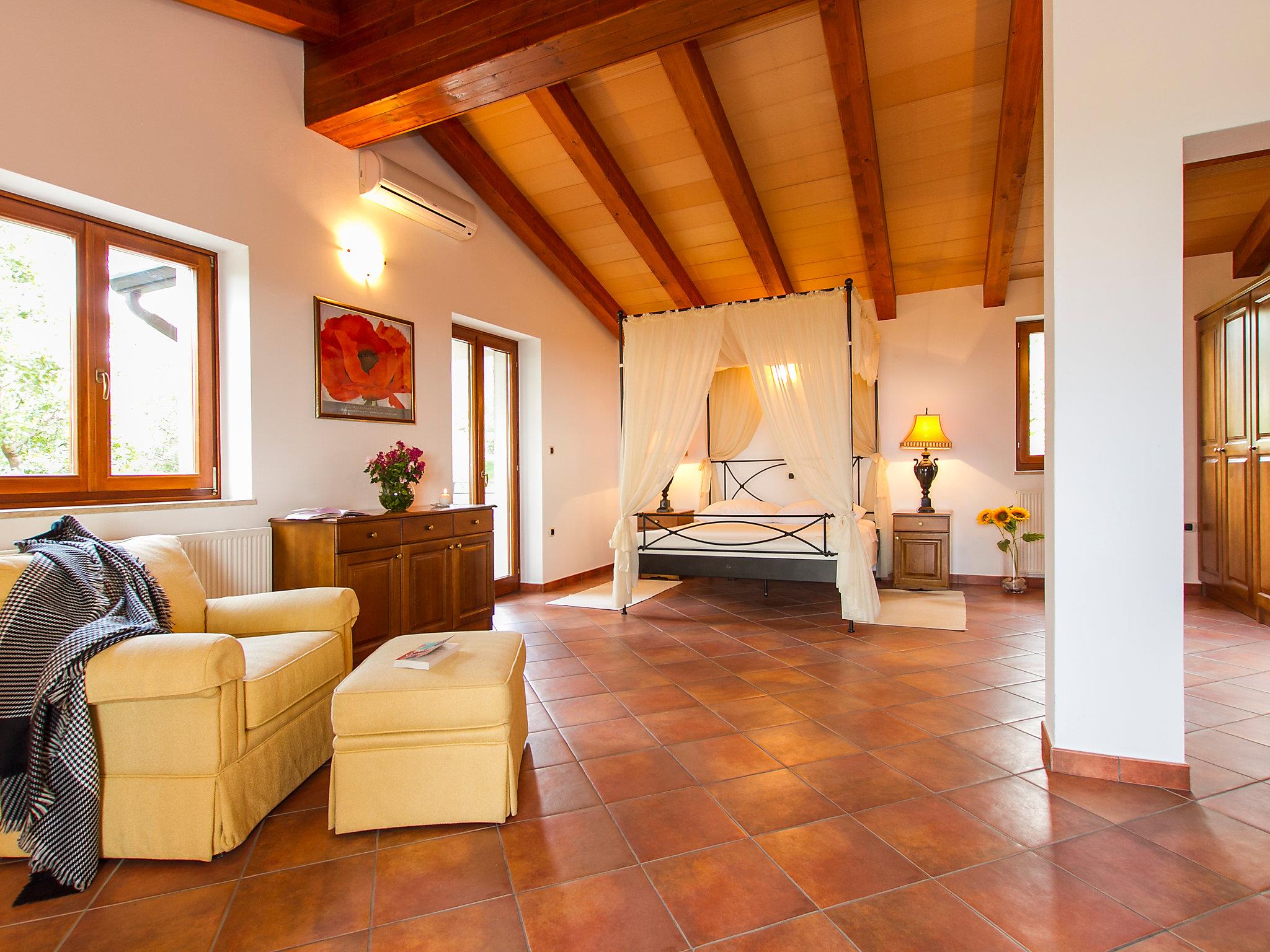5-room villa 220 m2 on 2 levels. Beautiful and tasteful furnishings: large living/dining room 55 m2 with open-hearth fireplace (only for decoration), satellite TV (flat screen), DVD and air conditioning. Exit to the terrace. 1 room with 2 beds (80 cm, length 190 cm), air conditioning. Open kitchen (4 hot plates, oven, dishwasher, microwave, freezer). Bath/shower/WC. Upper floor: 1 large room 34 m2 with 1 french bed (160 cm, length 190 cm), bath/bidet/WC and air conditioning. Exit to the terrace. 1 room with 1 french bed (160 cm, length 190 cm), bath/bidet/WC and air conditioning. Exit to the terrace. 1 room with 1 french bed (160 cm, length 190 cm), shower/bidet/WC and air conditioning. Exit to the terrace. Large terrace 30 m2, roofed, 3 terraces 4 m2. Terrace furniture, barbecue (portable). Distant view of the sea. Facilities: washing machine, baby cot. Internet (WiFi, free).