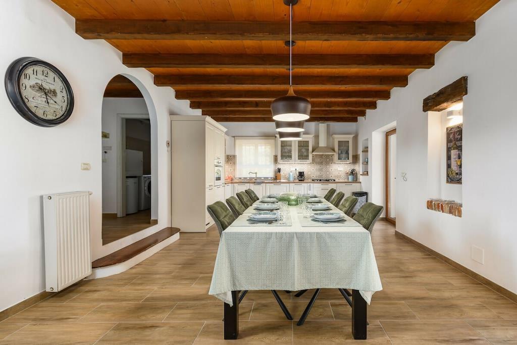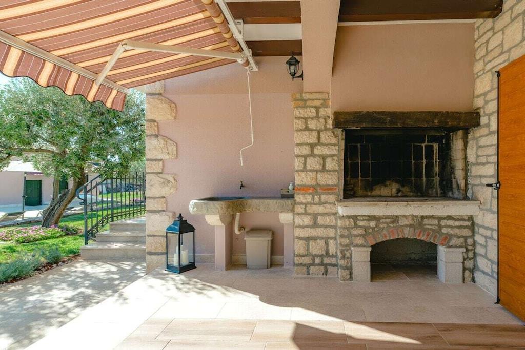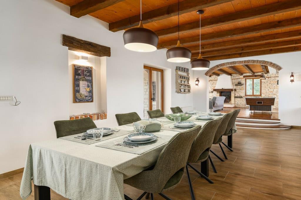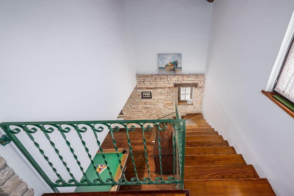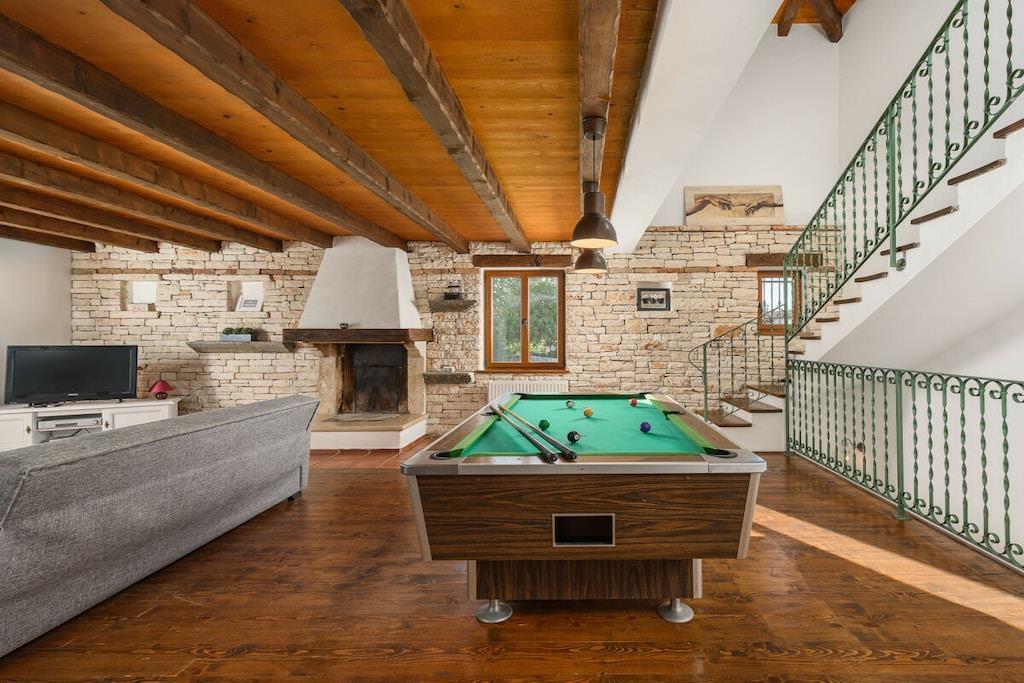 Charmerende Villa Marijanin Vrt med pool og smuk have i hjertet af Istrien, Ribari, Tinjan. Villa Marijanin Vrt er en traditionel istrisk villa med pool og en meget stor have. Den består af tre soveværelser, hver med aircondition, hvoraf to har eget badeværelse og et separat badeværelse på første sal. Stueetagen har et rummeligt, fuldt udstyret køkken, en stor spise- og opholdsstue, et opbevaringsrum og et toilet. Der er også aircondition i opholdsstuen. Sovesofaen i opholdsstuen har plads til to ekstra personer. Opholdsstuen har et poolbord, og kælderen har et fitnessrum. Opholds- og spisestueområderne åbner ud til en overdækket terrasse med et stort bord og stole, en grill og en have. Terrassen har udsigt over poolen, legepladsen og det overdækkede udendørskøkken med en anden større grill, bord og stole. Der er en overdækket parkeringsplads.