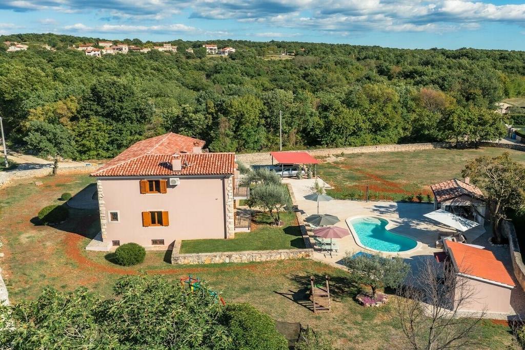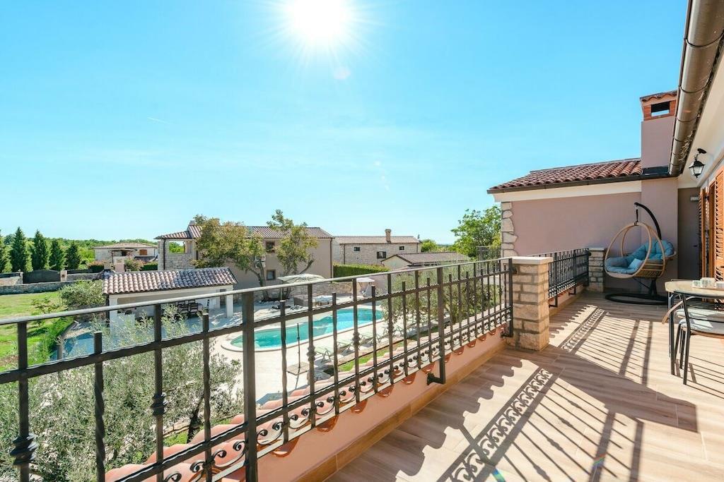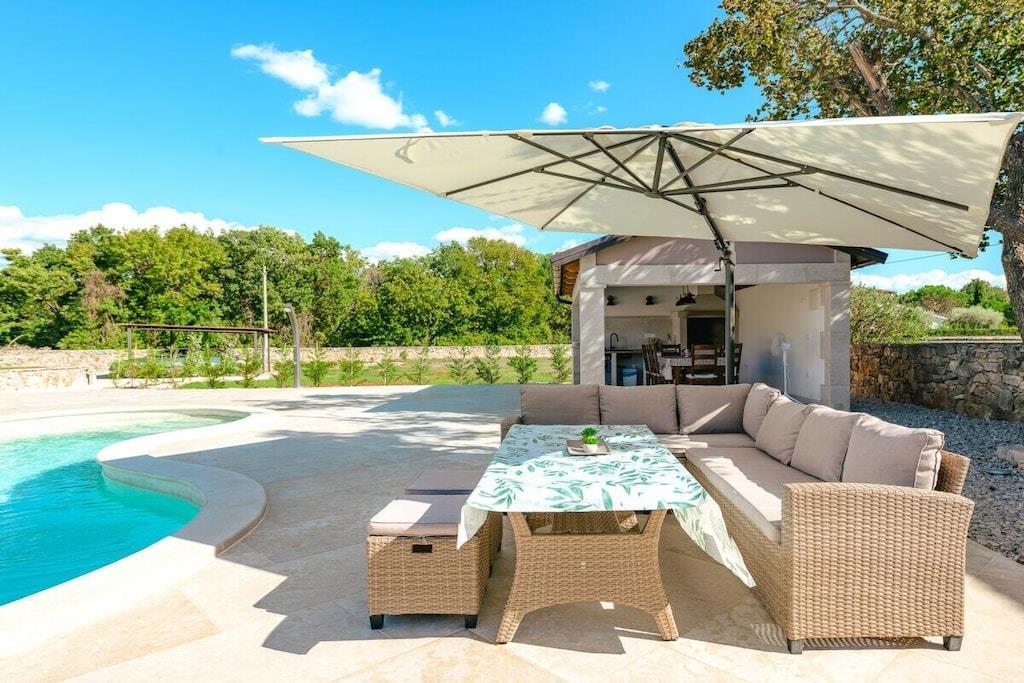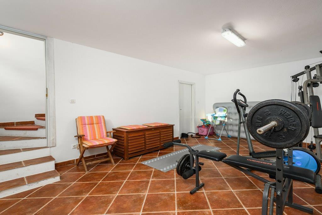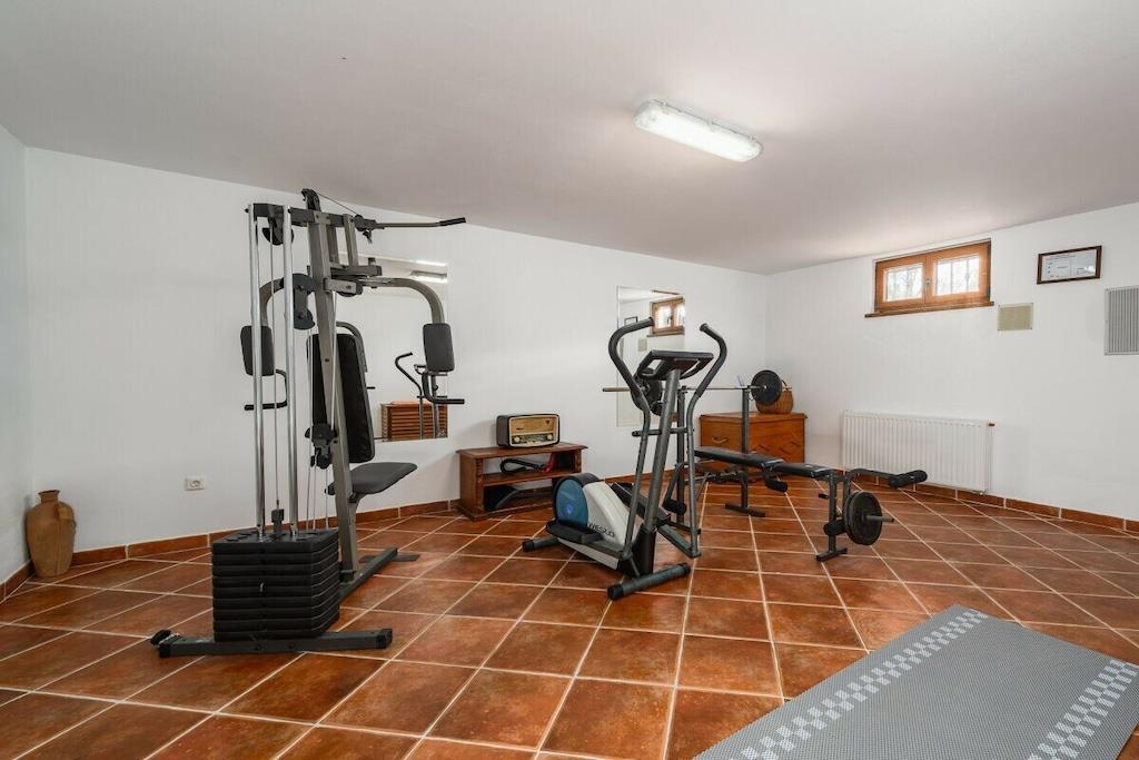 Charmerende Villa Marijanin Vrt med pool og smuk have i hjertet af Istrien, Ribari, Tinjan. Villa Marijanin Vrt er en traditionel istrisk villa med pool og en meget stor have. Den består af tre soveværelser, hver med aircondition, hvoraf to har eget badeværelse og et separat badeværelse på første sal. Stueetagen har et rummeligt, fuldt udstyret køkken, en stor spise- og opholdsstue, et opbevaringsrum og et toilet. Der er også aircondition i opholdsstuen. Sovesofaen i opholdsstuen har plads til to ekstra personer. Opholdsstuen har et poolbord, og kælderen har et fitnessrum. Opholds- og spisestueområderne åbner ud til en overdækket terrasse med et stort bord og stole, en grill og en have. Terrassen har udsigt over poolen, legepladsen og det overdækkede udendørskøkken med en anden større grill, bord og stole. Der er en overdækket parkeringsplads.