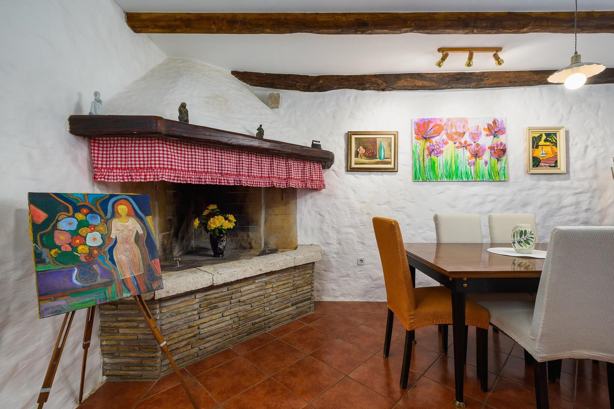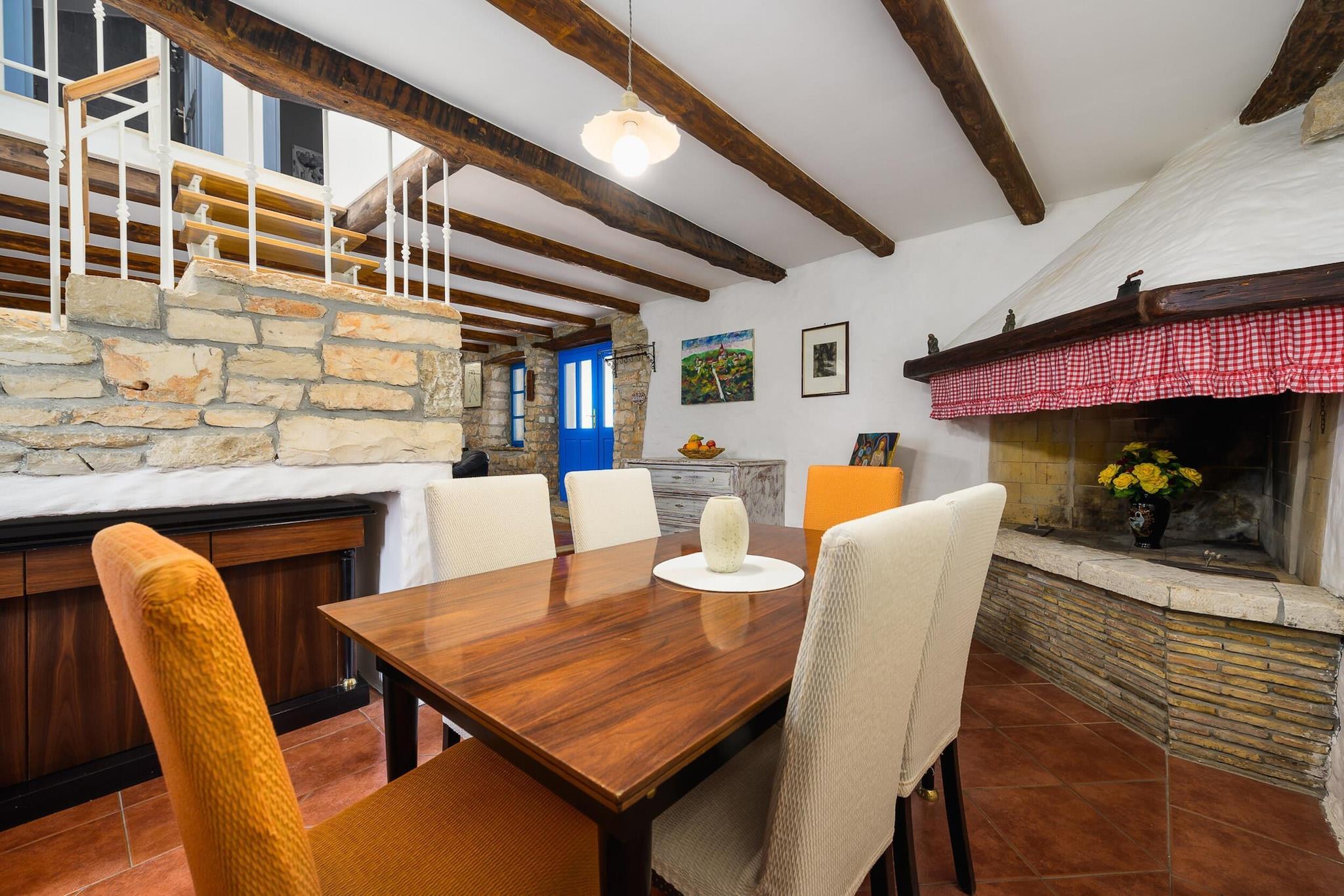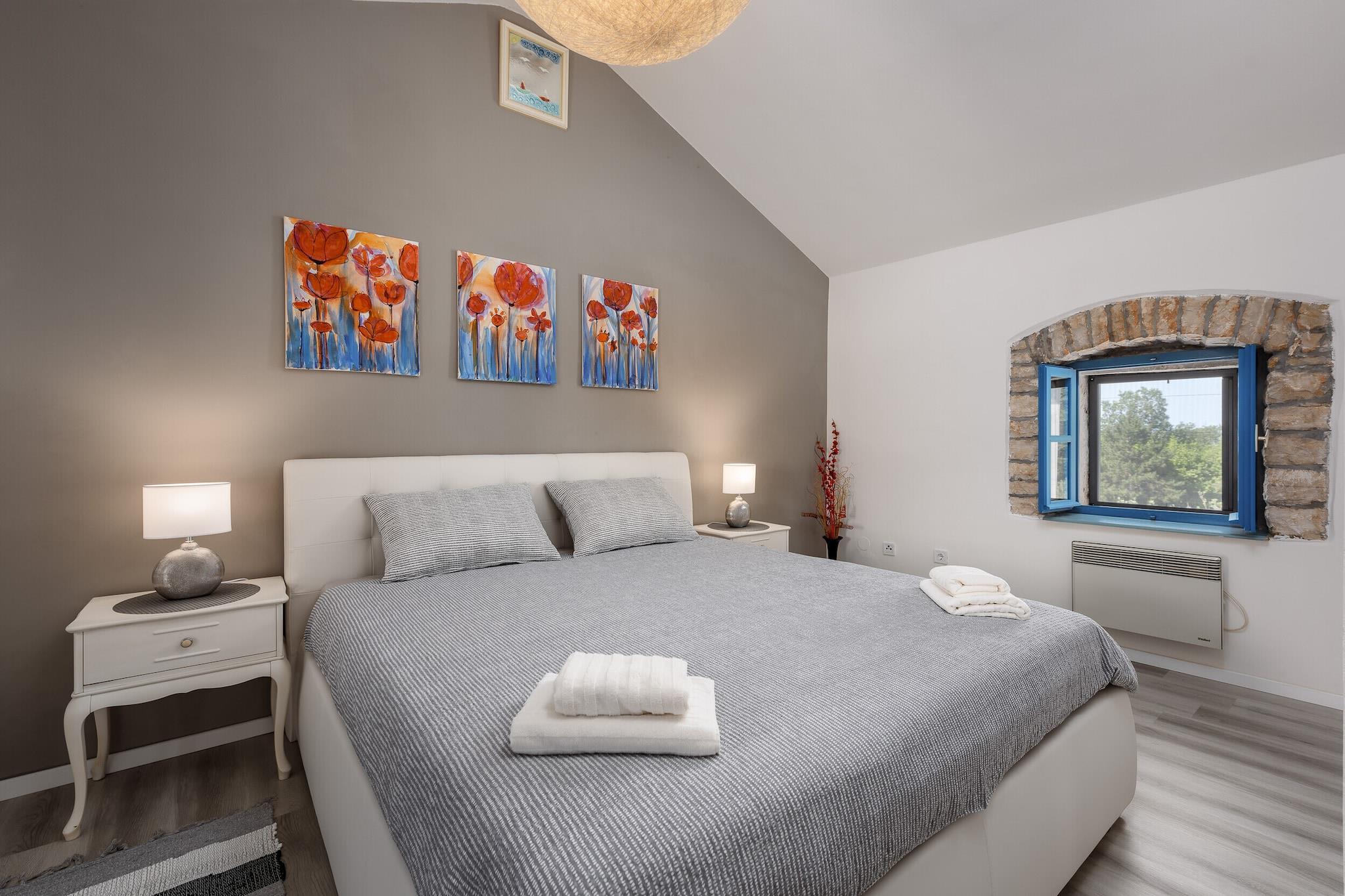 Villaen, sammen med dens rummelige og velindrettede interiør, tilbyder et komfortabelt tilflugtssted for op til 4 gæster og har to soveværelser. Opholdsområdet omfatter en hyggelig sofa og en balkon, perfekt til at nyde udendørs udsigt. Det er en kæledyrsvenlig ejendom, som giver gæsterne mulighed for at tage deres kæledyr med for et mindeværdigt ophold. For ekstra bekvemmelighed kan yderligere genstande såsom cykler, barnesenge og høje stole lejes. Gæster kan også nyde gratis Wi-Fi-adgang i hele boligen, hvilket sikrer problemfri forbindelse under deres ophold. Ejendommen er strategisk placeret i et fredfyldt område, kun kort afstand fra lokale attraktioner og væsentlige tjenester. Det nærmeste supermarked ligger kun 2 km væk, mens adskillige spisesteder, herunder den berømte Restaurant Mekisi, ligger inden for en radius på 5 km. Naturelskere vil sætte pris på nærheden til floden Mirna (18 km) og den fantastiske Marea-strand (17 km), perfekt til en dag med afslapning ved havet. For nem adgang til transport er den nærmeste busstation 17 km væk, og Porec Station ligger 19 km fra ejendommen. Pula Lufthavn, 44 km væk, tilbyder praktiske rejsemuligheder for dem, der flyver ind. Køkkenet er fuldt udstyret med moderne apparater, herunder en glaskeramisk kogeplade, køleskab, ovn og opvaskemaskine, hvilket gør det nemt for gæsterne at tilberede deres egne måltider. Villaen har også yderligere bekvemmeligheder såsom pejs, vaskemaskine og aircondition i hele huset. Udendørsrummet er komplet med en 15 m² stor terrasse, have og grill, hvilket skaber en perfekt ramme for udendørs spisning eller afslapning i privatlivet.