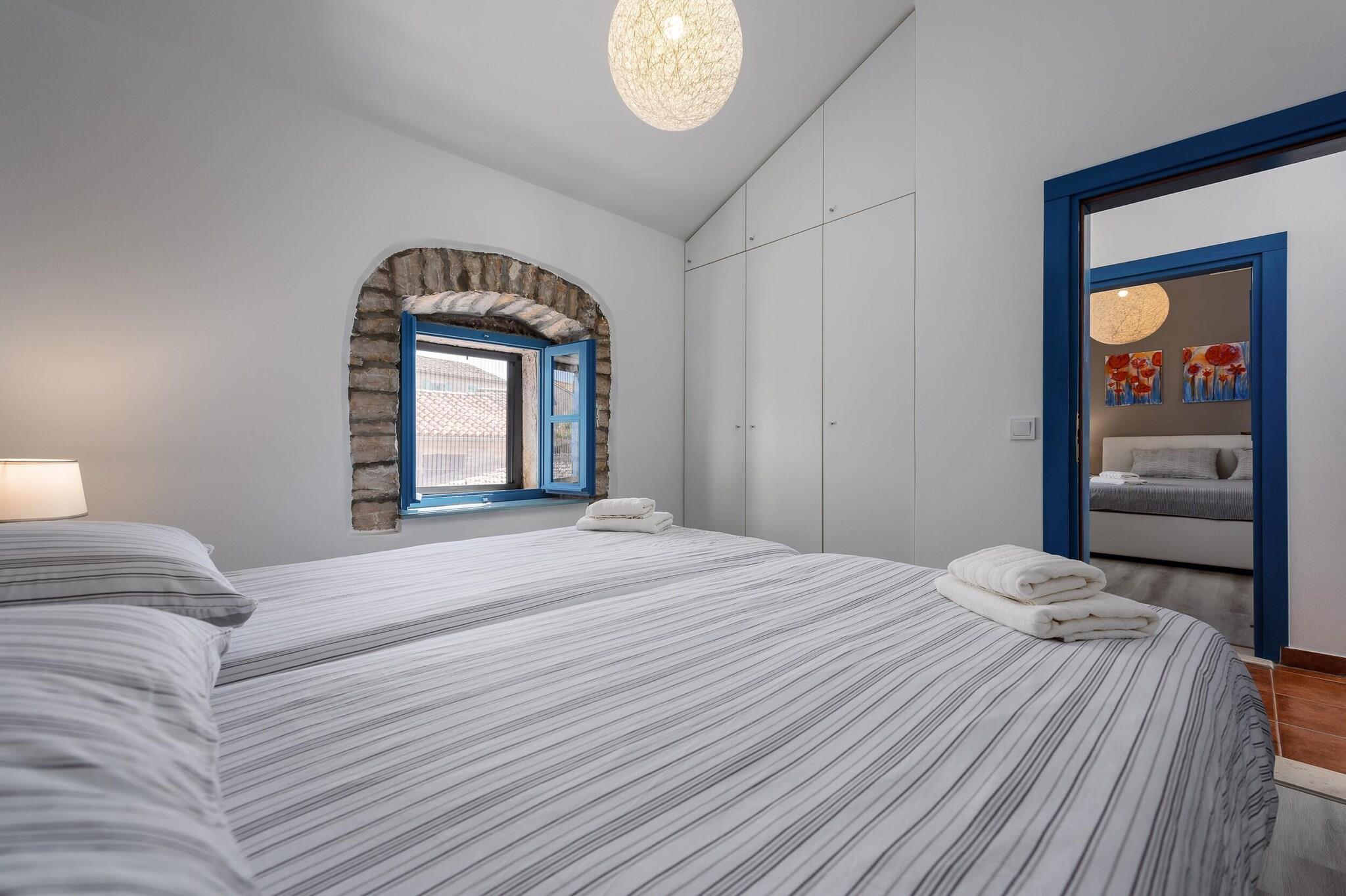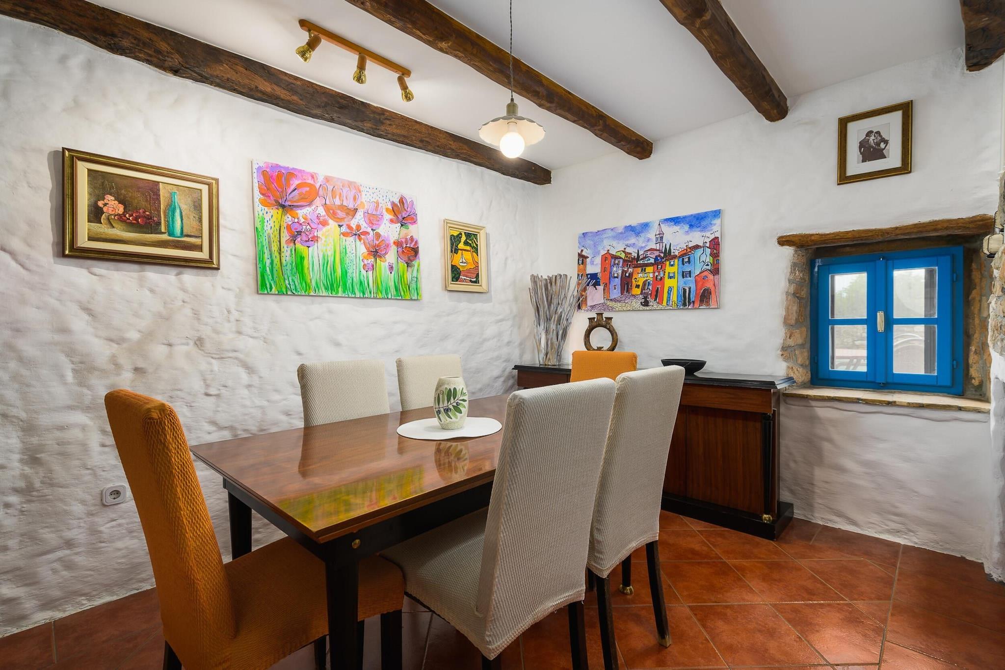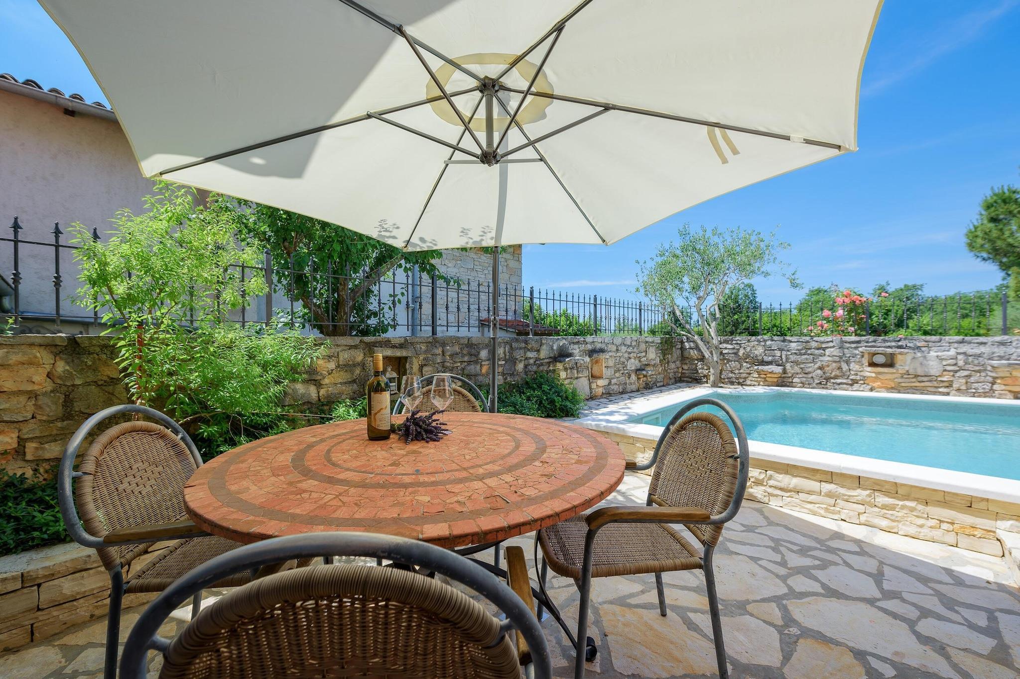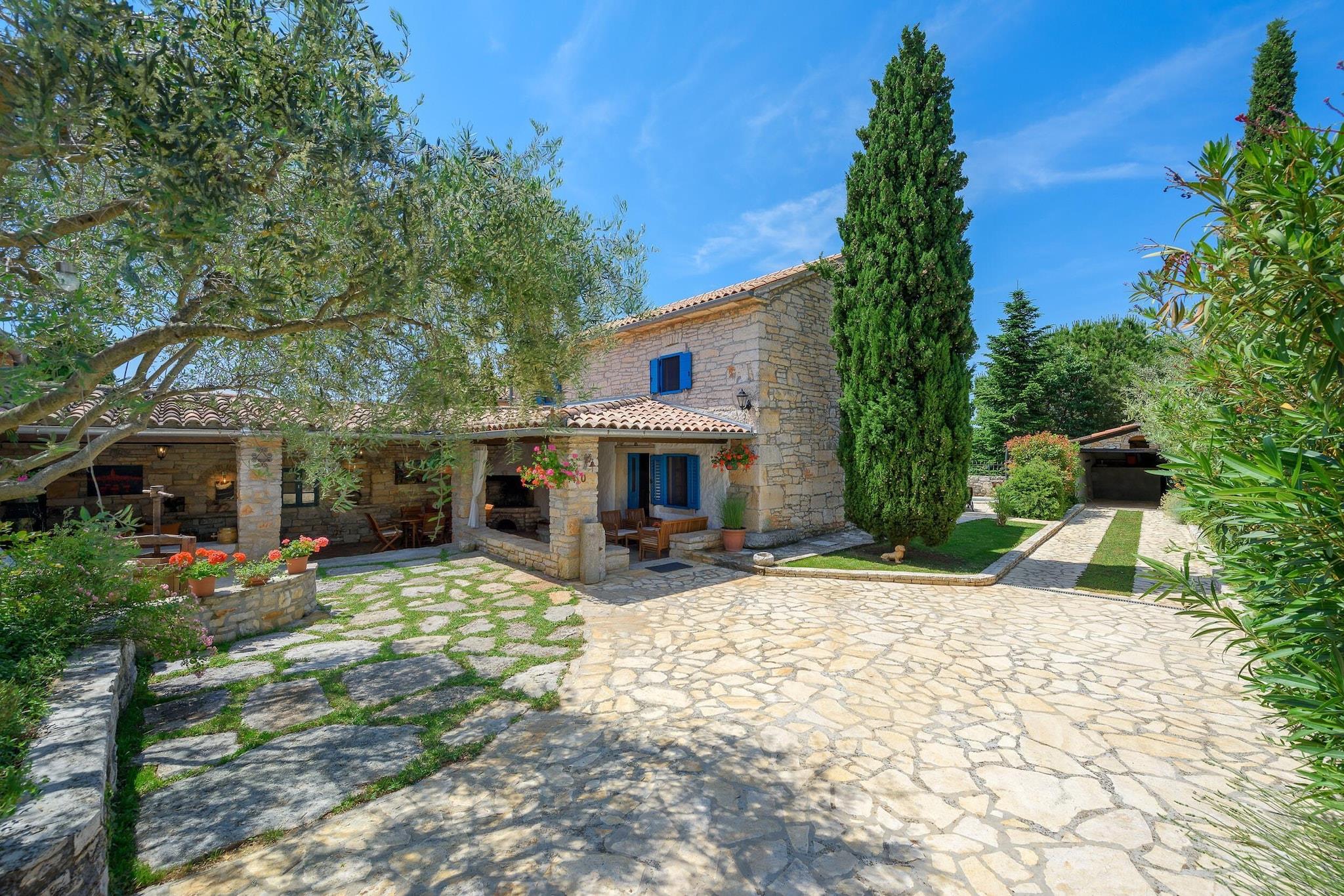 Villaen, sammen med dens rummelige og velindrettede interiør, tilbyder et komfortabelt tilflugtssted for op til 4 gæster og har to soveværelser. Opholdsområdet omfatter en hyggelig sofa og en balkon, perfekt til at nyde udendørs udsigt. Det er en kæledyrsvenlig ejendom, som giver gæsterne mulighed for at tage deres kæledyr med for et mindeværdigt ophold. For ekstra bekvemmelighed kan yderligere genstande såsom cykler, barnesenge og høje stole lejes. Gæster kan også nyde gratis Wi-Fi-adgang i hele boligen, hvilket sikrer problemfri forbindelse under deres ophold. Ejendommen er strategisk placeret i et fredfyldt område, kun kort afstand fra lokale attraktioner og væsentlige tjenester. Det nærmeste supermarked ligger kun 2 km væk, mens adskillige spisesteder, herunder den berømte Restaurant Mekisi, ligger inden for en radius på 5 km. Naturelskere vil sætte pris på nærheden til floden Mirna (18 km) og den fantastiske Marea-strand (17 km), perfekt til en dag med afslapning ved havet. For nem adgang til transport er den nærmeste busstation 17 km væk, og Porec Station ligger 19 km fra ejendommen. Pula Lufthavn, 44 km væk, tilbyder praktiske rejsemuligheder for dem, der flyver ind. Køkkenet er fuldt udstyret med moderne apparater, herunder en glaskeramisk kogeplade, køleskab, ovn og opvaskemaskine, hvilket gør det nemt for gæsterne at tilberede deres egne måltider. Villaen har også yderligere bekvemmeligheder såsom pejs, vaskemaskine og aircondition i hele huset. Udendørsrummet er komplet med en 15 m² stor terrasse, have og grill, hvilket skaber en perfekt ramme for udendørs spisning eller afslapning i privatlivet.