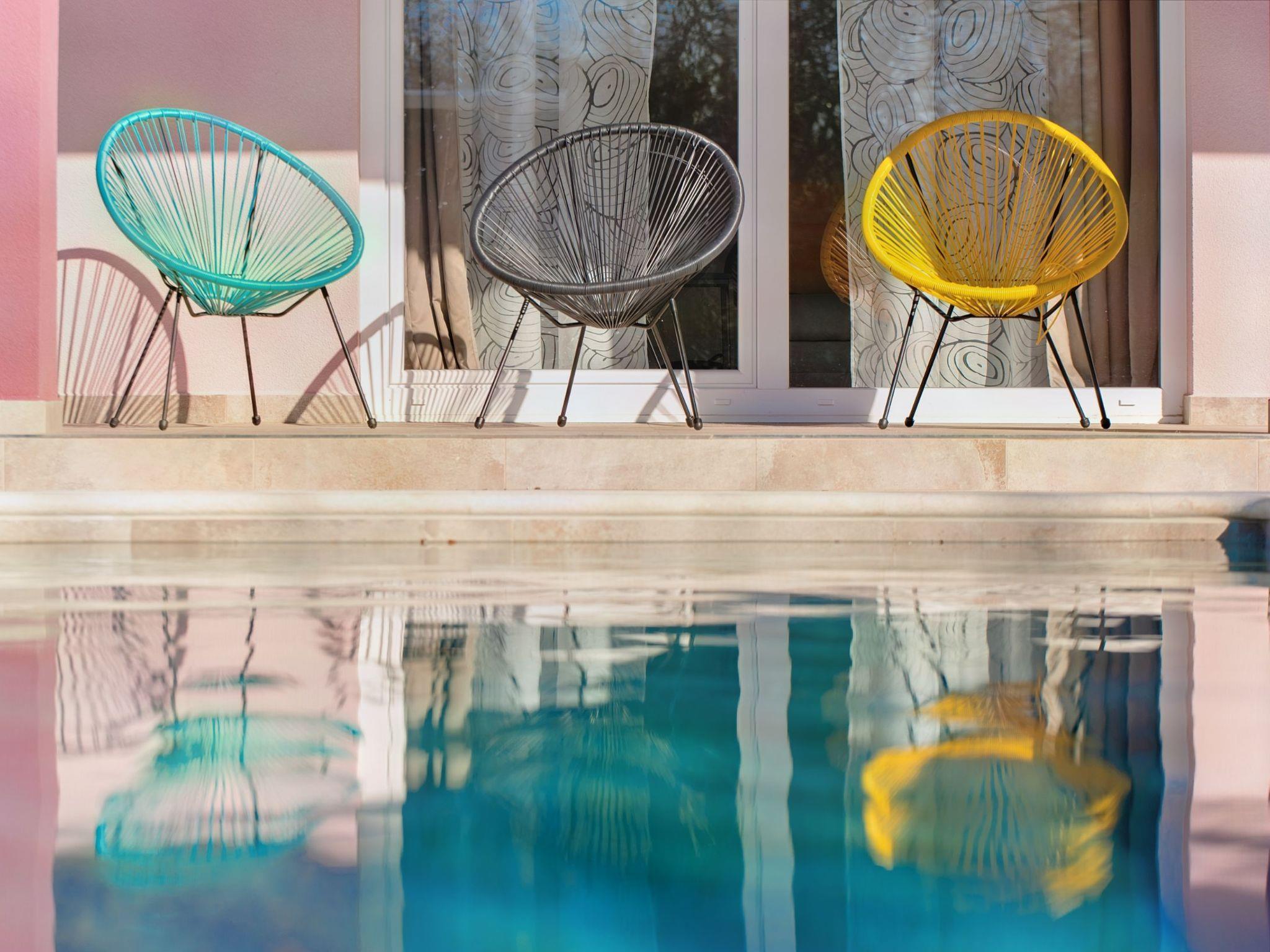 The living area leads directly to the terrace and the connected outdoor area, which has a charming pool with plenty of pool loungers and parasols and an outdoor barbecue for those cosy barbecue evenings.